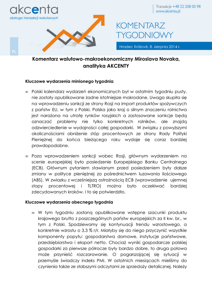 Hradec Králové, 8. sierpnia 2014 r. Komentarz walutowo-makroekonomiczny Miroslava Novaka, analityka AKCENTY Kluczowe wydarzenia minionego tygodnia • Polski kalendarz wydarzeń ekonomicznych był w ostatnim tygodniu pusty, nie zostały opublikowane żadne istotniejsze makrodane. Uwaga skupiła się na wprowadzeniu sankcji ze strony Rosji na import produktów spożywczych z państw EU, w tym z Polski. Polska jako kraj o silnym znaczeniu rolnictwa jest narażona na utratę rynków rosyjskich a zastosowane sankcje będą oznaczać problemy nie tylko konkretnych rolników, ale znajdą odzwierciedlenie w wydajności całej gospodarki. W związku z powyższymi okolicznościami obniżenie stóp procentowych ze strony Rady Polityki Pieniężnej do końca bieżącego roku wydaje się coraz bardziej prawdopodobne. • Poza wprowadzeniem sankcji wobec Rosji, głównym wydarzeniem na scenie europejskiej było posiedzenie Europejskiego Banku Centralnego (ECB). Głównym pytaniem stawianym przed posiedzeniem były dalsze zmiany w polityce pieniężnej za pośrednictwem luzowania ilościowego (ABS). W zwiazku z wcześniejszą ostrożnością ECB (wprowadzenie ujemnej stopy procentowej i TLTRO) można było oczekiwać bardziej zdecydowanych kroków. I to się potwierdziło. Kluczowe wydarzenia obecnego tygodnia • W tym tygodniu zostaną opublikowane wstępne szacunki produktu krajowego brutto z poszczególnych państw europejskich za II kw. br., w tym z Polski. Spodziewamy się kontynuacji trendu wzrostowego, a konkretnie wzrostu o 3,3 % r/r. Miałyby się do niego przyczynić wszystkie komponenty popytu: gospodarstwa domowe, instytucje państwowe, przedsiębiorstwa i eksport netto. Chociaż wyniki gospodarcze polskiej gospodarki za pierwsze półrocze były bardzo dobre, to druga połowa może przynieść rozczarowanie. O pogarszającej się sytuacji w przemyśle świadczy indeks PMI. W ostatnich miesiącach mieliśmy do czynienia także ze słabszymi odczytami ze sprzedaży detalicznej. Należy wziąć także pod uwagę sankcje nałożone przez Rosję, które będą ograniczać skuteczność działań służących pobudzeniu gospodarki. Polska wciąż cierpi na bardzo niską inflację. Oczekujemy, że lipcowy wzrost r/r cen okaże się ujemny. EURUSD • Mimo że euro znalazło się wobec amerykańskiego dolara pod presją sprzedających, nie doszło do wyraźniejszych strat. Minimum wspólnej waluty był handel lekko pod poziomem 1,335 USD/EUR odzwierciedlający środowe słabsze dane z Niemiec (zamówienia w przemyśle), gorszego HDP z Włoch, konferencji prasowej po posiedzenniu ECB i lepszych danych z USA (tygodniowa ilość wniosków o zasiłek dla bezrobotnych). W piątek krótko tuz po południu notowania EURUSD przebiegały na poziomie 1,34 USD/EUR. • Prognozy dotyczące wspólnej waluty zostają negatywne, choć jest jedno „ale”. Euro osłabia się wobec dolara niemal nieprzerwanie od początku czerwca, co zwiększa prawdopodobieństwo krótkiej korekty tzn. niewielkiego umocnienia się euro (szacujemy, że do granicy 1,35 USD/EUR). Projekcje na najbliższy tydzień są trudne do przewidzenia, więc euro może tak tracić, jak i nieznacznie umocnić się. Bardziej czytelny jest wg nas trend długoterminowy (tygodnie i miesiące) i ten pozostaje także negatywny dla wspólnej waluty. Dywergencja polityk monetarnych pomiędzy FEDem a ECB, nieco gorsze perspektywy wzrostu unijnej gospodarki (głównie Niemiec) oraz rosnąca wrogość UE i Rosji będą stanowić silne argumenty do dalszego spadku wartości euro do poziomu 1,30 USD/EUR w dalszych miesiącach bieżącego roku. EURPLN i USDPLN • Polska waluta przez większą część minionego tygodnia ulegała przecenie w stosunku do dwóch głównych walut. Wobec euro osłabiła aż na piątkowe 4,22 PLN/EUR dostając się na najsłabsze wartości od marca tego roku. Na parze walutowej z dolarem amerykańskim złoty stracił tak wyraźnie, że spadł na lutowe minima, czyli tuż poniżej 3,16 PLN/USD. • Kierunek podążania kursu EURPLN w tym tygodniu jest jest trudny do przewidzenia. Z jednej strony obecne straty należy przypisać zdecydowanie gorszemu sentymentowi na rynkach finansowych niż odczytom z polskiej gospodarki. Jeśli dojdzie do ograniczenia awersji możemy być świadkami ponownego powrotu polskiej waluty do pasma 4,10 - 4,20 PLN/EUR. W dłuższym horyzoncie (kilku tygodni czy miesięcy) widzimy raczej przestrzeń do osłabienia złotego na poziom 4,30 PLN/EUR. Podstawą naszych projekcji jest gorsza dynamika polskiej gospodarki w drugiej połowie br. w kombinacji z dalszym łagodzeniem polityki pieniężnej ze strony RPP. Wyraźniejszym stratom ulegnie także waluta krajowa na parze z amerykańskim dolarem, w nadchodzących tygodniach spodziewamy się kontynuacji osłabienia, aż do poziomu 3,40 PLN/USD pod koniec tego roku. CEE • Waluty regionu CEE znalazły się w tym tygodniu pod znaczną presją wyprzedażową; czeska korona wraz z węgierskim forintem nie stanowiły w tym względzie wyjątku. W przypadku korony większą wagę od geopolityki grała wyprzedaż na giełdach. Przypomijmy jedynie, że Czeski Bank Narodowy pod koniec lipca przesunął termin reżimu interwencyjnego aż do 2016 r., dając tym samym sygnał, że życzy sobie słabej korony przez dłuższy czas. Osłabienie korony wobec euro aż do poziomu 28 CZK/EUR (więcej niż pięcioletnie minimum na koronie) były jednoznacznym wynikiem retoryki prowadzonej przez Czeski Bank Narodowy (ČNB). Na najsłabszych poziomach od 2,5 roku znalazł się także węgierski forint (216 HUF/EUR).