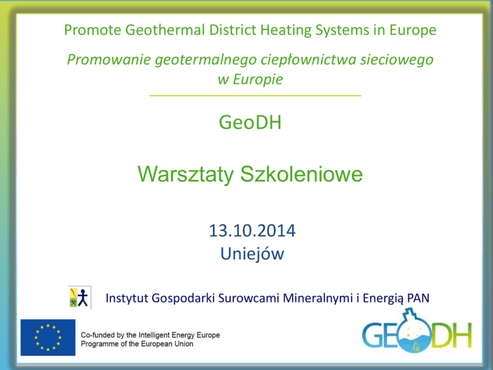 Promote Geothermal District Heating Systems in Europe Promowanie geotermalnego ciepłownictwa sieciowego w Europie GeoDH Warsztaty Szkoleniowe 13.10.2014 Uniejów Instytut Gospodarki Surowcami Mineralnymi i Energią PAN Promote Geothermal District Heating Systems in Europe Promowanie geotermalnych systemów ciepłowniczych w Europie GeoDH 1. Energia geotermalna N (część 3) Opracowanie: Christian Boissavy (Francuskie Stowarzyszenie Profesjonalistów Geotermalnych, AFPG) Koncepcje i fazy projektu geotermalnego • Koncepcje i fazy projektu Jakie są główne elementy geotermalnej sieci ciepłowniczej? 1. Otwór produkcyjny 2. Pompa głębinowa 3. Pompa zatłaczająca 4. Otwór chłonny 5. Wymiennik ciepła geotermalnego 6. Kocioł szczytowy /rezerwowy 7. Sieć ciepłownicza 8. Podstacja 9. Zbiornik wód geotermalnych (wapienie doggeru*) 10. Strefa z ochłodzoną wodą * skały zbiornikowe w basenie paryskim • Koncepcje i fazy projektu, cd. Przed rozpoczęciem budowy geoDH potrzebna jest 5-etapowa analiza służąca wstępnej ocenie wykonalności geoDH: 1. Analiza produkcji ciepła geotermalnego. Dane/Informacje dot. parametrów zasobów geotermalnych dla oceny ilości możliwego do wyprodukowania z nich ciepła. 2. Wskazanie obszarów dla budowy ciepłownictwa sieciowego (c.o.). Dla zapewnienia procedur identyfikacji potencjalnych obszarów rynku dla usług ciepłowniczych. Zapotrzebowanie na ciepło jest określane wg kilku kryteriów (przesłanek dla wyboru obszarów rynku): - gęstości zapotrzebowania na ciepło, - odległości od otworów produkcyjnych Jeśli sieć c.o. już istnieje, ten etap jest ograniczony do oceny możliwości i sposobu jej zaadaptowania/przystosowania do wprowadzenia geotermii • Koncepcje i fazy projektu, cd. Przed rozpoczęciem budowy geoDH potrzebna jest 5-etapowa analiza służąca wstępnej ocenie wykonalności geoDH: 3. Wstępny projekt grzewczej sieci c.o. dla wybranych stref w obszarze miasta. Rozważenie i wybór odpowiednich opcji inżynierskich dla zaprojektowania systemu c.o., co zależy od temperatury wody geotermalnej, jej wydajności, jakości i głębokości zalegania. 4. Analiza aspektów ekonomicznych. Oszacowanie nakładów inwestycyjnych (CAPEX), a także rocznych kosztów eksploatacji i konserwacji (OPEX), które mogą być przeliczone na jednostkowe koszty energii zarówno dla systemów c,o., jak i in. systemów ogrzewania 5. Ocena wykonalności sieci c.o. Porównanie kosztów sieci c.o. i in. ciepłownictwa / konwencjonalnego. Zaleca się przy tym stosowanie odpowiednich kryteriów oceny dla ustalenia, czy c.o. jest odpowiednią opcją w danych warunkach • Koncepcje i fazy projektu 4 główne fazy budowy geotermalnego systemu c.o. Faza/Kwartał 1 2 3 4 5 6 7 8 9 10 11 12 13 14 15 16 1a-Zasoby geotermalne i wstępne studium wykonalności geoter. c.o. 1b-Pozwolenia na poszukiwanie /rozpoznanie zasobów 1C-Szczegółowa analiza dot. wyposażenia powierzchn. i podziemnego Ryzyko kapitałowe 1d-Umowa na zakup ciepła 1e-Ekonomia i finanse 2a-Ubezpieczenie ryzyka 2b-Wiercenie 1. otworu 2c-Wiercenie 2. otworu Strefa max. ryzyka /jeśli brak jego ubezpieczenia/ 2d-Długoterminowe badania hydrogeologiczne (testy złożowe) 3a-Ciepłownia 3b-Budowa sieci 3c-Rozruch systemu 4a-Faza eksploatacji Ryzyko zadłużenia • Koncepcje i fazy projektu Ścieżka decyzyjna w realizacji geotermalnego systemu c.o. • Wstępne studium wykonalności: Wstępne: projekt sieci, umowy dot. sprzedaży ciepła, umowa dot. finansowania badań Badania wstępne Wstępne studium wykonalności (dot. części powierzchniowej i podziemnej systemu c.o.) Dalej / Stop Potwierdzenie obecności zasobów geotermalnych o odpow. parametrach i istnienia odbiorców gotowych do zakupu ciepła po stałych kosztach przez odpowiednio długi czas przewyższający okres zwrotu zaciągniętych pożyczek / kredytów • Rozpoznanie zasobów geotermalnych, studium wykonalności: Szczegółowe badania, w tym geofizyczne (o ile możliwe), pozwolenia/koncesje na wiercenie dubletu otworów Starania/negocjacje ws. uzyskania środków na sfinansowanie wiercenia otworów + testy układu geotermalnego Ocena projektu pod wzgl. ekonomicznym i strategii finansowania Dalej / Stop Potwierdzenie potencjału/zasobów wód geotermalnych (głębokości, temperatury, wydajności), wykonane ubezpieczenie ryzyka, ustalone szczegóły finansowe • Koncepcje i fazy projektu Krzywe sukcesu: francuski system ubezpieczeń Wydajność wody geot. Pełny sukces Częściowy sukces /porażka/ Całkowita porażka Temperatura • Koncepcja i fazy projektu Ścieżka decyzyjna w realizacji geotermalnego systemu c.o. • Wiercenie otworów: Wiercenie pierwszego otworu (najlepiej pionowego) Dalej / Stop Projekt jest zatrzymany, jeśli wynik pierwszego otworu wyrażony przez wskaźnik „temperatura/wydajność” plasuje się poniżej krzywej sukcesu, która jest dołączona do umowy ubezpieczenia • Wiercenie drugiego otworu i testy / próby obiegu/systemu geotermalnego: Dalej / Stop Projekt może być zatrzymany w tej fazie, jeśli wydajność/chłonność drugiego otworu jest dużo niższa od zakładanej lub też nie uda się zatłoczyć do niego całkowitej ilości wydobywanej wody • Koncepcje i fazy projektu Ścieżka decyzyjna w realizacji geotermalnego systemu c.o. • Budowa sieci ciepłowniczej: Wyposażenie obiegu geotermalnego (pompa głębinowa, pompa do zatłaczania, falowniki, instalacja wymiennika ciepła, obróbki chemicznej – jeśli będzie), monitorowania i testowania obiegu geotermalnego Budowa sieci rurociągów lub przystosowanie istniejącej sieci Budowa ciepłowni (możliwie jak najbliżej otworów / wiertni) • Rozruch / uruchomienie całej instalacji: Pierwszy rok pracy – szczegółowe pomiary parametrów obiegu geotermalnego (poziom wody w otworach, ciśnienie głowicowe, temperatury, wydajności, skład i param. fizykochemiczne wody, zużycie en. elektr. do napędu pomp, itp.) Pierwszy 