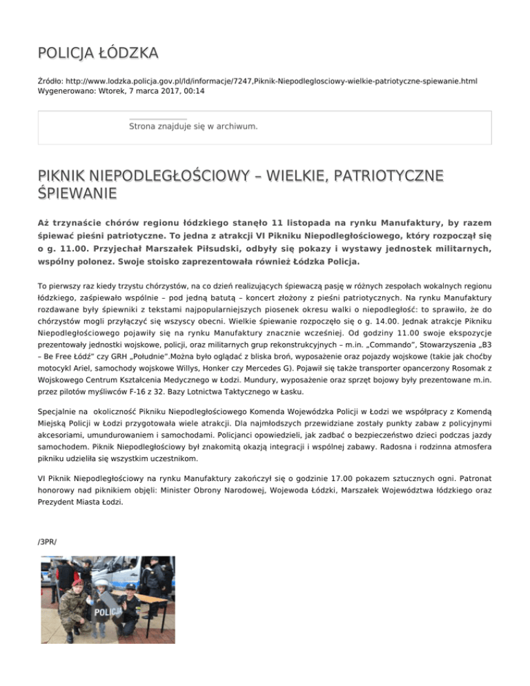POLICJA ŁÓDZKA Źródło: http://www.lodzka.policja.gov.pl/ld/informacje/7247,Piknik-Niepodleglosciowy-wielkie-patriotyczne-spiewanie.html Wygenerowano: Wtorek, 7 marca 2017, 00:14 Strona znajduje się w archiwum. PIKNIK NIEPODLEGŁOŚCIOWY – WIELKIE, PATRIOTYCZNE ŚPIEWANIE Aż trzynaście chórów regionu łódzkiego stanęło 11 listopada na rynku Manufaktury, by razem śpiewać pieśni patriotyczne. To jedna z atrakcji VI Pikniku Niepodległościowego, który rozpoczął się o g. 11.00. Przyjechał Marszałek Piłsudski, odbyły się pokazy i wystawy jednostek militarnych, wspólny polonez. Swoje stoisko zaprezentowała również Łódzka Policja. To pierwszy raz kiedy trzystu chórzystów, na co dzień realizujących śpiewaczą pasję w różnych zespołach wokalnych regionu łódzkiego, zaśpiewało wspólnie – pod jedną batutą – koncert złożony z pieśni patriotycznych. Na rynku Manufaktury rozdawane były śpiewniki z tekstami najpopularniejszych piosenek okresu walki o niepodległość: to sprawiło, że do chórzystów mogli przyłączyć się wszyscy obecni. Wielkie śpiewanie rozpoczęło się o g. 14.00. Jednak atrakcje Pikniku Niepodległościowego pojawiły się na rynku Manufaktury znacznie wcześniej. Od godziny 11.00 swoje ekspozycje prezentowały jednostki wojskowe, policji, oraz militarnych grup rekonstrukcyjnych – m.in. „Commando”, Stowarzyszenia „B3 – Be Free Łódź” czy GRH „Południe”.Można było oglądać z bliska broń, wyposażenie oraz pojazdy wojskowe (takie jak choćby motocykl Ariel, samochody wojskowe Willys, Honker czy Mercedes G). Pojawił się także transporter opancerzony Rosomak z Wojskowego Centrum Kształcenia Medycznego w Łodzi. Mundury, wyposażenie oraz sprzęt bojowy były prezentowane m.in. przez pilotów myśliwców F-16 z 32. Bazy Lotnictwa Taktycznego w Łasku. Specjalnie na okoliczność Pikniku Niepodległościowego Komenda Wojewódzka Policji w Łodzi we współpracy z Komendą Miejską Policji w Łodzi przygotowała wiele atrakcji. Dla najmłodszych przewidziane zostały punkty zabaw z policyjnymi akcesoriami, umundurowaniem i samochodami. Policjanci opowiedzieli, jak zadbać o bezpieczeństwo dzieci podczas jazdy samochodem. Piknik Niepodległościowy był znakomitą okazją integracji i wspólnej zabawy. Radosna i rodzinna atmosfera pikniku udzieliła się wszystkim uczestnikom. VI Piknik Niepodległościowy na rynku Manufaktury zakończył się o godzinie 17.00 pokazem sztucznych ogni. Patronat honorowy nad piknikiem objęli: Minister Obrony Narodowej, Wojewoda Łódzki, Marszałek Województwa łódzkiego oraz Prezydent Miasta Łodzi. /3PR/ prezentacja policyjnego radiowozu podczas pikniku niepodległosciowego prezentacja policyjnego umundurowania podczas pikniku niepodległosciowego prezentacja policyjnego umundurowania podczas pikniku niepodległosciowego prezentacja policyjnego radiowozu podczas pikniku niepodległosciowego prezentacja policyjnego radiowozu podczas pikniku niepodległosciowego stoisko policyjne podczas święta niepodległościowego Ocena: 0/5 (0) Tweetnij Piknik Niepodległościowy