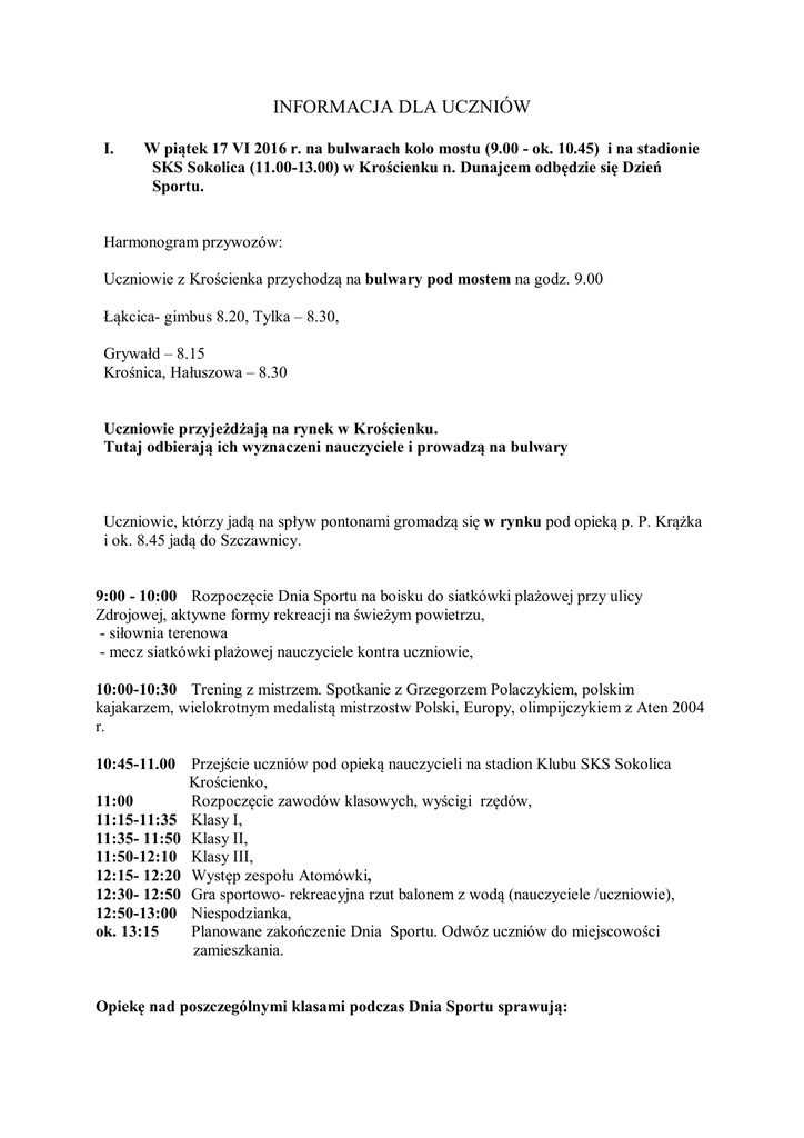 INFORMACJA DLA UCZNIÓW I. W piątek 17 VI 2016 r. na bulwarach koło mostu (9.00 - ok. 10.45) i na stadionie SKS Sokolica (11.00-13.00) w Krościenku n. Dunajcem odbędzie się Dzień Sportu. Harmonogram przywozów: Uczniowie z Krościenka przychodzą na bulwary pod mostem na godz. 9.00 Łąkcica- gimbus 8.20, Tylka – 8.30, Grywałd – 8.15 Krośnica, Hałuszowa – 8.30 Uczniowie przyjeżdżają na rynek w Krościenku. Tutaj odbierają ich wyznaczeni nauczyciele i prowadzą na bulwary Uczniowie, którzy jadą na spływ pontonami gromadzą się w rynku pod opieką p. P. Krążka i ok. 8.45 jadą do Szczawnicy. 9:00 - 10:00 Rozpoczęcie Dnia Sportu na boisku do siatkówki plażowej przy ulicy Zdrojowej, aktywne formy rekreacji na świeżym powietrzu, - siłownia terenowa - mecz siatkówki plażowej nauczyciele kontra uczniowie, 10:00-10:30 Trening z mistrzem. Spotkanie z Grzegorzem Polaczykiem, polskim kajakarzem, wielokrotnym medalistą mistrzostw Polski, Europy, olimpijczykiem z Aten 2004 r. 10:45-11.00 Przejście uczniów pod opieką nauczycieli na stadion Klubu SKS Sokolica Krościenko, 11:00 Rozpoczęcie zawodów klasowych, wyścigi rzędów, 11:15-11:35 Klasy I, 11:35- 11:50 Klasy II, 11:50-12:10 Klasy III, 12:15- 12:20 Występ zespołu Atomówki, 12:30- 12:50 Gra sportowo- rekreacyjna rzut balonem z wodą (nauczyciele /uczniowie), 12:50-13:00 Niespodzianka, ok. 13:15 Planowane zakończenie Dnia Sportu. Odwóz uczniów do miejscowości zamieszkania. Opiekę nad poszczególnymi klasami podczas Dnia Sportu sprawują: Ia – J. Ciesielka Ib - A. Bieryt Ic – B. Chlebek IIa – J. Klimek IIb – B. Haś IIc – A. Biel IIIa – M. Regiec IIIb – M. Kurpiel IIIc – A. Adamczyk Uczniowie przychodzą w strojach sportowych i zabierają kanapki oraz napoje.