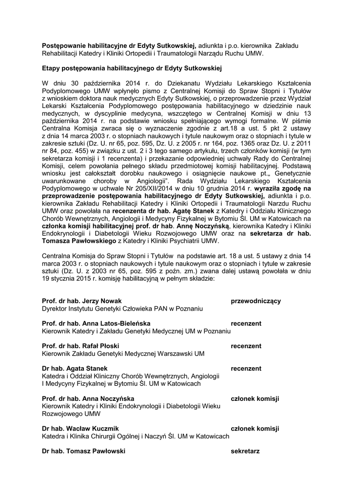 Postępowanie habilitacyjne dr Edyty Sutkowskiej, adiunkta i p.o. kierownika Zakładu Rehabilitacji Katedry i Kliniki Ortopedii i Traumatologii Narządu Ruchu UMW. Etapy postępowania habilitacyjnego dr Edyty Sutkowskiej W dniu 30 października 2014 r. do Dziekanatu Wydziału Lekarskiego Kształcenia Podyplomowego UMW wpłynęło pismo z Centralnej Komisji do Spraw Stopni i Tytułów z wnioskiem doktora nauk medycznych Edyty Sutkowskiej, o przeprowadzenie przez Wydział Lekarski Kształcenia Podyplomowego postępowania habilitacyjnego w dziedzinie nauk medycznych, w dyscyplinie medycyna, wszczętego w Centralnej Komisji w dniu 13 października 2014 r. na podstawie wniosku spełniającego wymogi formalne. W piśmie Centralna Komisja zwraca się o wyznaczenie zgodnie z art.18 a ust. 5 pkt 2 ustawy z dnia 14 marca 2003 r. o stopniach naukowych i tytule naukowym oraz o stopniach i tytule w zakresie sztuki (Dz. U. nr 65, poz. 595, Dz. U. z 2005 r. nr 164, poz. 1365 oraz Dz. U. z 2011 nr 84, poz. 455) w związku z ust. 2 i 3 tego samego artykułu, trzech członków komisji (w tym sekretarza komisji i 1 recenzenta) i przekazanie odpowiedniej uchwały Rady do Centralnej Komisji, celem powołania pełnego składu przedmiotowej komisji habilitacyjnej. Podstawą wniosku jest całokształt dorobku naukowego i osiągnięcie naukowe pt.„ Genetycznie uwarunkowane choroby w Angiologii”. Rada Wydziału Lekarskiego Kształcenia Podyplomowego w uchwale Nr 205/XII/2014 w dniu 10 grudnia 2014 r. wyraziła zgodę na przeprowadzenie postępowania habilitacyjnego dr Edyty Sutkowskiej, adiunkta i p.o. kierownika Zakładu Rehabilitacji Katedry i Kliniki Ortopedii i Traumatologii Narzdu Ruchu UMW oraz powołała na recenzenta dr hab. Agatę Stanek z Katedry i Oddziału Klinicznego Chorób Wewnętrznych, Angiologii i Medycyny Fizykalnej w Bytomiu Śl. UM w Katowicach na członka komisji habilitacyjnej prof. dr hab. Annę Noczyńską, kierownika Katedry i Kliniki Endokrynologii i Diabetologii Wieku Rozwojowego UMW oraz na sekretarza dr hab. Tomasza Pawłowskiego z Katedry i Kliniki Psychiatrii UMW. Centralna Komisja do Spraw Stopni i Tytułów na podstawie art. 18 a ust. 5 ustawy z dnia 14 marca 2003 r. o stopniach naukowych i tytule naukowym oraz o stopniach i tytule w zakresie sztuki (Dz. U. z 2003 nr 65, poz. 595 z poźn. zm.) zwana dalej ustawą powołała w dniu 19 stycznia 2015 r. komisję habilitacyjną w pełnym składzie: Prof. dr hab. Jerzy Nowak Dyrektor Instytutu Genetyki Człowieka PAN w Poznaniu przewodniczący Prof. dr hab. Anna Latos-Bieleńska recenzent Kierownik Katedry i Zakładu Genetyki Medycznej UM w Poznaniu Prof. dr hab. Rafał Płoski Kierownik Zakładu Genetyki Medycznej Warszawski UM recenzent Dr hab. Agata Stanek Katedra i Oddział Kliniczny Chorób Wewnętrznych, Angiologii I Medycyny Fizykalnej w Bytomiu Śl. UM w Katowicach recenzent Prof. dr hab. Anna Noczyńska Kierownik Katedry i Kliniki Endokrynologii i Diabetologii Wieku Rozwojowego UMW członek komisji Dr hab. Wacław Kuczmik członek komisji Katedra i Klinika Chirurgii Ogólnej i Naczyń Śl. UM w Katowicach Dr hab. Tomasz Pawłowski sekretarz Katedra i Klinika Psychiatrii UMW Zgodnie z Ustawą o Stopniach Naukowych i Tytule Naukowym z dnia 14 marca 2003 r. o stopniach naukowych i tytule naukowym oraz o stopniach i tytule w zakresie sztuki (Dz. U. z 2003 r. Nr 65, poz. 595 z póź. zm.) harmonogram przebiegu przewodu habilitacyjnego dr Edyty Sutkowskiej jest następujący: Sporządzenie recenzji dorobku naukowego oraz osiągnięć naukowych będących podstawą wniosku o nadanie stopnia naukowego doktora habilitowanego : do 6 tygodni Sporządzenie przez komisję habilitacyjną wniosku do RW w sprawie nadania stopnia doktora habilitowanego: do 21 dni Podjęcie przez RW uchwały w sprawie nadania lub odmowy stopnia naukowego doktora habilitowanego Uchwała staje się prawomocna z chwilą jej podjęcia. do 1 miesiąca