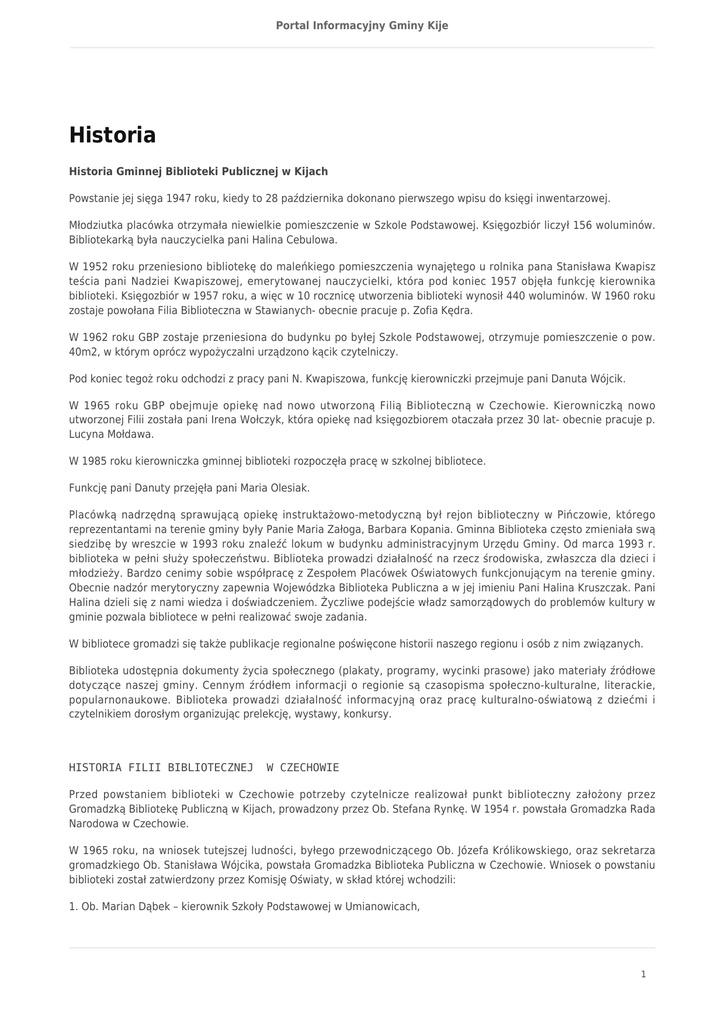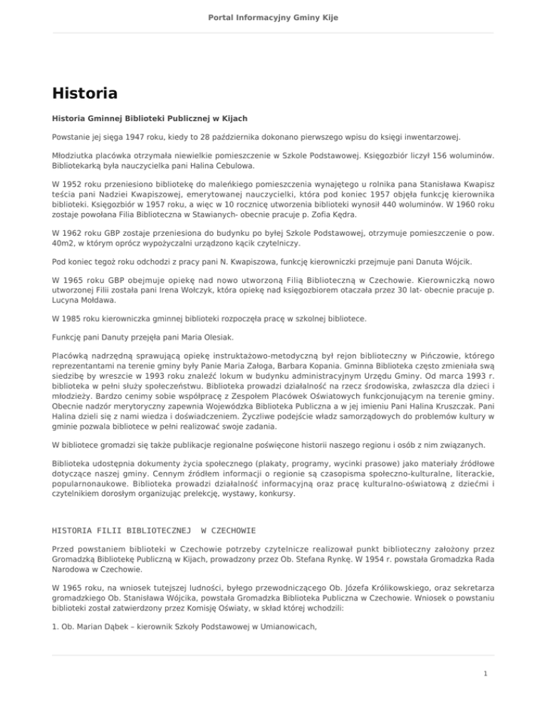 Portal Informacyjny Gminy Kije Historia Historia Gminnej Biblioteki Publicznej w Kijach Powstanie jej sięga 1947 roku, kiedy to 28 października dokonano pierwszego wpisu do księgi inwentarzowej. Młodziutka placówka otrzymała niewielkie pomieszczenie w Szkole Podstawowej. Księgozbiór liczył 156 woluminów. Bibliotekarką była nauczycielka pani Halina Cebulowa. W 1952 roku przeniesiono bibliotekę do maleńkiego pomieszczenia wynajętego u rolnika pana Stanisława Kwapisz teścia pani Nadziei Kwapiszowej, emerytowanej nauczycielki, która pod koniec 1957 objęła funkcję kierownika biblioteki. Księgozbiór w 1957 roku, a więc w 10 rocznicę utworzenia biblioteki wynosił 440 woluminów. W 1960 roku zostaje powołana Filia Biblioteczna w Stawianych- obecnie pracuje p. Zofia Kędra. W 1962 roku GBP zostaje przeniesiona do budynku po byłej Szkole Podstawowej, otrzymuje pomieszczenie o pow. 40m2, w którym oprócz wypożyczalni urządzono kącik czytelniczy. Pod koniec tegoż roku odchodzi z pracy pani N. Kwapiszowa, funkcję kierowniczki przejmuje pani Danuta Wójcik. W 1965 roku GBP obejmuje opiekę nad nowo utworzoną Filią Biblioteczną w Czechowie. Kierowniczką nowo utworzonej Filii została pani Irena Wołczyk, która opiekę nad księgozbiorem otaczała przez 30 lat- obecnie pracuje p. Lucyna Mołdawa. W 1985 roku kierowniczka gminnej biblioteki rozpoczęła pracę w szkolnej bibliotece. Funkcję pani Danuty przejęła pani Maria Olesiak. Placówką nadrzędną sprawującą opiekę instruktażowo-metodyczną był rejon biblioteczny w Pińczowie, którego reprezentantami na terenie gminy były Panie Maria Załoga, Barbara Kopania. Gminna Biblioteka często zmieniała swą siedzibę by wreszcie w 1993 roku znaleźć lokum w budynku administracyjnym Urzędu Gminy. Od marca 1993 r. biblioteka w pełni służy społeczeństwu. Biblioteka prowadzi działalność na rzecz środowiska, zwłaszcza dla dzieci i młodzieży. Bardzo cenimy sobie współpracę z Zespołem Placówek Oświatowych funkcjonującym na terenie gminy. Obecnie nadzór merytoryczny zapewnia Wojewódzka Biblioteka Publiczna a w jej imieniu Pani Halina Kruszczak. Pani Halina dzieli się z nami wiedza i doświadczeniem. Życzliwe podejście władz samorządowych do problemów kultury w gminie pozwala bibliotece w pełni realizować swoje zadania. W bibliotece gromadzi się także publikacje regionalne poświęcone historii naszego regionu i osób z nim związanych. Biblioteka udostępnia dokumenty życia społecznego (plakaty, programy, wycinki prasowe) jako materiały źródłowe dotyczące naszej gminy. Cennym źródłem informacji o regionie są czasopisma społeczno-kulturalne, literackie, popularnonaukowe. Biblioteka prowadzi działalność informacyjną oraz pracę kulturalno-oświatową z dziećmi i czytelnikiem dorosłym organizując prelekcję, wystawy, konkursy. HISTORIA FILII BIBLIOTECZNEJ W CZECHOWIE Przed powstaniem biblioteki w Czechowie potrzeby czytelnicze realizował punkt biblioteczny założony przez Gromadzką Bibliotekę Publiczną w Kijach, prowadzony przez Ob. Stefana Rynkę. W 1954 r. powstała Gromadzka Rada Narodowa w Czechowie. W 1965 roku, na wniosek tutejszej ludności, byłego przewodniczącego Ob. Józefa Królikowskiego, oraz sekretarza gromadzkiego Ob. Stanisława Wójcika, powstała Gromadzka Biblioteka Publiczna w Czechowie. Wniosek o powstaniu biblioteki został zatwierdzony przez Komisję Oświaty, w skład której wchodzili: 1. Ob. Marian Dąbek – kierownik Szkoły Podstawowej w Umianowicach, 1 Portal Informacyjny Gminy Kije 2. Ob. Janina Satława – nauczycielka Szkoły Podstawowej w Czechowie, 3. Ob. Maria Stachurek – sklepowa z Umianowic. Na stanowisko kierownika biblioteki od dnia 1 kwietnia 1965 roku zatrudniono mieszkankę Czechowa, Ob. Irenę Wołczyk. Wynagrodzenie miesięczne zgodnie z umową dla kierownika biblioteki przyznano w kwocie 750 zł. Umowa o lokal dla biblioteki została zawarta z Ob. Franciszkiem Woźniakiem - mieszkańcem wsi Czechów. Księgozbiór wraz ze sprzętem przewiózł Ob. Stanisław Szczepański z Powiatowej Biblioteki Publicznej w Pińczowie. Przed przystąpieniem do pracy kierowniczka biblioteki odbyła tygodniowe szkolenie z zakresu pracy w bibliotece, prowadzone przez instruktora PiMBP, w Pińczowie, Ob. Elżbietę Duraczyńską. Wypożyczenia i działalność kulturalną biblioteka rozpoczęła od 1 maja 1965 r. Księgozbiór wówczas liczył 320 książek. Kiedy księgozbiór liczył 750 książek, postanowiono założyć punkty biblioteczne we wsiach Umianowice, Hajdaszek, Janów. Mieszkańcy chętnie odwiedzali bibliotekę oraz chętnie korzystali z księgozbioru, jakim dysponowała placówka. W każdym kwartale księgozbiór wzrastał o 150 książek. Przeprowadzono różne formy pracy z czytelnikiem. Organizowano dyskusje nad książką, pogadanki na temat przeczytanych książek i inne. W 1968 r. odbyło się otwarcie Wiejskiego Domu Kultury w Czechowie, w którym wydzielono miejsce dla biblioteki. W otwarciu placówki wzięły udział władze wojewódzkie, powiatowe i gminne oraz społeczeństwo wsi. Na przebieg uroczystej imprezy złożyły się między innymi wstępy zespołu Powiatowego Domu Kultury w Pińczowie. Pani Irena Wołczyk w Bibliotece Publicznej w Czechowie pracowała do 1990 r. Bardzo duży wkład jej pracy jest widoczny nie tylko w dokumentacji bibliotecznej. Jej praca z czytelnikiem pozostała w pamięci pokoleń, z którymi przyszło jej się zetknąć w latach swojej pracy. Z początkiem roku 1990 ma krótko pracę w tutejszej bibliotece podejmuje Pani Krystyna Łata, zamieszkała w Stawianach, która jednocześnie prowadzi Filię w Stawianach. Z powodu spraw rodzinnych pani Krystyna zmieniła miejsce zamieszkania i 1.X.1990 r. odeszła z pracy. Z tą datą pracę w bibliotece rozpoczęła pani Lucyna Mołdawa zamieszkała w Czechowie. Biblioteka funkcjonuje do chwili obecnej, i zawiera 6373 księgozbioró