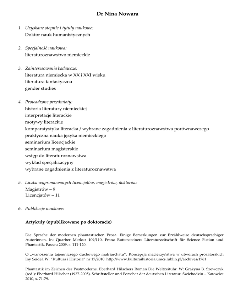 Dr Nina Nowara 1. Uzyskane stopnie i tytuły naukowe: Doktor nauk humanistycznych 2. Specjalność naukowa: literaturoznawstwo niemieckie 3. Zainteresowania badawcze: literatura niemiecka w XX i XXI wieku literatura fantastyczna gender studies 4. Prowadzone przedmioty: historia literatury niemieckiej interpretacje literackie motywy literackie komparatystyka literacka / wybrane zagadnienia z literaturoznawstwa porównawczego praktyczna nauka języka niemieckiego seminarium licencjackie seminarium magisterskie wstęp do literaturoznawstwa wykład specjalizacyjny wybrane zagadnienia z literaturoznawstwa 5. Liczba wypromowanych licencjatów, magistrów, doktorów: Magistrów – 9 Licencjatów – 11 6. Publikacje naukowe: Artykuły (opublikowane po doktoracie) Die Sprache der modernen phantastischen Prosa. Einige Bemerkungen zur Erzählweise deutschsprachiger Autorinnen. In: Quarber Merkur 109/110. Franz Rottensteiners Literaturzeitschrift für Science Fiction und Phantastik. Passau 2009. s. 111-120. O „wznoszeniu tajemniczego duchowego matriarchatu”. Koncepcja macierzyństwa w utworach prozatorskich Iny Seidel. W: “Kultura i Historia” nr 17/2010. http://www.kulturaihistoria.umcs.lublin.pl/archives/1761 Phantastik im Zeichen der Postmoderne. Eberhard Hilschers Roman Die Weltzeituhr. W: Grażyna B. Szewczyk (red.): Eberhard Hilscher (1927-2005). Schriftsteller und Forscher der deutschen Literatur. Świebodzin – Katowice 2010, s. 71-79. Krzysztof Kuczyńskis schlesische Studien. W: Zdzisław Wąsik / Peter Chmiel (red.): Schlesien in der germanistischen Forschung und Lehre. Wrocław 2010, s. 95-106. Podwajająca się płeć. Dyskurs kobiecości w opowiadaniach Marie Luise Kaschnitz. W: Zeszyty NaukowoDydaktyczne NKJO Zabrze. Zabrze 2010, s. 175-185. Postać Wojciecha Korfantego w prozie Horsta Bienka. W: Grażyna Barbara Szewczyk /Jan Malicki (red.): Horst Bienek. Ślązak i Europejczyk. Katowice 2011. s. 21-33. „Sie hat ihm die Seele ausgetrunken“. Zum Vampirmotiv in Theodor Storms Novelle Draußen im Heidedorf. W: Ewa Jurczyk (red.): Der Mensch und sein Universum. Zabrze 2011, s. 83-91 (= Zeszyty Naukowo-Dydaktyczne NKJO Zabrze) Vampirische Verführerinnen in Eichendorffs Lyrik W: Rocznik Łubowicki 9/2011 (Lubowitzer Jahrbuch), s. 57-66. Zwischen Sein und Schein. Die Ambiguität des Phantastischen in den Erzähltexten von Eddie M. Angerhuber, w: Ewa Jurczyk, Alina Jackiewicz (red.): Dialog der Sprachen, Dialog der Kulturen. Zabrze 2011, S. 150-160. (=Zeszyty Naukowo-Dydaktyczne NKJO). Über „die Aufrichtung eines geheimnisvollen Matriarchates.“ Das Mütterlichkeitskonzept im Prosawerk Ina Seidels. W: „Orbis Linguarum” vol. 37, Wrocław 2011, s. 141-152. Das feministische Frauenbild in der Science Fiction von Barbara Neuwirth. W: Heidi Beutin, Wolfgang Beutin, Heinrich Bleicher-Nagelsmann, Herbert Schmidt, Claudia Wörmann-Adam (red.): „Frauen sind dazu berufen, Utopien bewohnbar zu machen“. Frauenbilder in Kunst und Literatur. Mössingen-Talheim 2012, s. 142-156. Wasserwesen in polnischen und deutschen Sagen Oberschlesiens. Eine komparatistische Annäherung. W: Hannelore Scholz-Lübbering, Birgit Norden (red.): Götter, Geister, Wassernixen entlang der Oder. Ergebnisse einer Tagung in Słubice im September 2011. Leipzig 2012, s. 173-184. Świat i antyświat w krótkich formach epickich Augusta Scholtisa. W: Grażyna Barbara Szewczyk, Michał Skop (red.) August Scholtis. Śląski pisarz i publicysta. Twórczość po 1945 roku. Katowice 2012, s. 39-53.