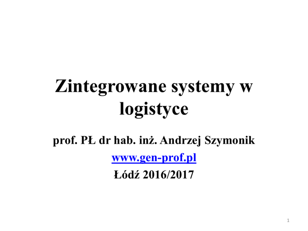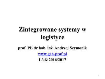 Zintegrowane systemy w logistyce prof. PŁ dr hab. inż. Andrzej Szymonik www.gen-prof.pl Łódź 2016/2017 1 Zagadnienia: 1. Istota logistycznego systemu informacyjnego 2. Charakterystyka logistycznego systemu informacji 3. Identyfikacja systemów informatycznych wykorzystywanych w zarządzaniu logistyką produkcji 2 1. Istota logistycznego systemu informacyjnego (LSI) 3 Istota LSI: • Przepływy informacyjne inicjują oraz towarzyszą przepływom dóbr materialnych oraz usług w systemie produkcyjnym. • Integracja przepływu informacji powoduje, że system logistyczny jest skuteczny, otwarty i jest w stanie pokonać bariery pojawiające się w procesach przepływu. 4 Integracji procesami przepływu informacji: • integrację systemów; • unifikację funkcji cząstkowych systemów; • dostępność do bazy danych dla wszystkich komórek organizacyjnych; • upowszechnienie sposobów wizualizacji do wspomagania analizy, procesu podejmowania decyzji i ich przekazywania. 5 Integracja elementów wewnątrz: • strukturę zarządzania firmy; • zatrudniony personel wykonawczy i zarządzający; • umiejętność doskonalenia i uczenia się całej organizacji; • prowadzone prace badawcze i rozwojowe; • stopień wykorzystania nowych technologii; • umiejętność zarządzania zaufaniem w biznesie (w tym wirtualnym); 6 cd. integracja elementów wewnątrz: • organizację zbytu i innej działalności handlowej; • wykorzystywane środki marketingu; • organizację zaopatrzenia i gospodarki materiałowej; • posiadane środki finansowe firmy oraz szybkość ich rotacji; • służby ekonomiczne i księgowe; • metody i formy zarządzania systemami produkcyjnymi. 7 Integracja elementów zewnętrznych: • poziom techniki, dystrybucji i obsługi serwisowej; • dostępność usług Internetowych; • poziom nowoczesności i jakości oraz cena maszyn i urządzeń produkcyjnych; • poziom nowoczesności środków przetwarzania i przekazywania informacji; 8 cd. integracja elementów zewnętrznych: • system bankowy i jego funkcjonowanie; • możliwości produkcyjne dostawców; • infrastruktura (np. drogi, telekomunikacja, kolej, lotniska); • poziom i możliwości konkurencji; • kondycja ekonomiczna kraju; 9 cd. integracja elementów zewnętrznych: • czynniki energetyczne (woda, energia elektryczna, paliwa stałe i gazowe, ciepło); • regulacje państwowe dotyczące gospodarki i ekonomiki; • środowisko społeczno-polityczne; • środowisko naturalne; • metody i formy zarządzania i sterowania produkcją przez naczelne władze. 10 2. Charakterystyka logistycznego systemu informacji 11 Korzyści wdrażania systemów informacyjnych: • synchronizacja procesów zaopatrywania, produkcji i dystrybucji; • umożliwienie produkcji na zamówienie (ssanie) - w miejsce produkcji „na magazyn” (tłoczenie); • redukcja przestojów spowodowanych brakiem materiałów do produkcji; • poprawa obsługi klientów; 12 cd. korzyści wdrażania systemów informacyjnych: • wzrost klimatu zaufania dzięki dobrej komunikacji uczestników łańcucha logistycznego; • możliwość stosowania podpisu elektronicznego, systemu ochrony i certyfikacji, standaryzacji w zakresie biznesu elektronicznego; • redukcja poziomu utrzymywanych zapasów; 13 Funkcje logistycznego systemu informacji 14 Sposoby i treści pozyskiwanych informacji: • Pierwszy – nowe otoczenie rynkowe, które jest kreowane przez dostęp do globalnej sieci za pośrednictwem infrastruktury telekomunikacyjnej. 15 cd. Sposoby i treści pozyskiwanych informacji: • Drugi – konwergencja przestrzeni rynkowej powstającej w wyniku braku geograficznej izolacji firm i gospodarek. 16 cd. Sposoby i treści pozyskiwanych informacji: • Trzeci – nowe technologie, które umożliwiają ludziom i organizacjom interakcje w otoczeniu sieciowym oraz tworzenie i wdrażanie nowych rozwiązań i produktów. 17 cd. Sposoby i treści pozyskiwanych informacji: • Czwarty – konwergencja infrastruktury polegająca na łączeniu różnych technologii przesyłu danych i informacji (sieci kablowe, GSM, rozwiązanie satelitarne, komunikatory i telefony internetowe itp.). 18 cd. Sposoby i treści pozyskiwanych informacji: • Piąty – konwergencja procesów polegająca np. na personalizacji (customisation) produktów przez zintegrowane, wirtualne łączenie oczekiwań klientów ze sprzedażą internetową, e-płatnościami i nowoczesnymi procesami dystrybucji. 19 cd. Sposoby i treści pozyskiwanych informacji: • Szósty – konwergencja produktów, które mogą istnieć w różnych formach fizycznej i elektronicznej w zależności od poziomu użyteczności dla konsumenta np. książki, wiedza. 20 Wiedza dla logistyka 21 Istotny rodzaj wiedzy dla logistyka: • wiedza o klientach (97%); • wiedza o najlepszych rozwiązaniach i skutecznych procesach (87%); • wiedza o kompetencjach i zdolnościach własnej firmy (86%). 22 Najczęściej wykorzystywane narzędzia - pozyskiwanie: • intranet – 47%; • hurtownia danych – 33%; • narzędzia wspomagające podejmowanie decyzji – 33%; • oprogramowanie ułatwiające pracę w grupach – 33%. 23 cd. najczęściej wykorzystywane narzędzia - pozyskiwanie: • wyszukiwania informacji w oparciu o: proces indeksacji (indeks umożliwiający poznanie struktury dokumentu i jego lokalizacje), lub proces oparty na algorytmie po uprzednim zadaniu pytania /najnowsze systemy łączą te dwa sposoby dzięki kompresji plików/ 24 cd. najczęściej wykorzystywane narzędzia- pozyskiwanie: • wyszukiwarki – stosujemy w różnorodnych środowiskach i do różnych celów; • technologia agentowa – programy komputerowe, podobne do szperaczy, które identyfikują określony materiał pod względem treści, struktury i właściwości (filtrowanie poczty elektronicznej, obsługa transakcji, analiza tekstu, zarządzanie wiadomościami z serwisów informacyjnych); 25 cd. najczęściej wykorzystywane