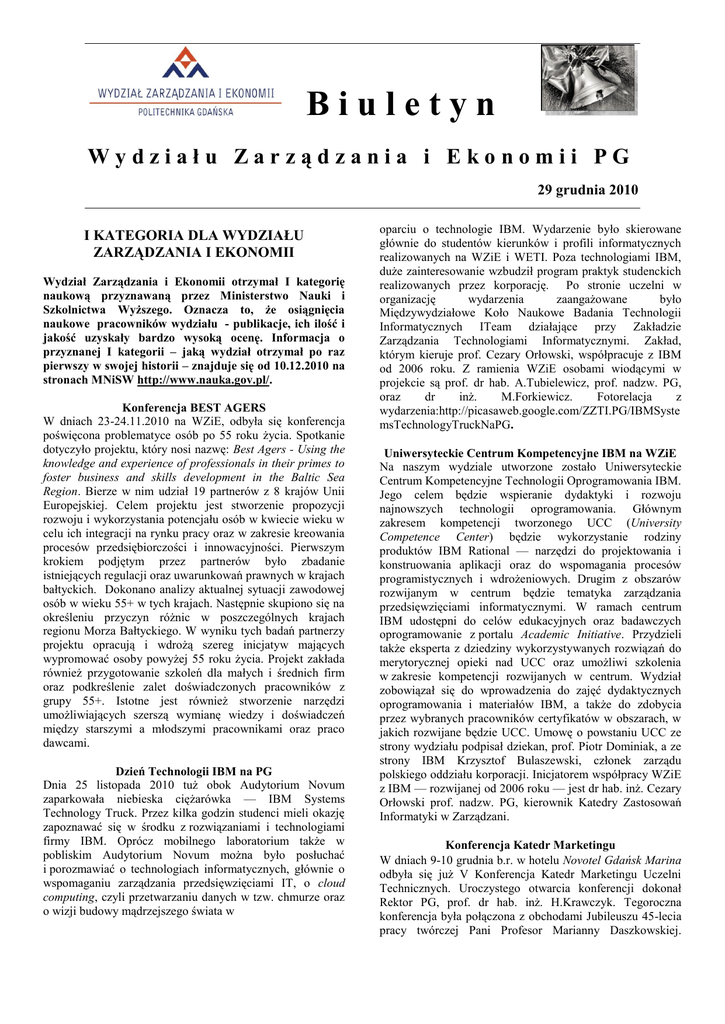 Biuletyn Wydziału Zarządzania i Ekonomii PG 29 grudnia 2010 I KATEGORIA DLA WYDZIAŁU ZARZĄDZANIA I EKONOMII Wydział Zarządzania i Ekonomii otrzymał I kategorię naukową przyznawaną przez Ministerstwo Nauki i Szkolnictwa Wyższego. Oznacza to, że osiągnięcia naukowe pracowników wydziału - publikacje, ich ilość i jakość uzyskały bardzo wysoką ocenę. Informacja o przyznanej I kategorii – jaką wydział otrzymał po raz pierwszy w swojej historii – znajduje się od 10.12.2010 na stronach MNiSW http://www.nauka.gov.pl/. Konferencja BEST AGERS W dniach 23-24.11.2010 na WZiE, odbyła się konferencja poświęcona problematyce osób po 55 roku życia. Spotkanie dotyczyło projektu, który nosi nazwę: Best Agers - Using the knowledge and experience of professionals in their primes to foster business and skills development in the Baltic Sea Region. Bierze w nim udział 19 partnerów z 8 krajów Unii Europejskiej. Celem projektu jest stworzenie propozycji rozwoju i wykorzystania potencjału osób w kwiecie wieku w celu ich integracji na rynku pracy oraz w zakresie kreowania procesów przedsiębiorczości i innowacyjności. Pierwszym krokiem podjętym przez partnerów było zbadanie istniejących regulacji oraz uwarunkowań prawnych w krajach bałtyckich. Dokonano analizy aktualnej sytuacji zawodowej osób w wieku 55+ w tych krajach. Następnie skupiono się na określeniu przyczyn różnic w poszczególnych krajach regionu Morza Bałtyckiego. W wyniku tych badań partnerzy projektu opracują i wdrożą szereg inicjatyw mających wypromować osoby powyżej 55 roku życia. Projekt zakłada również przygotowanie szkoleń dla małych i średnich firm oraz podkreślenie zalet doświadczonych pracowników z grupy 55+. Istotne jest również stworzenie narzędzi umożliwiających szerszą wymianę wiedzy i doświadczeń między starszymi a młodszymi pracownikami oraz praco dawcami. Dzień Technologii IBM na PG Dnia 25 listopada 2010 tuż obok Audytorium Novum zaparkowała niebieska ciężarówka — IBM Systems Technology Truck. Przez kilka godzin studenci mieli okazję zapoznawać się w środku z rozwiązaniami i technologiami firmy IBM. Oprócz mobilnego laboratorium także w pobliskim Audytorium Novum można było posłuchać i porozmawiać o technologiach informatycznych, głównie o wspomaganiu zarządzania przedsięwzięciami IT, o cloud computing, czyli przetwarzaniu danych w tzw. chmurze oraz o wizji budowy mądrzejszego świata w oparciu o technologie IBM. Wydarzenie było skierowane głównie do studentów kierunków i profili informatycznych realizowanych na WZiE i WETI. Poza technologiami IBM, duże zainteresowanie wzbudził program praktyk studenckich realizowanych przez korporację. Po stronie uczelni w organizację wydarzenia zaangażowane było Międzywydziałowe Koło Naukowe Badania Technologii Informatycznych ITeam działające przy Zakładzie Zarządzania Technologiami Informatycznymi. Zakład, którym kieruje prof. Cezary Orłowski, współpracuje z IBM od 2006 roku. Z ramienia WZiE osobami wiodącymi w projekcie są prof. dr hab. A.Tubielewicz, prof. nadzw. PG, oraz dr inż. M.Forkiewicz. Fotorelacja z wydarzenia:http://picasaweb.google.com/ZZTI.PG/IBMSyste msTechnologyTruckNaPG. Uniwersyteckie Centrum Kompetencyjne IBM na WZiE Na naszym wydziale utworzone zostało Uniwersyteckie Centrum Kompetencyjne Technologii Oprogramowania IBM. Jego celem będzie wspieranie dydaktyki i rozwoju najnowszych technologii oprogramowania. Głównym zakresem kompetencji tworzonego UCC (University Competence Center) będzie wykorzystanie rodziny produktów IBM Rational — narzędzi do projektowania i konstruowania aplikacji oraz do wspomagania procesów programistycznych i wdrożeniowych. Drugim z obszarów rozwijanym w centrum będzie tematyka zarządzania przedsięwzięciami informatycznymi. W ramach centrum IBM udostępni do celów edukacyjnych oraz badawczych oprogramowanie z portalu Academic Initiative. Przydzieli także eksperta z dziedziny wykorzystywanych rozwiązań do merytorycznej opieki nad UCC oraz umożliwi szkolenia w zakresie kompetencji rozwijanych w centrum. Wydział zobowiązał się do wprowadzenia do zajęć dydaktycznych oprogramowania i materiałów IBM, a także do zdobycia przez wybranych pracowników certyfikatów w obszarach, w jakich rozwijane będzie UCC. Umowę o powstaniu UCC ze strony wydziału podpisał dziekan, prof. Piotr Dominiak, a ze strony IBM Krzysztof Bulaszewski, członek zarządu polskiego oddziału korporacji. Inicjatorem współpracy WZiE z IBM — rozwijanej od 2006 roku — jest dr hab. inż. Cezary Orłowski prof. nadzw. PG, kierownik Katedry Zastosowań Informatyki w Zarządzani. Konferencja Katedr Marketingu W dniach 9-10 grudnia b.r. w hotelu Novotel Gdańsk Marina odbyła się już V Konferencja Katedr Marketingu Uczelni Technicznych. Uroczystego otwarcia konferencji dokonał Rektor PG, prof. dr hab. inż. H.Krawczyk. Tegoroczna konferencja była połączona z obchodami Jubileuszu 45-lecia pracy twórczej Pani Profesor Marianny Daszkowskiej. Konferencja została zorganizowana przez pracowników Katedry Marketingu naszego Wydziału. Miała duże znaczenie w budowaniu pozytywnego wizerunku Wydziału. Tegoroczna edycja Konferencji miała rozbudowaną formułę. Jej uczestnikami – poza przedstawicielami Katedr Marketingu Uczelni Technicznych – byli również pracownicy Katedr Marketingu Uniwersytetów. W efekcie, w Konferencji wzięli udział przedstawiciele wszystkich ważnych ośrodków akademickich w Polsce. Jak co roku, wydarzenie to przyciągnęło również przedstawicieli świata biznesu – praktyków z zakresu marketingu. Owocami konferencji są cztery publikacje naukowe oraz umocnione relacje z przedstawicielami świata marketingu w Polsce. Wigilia Wydziałowa Dnia 15 grudnia 2010 roku odbyła się coroczna Wigilia Wydziałowa, na którą licznie przybyli zarówno pracownicy jak i studenci Wydziału. Była moc 