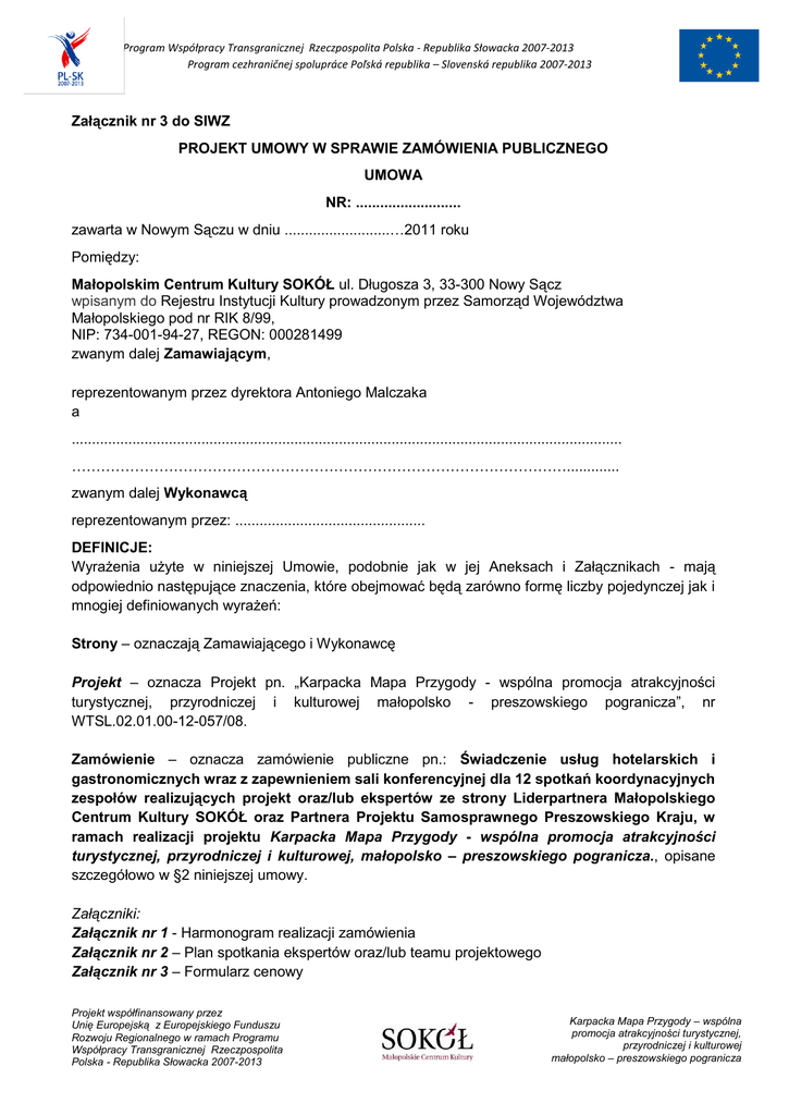 Program Współpracy Transgranicznej Rzeczpospolita Polska - Republika Słowacka 2007-2013 Program cezhraničnej spolupráce Poľská republika – Slovenská republika 2007-2013 Załącznik nr 3 do SIWZ PROJEKT UMOWY W SPRAWIE ZAMÓWIENIA PUBLICZNEGO UMOWA NR: .......................... zawarta w Nowym Sączu w dniu ..........................…2011 roku Pomiędzy: Małopolskim Centrum Kultury SOKÓŁ ul. Długosza 3, 33-300 Nowy Sącz wpisanym do Rejestru Instytucji Kultury prowadzonym przez Samorząd Województwa Małopolskiego pod nr RIK 8/99, NIP: 734-001-94-27, REGON: 000281499 zwanym dalej Zamawiającym, reprezentowanym przez dyrektora Antoniego Malczaka a ........................................................................................................................................ …………………………………………………………………………………………............. zwanym dalej Wykonawcą reprezentowanym przez: ............................................... DEFINICJE: Wyrażenia użyte w niniejszej Umowie, podobnie jak w jej Aneksach i Załącznikach - mają odpowiednio następujące znaczenia, które obejmować będą zarówno formę liczby pojedynczej jak i mnogiej definiowanych wyrażeń: Strony – oznaczają Zamawiającego i Wykonawcę Projekt – oznacza Projekt pn. „Karpacka Mapa Przygody - wspólna promocja atrakcyjności turystycznej, przyrodniczej i kulturowej małopolsko - preszowskiego pogranicza”, nr WTSL.02.01.00-12-057/08. Zamówienie – oznacza zamówienie publiczne pn.: Świadczenie usług hotelarskich i gastronomicznych wraz z zapewnieniem sali konferencyjnej dla 12 spotkań koordynacyjnych zespołów realizujących projekt oraz/lub ekspertów ze strony Liderpartnera Małopolskiego Centrum Kultury SOKÓŁ oraz Partnera Projektu Samosprawnego Preszowskiego Kraju, w ramach realizacji projektu Karpacka Mapa Przygody - wspólna promocja atrakcyjności turystycznej, przyrodniczej i kulturowej, małopolsko – preszowskiego pogranicza., opisane szczegółowo w §2 niniejszej umowy. Załączniki: Załącznik nr 1 - Harmonogram realizacji zamówienia Załącznik nr 2 – Plan spotkania ekspertów oraz/lub teamu projektowego Załącznik nr 3 – Formularz cenowy Projekt współfinansowany przez Unię Europejską z Europejskiego Funduszu Rozwoju Regionalnego w ramach Programu Współpracy Transgranicznej Rzeczpospolita Polska - Republika Słowacka 2007-2013 Karpacka Mapa Przygody – wspólna promocja atrakcyjności turystycznej, przyrodniczej i kulturowej małopolsko – preszowskiego pogranicza Program Współpracy Transgranicznej Rzeczpospolita Polska - Republika Słowacka 2007-2013 Program cezhraničnej spolupráce Poľská republika – Slovenská republika 2007-2013 Załącznik nr 4 – Specyfikacja jakościowa posiłków - Menu Załącznik nr 5 – Protokół częściowego odbioru usługi Załącznik nr 6 – Protokół końcowego odbioru usługi Załączniki nr 1 – 5 stanowią integralną część umowy. §1 1.Oświadczenia Zamawiającego: 1. Zamawiający oświadcza, że realizuje Projekt pn.: „Karpacka Mapa Przygody - wspólna promocja atrakcyjności turystycznej, przyrodniczej i kulturowej małopolsko - preszowskiego pogranicza”, nr WTSL.02.01.00-12-057/08. 2. Zamawiający oświadcza, iż niniejsza umowa jest realizowana w ramach i na potrzeby Projektu. 3. Umowa niniejsza została zawarta po przeprowadzeniu postępowania o udzielenie zamówienia publicznego nr.................... w trybie przetargu nieograniczonego, na podstawie art. 39 i nast. ustawy z dnia 29 stycznia 2004 r. - Prawo zamówień publicznych (tekst jednolity Dz. U. z 2010 r. Nr 113, poz. 759 z późn. zm.). 4. Zamawiający oświadcza, że zamówienie finansowane jest ze środków Europejskiego Funduszu Rozwoju Regionalnego i Budżetu Państwa. Środki Europejskiego Funduszu Rozwoju Regionalnego stanowią 85%, natomiast środki Budżetu Państwa stanowią 15% ogólnych środków przeznaczonych na jego realizację. 2.Oświadczenia Wykonawcy: 1. 2. 3. 4. Wykonawca oświadcza, że posiada kwalifikacje, uprawnienia, doświadczenie i umiejętności do wykonania przedmiotu umowy na zasadach określonych w niniejszej umowie. Wykonawca oświadcza, że prowadzi profesjonalnie działalność hotelarską i jest uprawniony do wykonania wszelkich czynności, o których mowa w § 2, a stanowiących przedmiot umowy, bądź też wykona niniejszą umowę w zakresie świadczenia usług restauracyjnych z podmiotem profesjonalnie prowadzącym działalność gospodarczą na terenie obiektu hotelowego. Wykonawca oświadcza również, że zapoznał się w całości z SIWZ, a w szczególności z opisem przedmiotu zamówienia oraz, że rozumie i akceptuje jego treść. Wykonawca zobowiązuje się do przechowywania dokumentów związanych z realizacją niniejszej umowy w sposób zapewniający dostępność, poufność i bezpieczeństwo, a także wyraża zgodę na kontrolowanie realizacji umowy i związanych z tym dokumentów przez upoważnione Instytucje. §2 1. Przedmiotem zamówienia jest świadczenie usług obejmujących: usługi hotelarskie polegające na zapewnieniu noclegu dla maksymalnie 12 osób podczas każdego z dwunastu dwudniowych spotkań (jedna doba noclegowa na każde spotkanie), w obiekcie, którego pokoje spełniają wymogi hotelu co najmniej 3 gwiazdkowego lub standardem odpowiadają wymogom równoważnym, oraz który ma możliwość zapewnić gościom całodzienne wyżywienie w ramach prowadzonej działalności. Świadczenie ww. usług hotelowych obejmuje noclegi w pokojach dwuosobowych i jednoosobowych, wraz z Projekt współfinansowany przez Unię Europejską z Europejskiego Funduszu Rozwoju Regionalnego w ramach Programu Współpracy Transgranicznej Rzeczpospolita Polska - Republika Słowacka 2007-2013 Karpacka Mapa Przygody – wspólna promocja atrakcyjności turystycznej, przyrodniczej i kulturowej małopolsko – preszowskiego pogranicza Program 