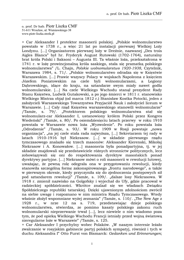 o. prof. Dr hab. Piotr Liszka CMF o. prof. Dr hab. Piotr Liszka CMF 51-611 Wrocław, ul. Wieniawskiego 38 www.piotr-liszka.strefa.pl + Car Aleksander I protektor masonerii polskiej. „Polskie wolnomularstwo powstało w 1738 r., a więc 21 lat po instalacji pierwszej Wielkiej Loży Londynu. […] Organizatorem pierwszej loży w Dreźnie, nazwanej „Des trois Aigles Blancs” był hr. Fryderyk August Rutowski (1702-1764), naturalny brat króla Polski i Saksoni – Augusta III. Ta właśnie loża, przekształcona w 1741 r. w lożę prowincjonalną króla saskiego, stała się pramatką polskiego wolnomularstwa” /L. Chajn, Polskie wolnomularstwo 1920-1938, Czytelnik, Warszawa 1984, s. 71/. „Polskie wolnomularstwo odradza się w Księstwie Warszawskim. […] Prawie wszyscy Polacy w wojskach Napoleona z księciem Józefem Poniatowskim na czele byli wolnomularzami, a Legiony Dąbrowskiego, idące do kraju, na sztandarze swym miały nawet godła wolnomularskie. […] Na czele Wielkiego Wschodu stanął prezydent Rady Stanu Księstwa, Ludwik Gutakowski, a po jego śmierci w 1811 r. stanowisko Wielkiego Mistrza objął (od marca 1812 r.) Stanisław Kostka Potocki, jeden z założycieli Warszawskiego Towarzystwa Przyjaciół Nauk i założyciel liceum w Warszawie. […] Cały rząd Księstwa warszawskiego stanowili wolnomularze” /Tamże, s. 79/. „Protektorem polskiego wolnomularstwa stał się wolnomularz-car Aleksander I, ustanowiony królem Polski przez Kongres Wiedeński” /Tamże, s. 80/. Po osiemdziesięciu latach przerwy w roku 1910 powstała w Warszawie nowa loża „Wyzwolenie”. Po roku powstała loża „Odrodzenie” /Tamże, s. 93/. W roku 1909 w Rosji powstaje „nowa organizacja”, „na jej czele stała rada najwyższa, […] Sekretarzem tej rady w latach 1910-1916 był Niekrasow. […] w składzie pierwszego rządu tymczasowego znalazło się trzech masonów: Aleksander Kierenski, Mikołaj Niekrasow i A. Konowałow. […] masoneria była ponadpartyjna, tj. w jej składzie znajdowali się przedstawiciele różnych stronnictw politycznych, lecz zobowiązywali się oni do respektowania dyrektyw masońskich ponad dyrektywy partyjne. […] Niekrasow mówi o roli masonerii w rewolucji lutowej, uważając, że pewną rolę odegrała ona w przygotowaniu rewolucji, kiedy stanowiła szczególną formę zakonspirowanego „frontu narodowego”, a także w pierwszym okresie, kiedy przyczyniła się do zjednoczenia postępowych sił pod sztandarem rewolucji” /Tamże, s. 109/. „dalsze losy Niekrasowa. W 1918 r. zmienił nazwisko na Golgofsky i wyjechał do Ufy, gdzie pracował w radzieckiej spółdzielczości. Wkrótce znalazł się we władzach Związku Spółdzielczego republiki tatarskiej. Dzięki ujawnionym zdolnościom zwrócił na siebie uwagę i rozpoznano w nim ministra Rządu Tymczasowego. Wtedy właśnie złożył wspomniane wyżej zeznania” /Tamże, s. 110/. „The New Age z 1928 r., w nrze 12 na s. 719, przedstawiając dzieje polskiego wolnomularstwa, stwierdza, ze pomimo kasaty polskiego zakonu ruch wolnomularski nieprzerwanie trwał […], lecz niewiele o nim wiadomo poza tym, że pod opieką Wielkiego Wschodu Francji istniały przed wojną światową nieregularne loże w Warszawie” /Tamże, s. 125. + Car Aleksander I przychylny wobec Polaków. „W naszym interesie leżało zwalczanie w rosyjskim gabinecie partyj polskich sympatyj, również i tych w duchu Aleksandra I” Otto Furst von Bismarck: Gedanken und Erinnerungen; 1 o. prof. Dr hab. Piotr Liszka CMF Stuttgart 1898, t. I, s. 308). „Trudno było z jaką taką pewnością przewidywać, czy i jak długo ten polityczny kapitał carskiej przyjaźni będzie dla nas praktycznie możliwy do zużytkowania. W każdym jednak razie prosty zdrowy rozsądek nakazywał nie dopuścić do tego, aby dostał się on w posiadanie naszych przeciwników, których musieliśmy widzieć w Polakach, w polonizujących Rosjanach i w ostatecznym wyniku prawdopodobnie i we Francuzach” (Tamże, s. 310). Napoleon III chciał pomóc Polakom. Próbował nawet wciągnąć do tej gry Austrię, której pomoc dla Polski mogła być całkiem realna ze względów geograficznych. Ostatecznie jednak plany te w zarodku zdusiła polityka angielska. Polityka angielska zastosowała tu klasyczny manewr podwójnego tajnego sterowania, którego właściwym celem było pokłócenie Francji z Rosją. Zaraz po wybuchu powstania styczniowego, w Anglii rozpoczęły się wielkie demonstracje, podczas których na wszystkie sposoby deklamowano o miłości w stosunku do Polski. 27 lutego 1863 r. w brytyjskim parlamencie odbyła się wielka debata, która miała charakter zdecydowanie propolski. Równocześnie odbywały się wiece, wygłaszano przemówienia, pisano artykuły, w których deklarowano się po stronie Polski. 17 kwietnia 1863 r. Anglia wraz z Francją i Austrią składa w Petersburgu notę, w której ujmuje się za Polakami: drugą taką notę złożono 17 czerwca tegoż roku. Polacy zapatrzeni w Zachód i przyjmujący wszystko, co z Zachodu pochodzi jako objawienie, skłonni byli ulegać złudzeniom i brali tę angielską grę dyplomatyczną za dobrą monetę. Dzięki temu angielskie podwójne tajne sterowanie odnosiło podwójny sukces – po pierwsze prowokowało Polaków do podtrzymywania walki z Rosją, a po drugie niszczyło francuską politykę zbliżenia z Rosją, wpychając tym samym Rosję w objęcia Prus. O tym, że gra angielska nie miała faktycznie na celu realnego przyjścia z pomocą Polsce, świadczy najlepiej fakt, że gdy tylko Francja wysunęła realny plan przyjścia z pomocą powstaniu polskiemu, polityka angielska od razu go obaliła i nie dopuściła do jego realizacji” /J. Kossecki, Tajemnice mafii politycznych, Wyd. Szumacher, Kielce 1991, s. 250. + Car Aleksander III Dygnitarze przekonali go o konieczności utworzenia dla ochrony jego osoby organizacji „społecznej”, która by uzupełniała i wspomagała działa