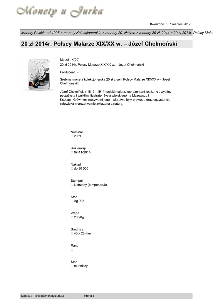 Utworzono : 07 marzec 2017 Monety Polskie od 1995 > monety Kolekcjonerskie > monety 20 złotych > monety 20 zł. 2014 > 20 zł 2014r. Polscy Malar 20 zł 2014r. Polscy Malarze XIX/XX w. – Józef Chełmoński Model : K(20) 20 zł 2014r. Polscy Malarze XIX/XX w. – Józef Chełmoński Producent : Srebrna moneta kolekcjonerska 20 zł z serii Polscy Malarze XIX/XX w - Józef Chełmoński� Józef Chełmiński ( 1849 - 1914) polski malarz, reprezentant realizmu , wybitny pejzażysta i wnikliwy ilustrator życia wiejskiego na Mazowszu i Ksesach.Głównymi motywami jego malarstwa były przyroda oraz egzystencja człowieka nierozerwalnie związana z naturą. Nominał �20 zł. Rok emisji �07-11-2014r. Nakład �do 30 000 Stempel �lustrzany (tampondruk) Stop �Ag 925 Waga �28,28g Średnica �40 x 28 mm Rant � Stan �menniczy kontakt : - [email protected] Strona 1 Utworzono : 07 marzec 2017 Monety Polskie od 1995 > monety Kolekcjonerskie > monety 20 złotych > monety 20 zł. 2014 > 20 zł 2014r. Polscy Malar 20 zł 2014r. Polscy Malarze XIX/XX w. – Józef Chełmoński � Cena : 185,00 zł Brutto ( 150,41 zł Netto) Dostępność: Produkt dostępny w naszym sklepie od 10 listopad 2014 kontakt : - [email protected] Strona 2