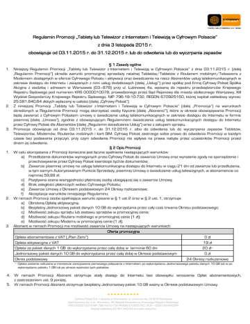 Regulamin Promocji „Tablety lub Telewizor z Internetem i Telewizją w Cyfrowym Polsacie” z dnia 3 listopada 2015 r. obowiązuje od 03.11.2015 r. do 31.12.2015 r. lub do odwołania lub do wyczrpania zapasów § 1 Zasady ogólne 1. Niniejszy Regulamin Promocji „Tablety lub Telewizor z Internetem i Telewizją w Cyfrowym Polsacie” z dnia 03.11.2015 r. (dalej „Regulamin Promocji”) określa warunki promocyjnej sprzedaży ratalnej Tabletów/Tabletów z Routerem mobilnym/Telewizora z Modemem dostępnych w ofercie Cyfrowego Polsatu i aktywacji oraz świadczenia na rzecz Abonentów usług telekomunikacyjnych w zakresie dostępu do Internetu i związanych z nimi usług dodatkowych (dalej „Usługi”) przez spółkę pod firmą Cyfrowy Polsat Spółka Akcyjna z siedzibą i adresem w Warszawie (03–878) przy ul. Łubinowej 4a, wpisaną do rejestru przedsiębiorców Krajowego Rejestru Sądowego pod numerem KRS 0000010078, prowadzonego przez Sąd Rejonowy dla miasta stołecznego Warszawy, XIII Wydział Gospodarczy Krajowego Rejestru Sądowego, NIP 796-18-10-732, REGON 670925160, której kapitał zakładowy wynosi: 25.581.840,64 złotych wpłacony w całości (dalej „Cyfrowy Polsat”). 2. Z niniejszej Promocji „Tablety lub Telewizor z Internetem i Telewizją w Cyfrowym Polsacie” (dalej „Promocja”) na warunkach określonych w Regulaminie Promocji mogą skorzystać osoby fizyczne (dalej „Abonenci”), które w okresie obowiązywania Promocji będą zawierać z Cyfrowym Polsatem umowy o świadczenie usług telekomunikacyjnych w zakresie dostępu do Internetu w formie pisemnej (dalej „Umowa”), zgodnie z obowiązującym Regulaminem świadczenia usług telekomunikacyjnych dostępu do Internetu przez Cyfrowy Polsat dla Abonentów (dalej „Regulamin świadczenia Usług”) wraz z zakupem sprzętu. 3. Promocja obowiązuje od dnia 03.11.2015 r. do 31.12.2015 r. albo do odwołania lub do wyczerpania zapasów Tabletów, Telewizorów, Modemów, Routerów mobilnych i kart SIM. Cyfrowy Polsat zastrzega sobie prawo do odwołania Promocji w każdym czasie bez podawania przyczyn, przy czym odwołanie Promocji nie wpływa na prawa nabyte przez uczestników Promocji przed dniem jej odwołania. § 2 Opis Promocji 1. W celu skorzystania z Promocji konieczne jest łączne spełnienie następujących warunków: a) Przedłożenie dokumentów wymaganych przez Cyfrowy Polsat do zawarcia Umowy oraz wyrażenie zgody na sporządzenie i przechowywanie przez Cyfrowy Polsat kserokopii tychże dokumentów; b) Zawarcie pisemnej umowy na usługę telekomunikacyjną dostępu do Internetu w ciągu 21 dni od zawarcia lub przedłużenia, w tym samym Autoryzowanym Punkcie Sprzedaży, pisemnej Umowy o świadczenie usług telewizyjnych, w abonamencie co najmniej 59,99 zł; c) Pozytywna ocena wiarygodności płatniczej osoby ubiegającej się o zawarcie Umowy; d) Brak zaległości płatniczych wobec Cyfrowego Polsatu; e) Zawarcie Umowy z Okresem podstawowym 24 Okresy rozliczeniowe; f) Akceptacja warunków niniejszego Regulaminu; 2. W ramach Promocji osoba spełniająca warunki opisane w § 1 ust 2 oraz w § 2 ust. 1, otrzymuje: a) Obniżoną Opłatę aktywacyjną; b) Bezpłatny Jednorazowy pakiet danych 10 GB do wykorzystania przez cały czas trwania Okresu podstawowego; c) Możliwość zakupu sprzętu lub zestawu sprzętów w promocyjnej cenie; d) Możliwość zakupu Routera mobilnego w promocyjnej cenie (1 zł); e) Możliwość zakupu Modemu w promocyjnej cenie (1 zł); 3. Abonent w ramach Promocji ma możliwość zawarcia Umowy na następujących warunkach: Oferta promocyjna Opłata abonamentowa z VAT („Plan Zero”) 0 zł Opłata aktywacyjna z VAT 19 zł Opłata za pakiet danych 1 GB do wykorzystania przez całą dobę w terminie 60 dni 20 zł Jednorazowy pakiet danych 10 GB do wykorzystania przez całą dobę w Okresie podstawowym 0 zł Okres podstawowy 24 Okresy rozliczeniowe 1) 1) Opłata zostanie naliczona w momencie zainicjowania pierwszego połączenia z Internetem po wykorzystaniu Jednorazowego pakietu danych 10 GB lub w po wykorzystaniu pakietu 1 GB lub po utracie ważności tych pakietów. 4. W ramach Promocji Abonent otrzymuje stały dostęp do Internetu bez obowiązku wnoszenia Opłat abonamentowych, z zastrzeżeniem ust. 9 poniżej. 5. W ramach Promocji Abonent otrzymuje bezpłatny Jednorazowy pakiet 10 GB ważny w Okresie podstawowym Umowy. Cyfrowy Polsat S.A. z siedzibą w Warszawie, ul. Łubinowa 4a, 03-878 Warszawa Sąd Rejonowy dla m.st. Warszawy, XIII Wydział Gospodarczy Krajowego Rejestru Sądowego KRS 0000010078 NIP 796-18-10-732 REGON 670925160, GIOŚ – E0001824WZBW Kapitał zakładowy 25.581.840,64 zł w pełni wpłacony 6. Korzystanie z Internetu po przekroczeniu Jednorazowego pakietu 10 GB realizowane jest w formie płatnych pakietów 1 GB ważnych przez 60 dni. Pakiet danych 1 GB może być wykorzystany tylko w Okresach rozliczeniowych, na które został przyznany i nie przechodzi na kolejne Okresy rozliczeniowe oraz nie uprawnia Abonenta do wypłaty jego równowartości. 7. Opłaty naliczane są za korzystanie z Internetu, z góry dopiero w momencie zainicjowania pierwszego połączenia po wykorzystaniu Jednorazowego pakietu danych 10 GB w kwocie 20 zł z VAT za każdy przyznany pakiet 1 GB. 8. Kolejna opłata za pakiet danych zostanie naliczona dopiero po wykorzystaniu wcześniej przydzielonego pakietu danych lub po utracie ważności środków. 9. W jednym Okresie Rozliczeniowym Abonent ma możliwość wykorzystania maksymalnie 2 lub 3 lub 5 pakietów danych po 1 GB w zależności od wyboru limitu dokonanego przy zawarciu Umowy. Limit pakietów, o którym mowa w zdaniu poprzedzającym, może zostać wyłączony na żądanie Abonenta w dowolnym momencie Okresu rozliczeniowego bądź zmieniony z nowym Okresem rozliczeniowym. Po wykorzystaniu ustalonego limitu następuje całkowita blokada dostępu do Usługi. 10. Abonent korzystający z taryfy Plan Zero nie ma możliwości korzys