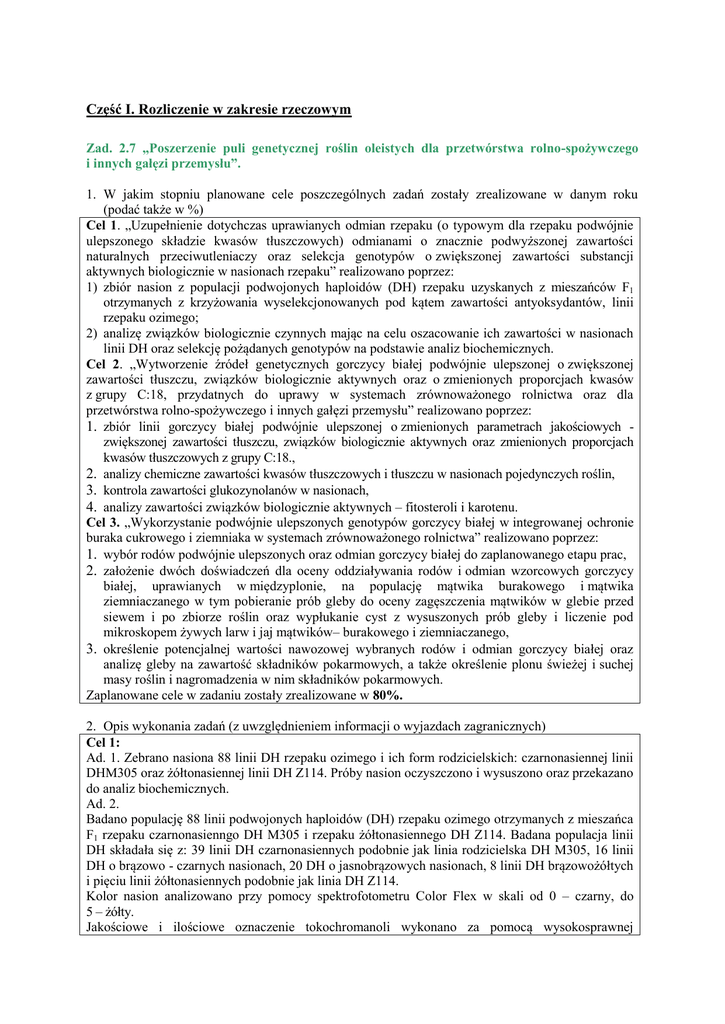 Część I. Rozliczenie w zakresie rzeczowym Zad. 2.7 „Poszerzenie puli genetycznej roślin oleistych dla przetwórstwa rolno-spożywczego i innych gałęzi przemysłu”. 1. W jakim stopniu planowane cele poszczególnych zadań zostały zrealizowane w danym roku (podać także w %) Cel 1. „Uzupełnienie dotychczas uprawianych odmian rzepaku (o typowym dla rzepaku podwójnie ulepszonego składzie kwasów tłuszczowych) odmianami o znacznie podwyższonej zawartości naturalnych przeciwutleniaczy oraz selekcja genotypów o zwiększonej zawartości substancji aktywnych biologicznie w nasionach rzepaku” realizowano poprzez: 1) zbiór nasion z populacji podwojonych haploidów (DH) rzepaku uzyskanych z mieszańców F1 otrzymanych z krzyżowania wyselekcjonowanych pod kątem zawartości antyoksydantów, linii rzepaku ozimego; 2) analizę związków biologicznie czynnych mając na celu oszacowanie ich zawartości w nasionach linii DH oraz selekcję pożądanych genotypów na podstawie analiz biochemicznych. Cel 2. „Wytworzenie źródeł genetycznych gorczycy białej podwójnie ulepszonej o zwiększonej zawartości tłuszczu, związków biologicznie aktywnych oraz o zmienionych proporcjach kwasów z grupy C:18, przydatnych do uprawy w systemach zrównoważonego rolnictwa oraz dla przetwórstwa rolno-spożywczego i innych gałęzi przemysłu” realizowano poprzez: 1. zbiór linii gorczycy białej podwójnie ulepszonej o zmienionych parametrach jakościowych zwiększonej zawartości tłuszczu, związków biologicznie aktywnych oraz zmienionych proporcjach kwasów tłuszczowych z grupy C:18., 2. analizy chemiczne zawartości kwasów tłuszczowych i tłuszczu w nasionach pojedynczych roślin, 3. kontrola zawartości glukozynolanów w nasionach, 4. analizy zawartości związków biologicznie aktywnych – fitosteroli i karotenu. Cel 3. „Wykorzystanie podwójnie ulepszonych genotypów gorczycy białej w integrowanej ochronie buraka cukrowego i ziemniaka w systemach zrównoważonego rolnictwa” realizowano poprzez: 1. wybór rodów podwójnie ulepszonych oraz odmian gorczycy białej do zaplanowanego etapu prac, 2. założenie dwóch doświadczeń dla oceny oddziaływania rodów i odmian wzorcowych gorczycy białej, uprawianych w międzyplonie, na populację mątwika burakowego i mątwika ziemniaczanego w tym pobieranie prób gleby do oceny zagęszczenia mątwików w glebie przed siewem i po zbiorze roślin oraz wypłukanie cyst z wysuszonych prób gleby i liczenie pod mikroskopem żywych larw i jaj mątwików– burakowego i ziemniaczanego, 3. określenie potencjalnej wartości nawozowej wybranych rodów i odmian gorczycy białej oraz analizę gleby na zawartość składników pokarmowych, a także określenie plonu świeżej i suchej masy roślin i nagromadzenia w nim składników pokarmowych. Zaplanowane cele w zadaniu zostały zrealizowane w 80%. 2. Opis wykonania zadań (z uwzględnieniem informacji o wyjazdach zagranicznych) Cel 1: Ad. 1. Zebrano nasiona 88 linii DH rzepaku ozimego i ich form rodzicielskich: czarnonasiennej linii DHM305 oraz żółtonasiennej linii DH Z114. Próby nasion oczyszczono i wysuszono oraz przekazano do analiz biochemicznych. Ad. 2. Badano populację 88 linii podwojonych haploidów (DH) rzepaku ozimego otrzymanych z mieszańca F1 rzepaku czarnonasienngo DH M305 i rzepaku żółtonasiennego DH Z114. Badana populacja linii DH składała się z: 39 linii DH czarnonasiennych podobnie jak linia rodzicielska DH M305, 16 linii DH o brązowo - czarnych nasionach, 20 DH o jasnobrązowych nasionach, 8 linii DH brązowożółtych i pięciu linii żółtonasiennych podobnie jak linia DH Z114. Kolor nasion analizowano przy pomocy spektrofotometru Color Flex w skali od 0 – czarny, do 5 – żółty. Jakościowe i ilościowe oznaczenie tokochromanoli wykonano za pomocą wysokosprawnej chromatografii cieczowej HPLC. Zawartość tokoferoli obliczano na podstawie krzywych standardowych wykonanych dla poszczególnych homologów tokoferolu, a zawartość PC-8 z powodu braku odpowiedniego standardu dla tego homologu, jego zawartość przeliczano jako ekwiwalent -T. Zawartość związków fenolowych w ekstraktach metanolowych oznaczono metodą kolorymetryczną z zastosowaniem odczynnika Folina-Ciocalteu. Obliczono stosunek α-T/ γ-T oraz całkowitą zawartość tokoferoli jako sumę: α-T, β-T, γ-T i δ-T. Obliczono także współczynniki korelacji dla koloru nasion i pięciu badanych cech. Dla żywienia człowieka α-T jest bardzo ważny, natomiast dla stabilności oleju wymagana jest wysoka zawartość γ-T i δ-T. Natomiast plastochromanol-8 jest pochodnym związkiem T-γ o dłuższym łańcuchu bocznym. Jego aktywność oksydacyjna jest podobna do T- α. Olej rzepakowy zawiera najwięcej α-T i γ-T natomiast β-T i δ-T w śladowych ilościach. W przeprowadzonych badaniach uzyskano dużą zmienność genetyczną w zawartości badanych związków w populacji linii DH. Zawartości tych związków w liniach DH przekraczały wartości linii rodzicielskich: DH M305 i DHZ114. Ilość α-T wynosiła od 20,340 do 31,350 mg/100g nasion, a linie rodzicielskie DHM305 i DH Z114 zawierały odpowiednio 27,085 oraz 29,552 mg/100g nasion. Natomiast zawartość γ-T w 88 linach DH zawierała się od 19,160 do 35,680 mg/100g naion, a u linii DH M305 31,792 mg/100g nasion, DH Z114 22,791 mg/100g. Zawartość delta tokoferolu w liniach DH wynosiła od 0,115 do 0,980 mg/100g nasion, linia rodzicielskie czarno- i żółtonasienne charakteryzowały się podobną zawartośią 0,570 mg/100g nasion. Obliczony stosunek α-T/γ-T w populacji podwojonych haploidów wynosił od 0,651 do 1,334, a w liniach rodzicielskich: DH M305- 0,859 i DH Z114- 1,344. Suma tokoferoli 88 linii DH zawierała się w przedziale od 46,88 do 64,29 mg/100g nasion, natomiast w liniach: DH M305- 63,28 mg/100g, a DH Z114 - 56,78 mg/100g nasion. Plastochromanol-8 występował w populacji linii DH w ilości od 3,750 do 7,075 mg
