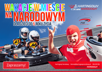Miejsce: Tor Kartingowy Narodowy, PGE Narodowy Turnusy: tygodniowe, od poniedziałku do piątku, godz. 8:00 - 17:00 Terminy turnusów: 25 - 29.07, 8 - 12.08, 22 - 26.08 PROFESJONALNA NAUKA JAZDY GOKARTAMI - zajęcia prowadzone przez mistrzów sportu kartingowego: Tomasza Krzemińskiego, Łukasza Bartoszuka, - zagadnienia teoretyczne i praktyczne dotyczące jazdy gokartem, - analizy techniki jazdy na podstawie filmów z wyścigów. Program szkółki kartingowej: - Zasady bezpieczeństwa - Jazdy z użyciem flag - Ćwiczenia z wyścigowego operowania gazem i hamulcem - Płynne używanie gazu, ćwiczenia na wyczucie - Wprowadzenie pojęć wyścigowych - Ćwiczenia na skupienie się zawodnika w celu pokonywania barier prędkości w zakrętach - Nauka startów i przejeżdżania technicznych sektorów toru - Treningi z pomiarem czasu - Wyścigi próbne - Film (analiza techniki jazdy) WYŻYWIENIE SZKÓŁKA GOKARTOWA Lunch, przekąski, owoce i napoje Treningi prowadzone przez Mistrzów ZWIEDZANIE STADIONU ANIMACJE Każde dziecko poczuje się jak kibic Gry i zabawy psycho-fizyczne ROLKI TEATR XL Aktywne warsztaty na Stadionie Aktorskie warsztaty dla dzieci OCEANARIUM MOTO-WARSZTATY Prehistoryczne Oceanarium 3D Analiza wyścigów Formuły 1 HARMONOGRAM 08:00 - zbiórka na torze Kartingowy Narodowy (recepcja toru przy bramie nr 9) 08:00-09:00 - rozgrzewka, gry i zabawy, przekąski, napoje 09:00-12:00 - szkółka kartingowa z instruktorem 12:00-13:00 - lunch 13:00-17:00 - atrakcje 17:00 - odbiór dzieci z toru Kartingowy Narodowy (recepcja toru przy bramie nr 9) ATRAKCJE poniedziałek - Teatr XL warsztaty aktorskie wtorek - Moto-warsztaty z Mistrzem Polski środa - wycieczka do Oceanarium Prehistorycznego 3D - warsztaty jazdy na rolkach czwartek - Teatr XL warsztaty ze scenografii piątek - zwiedzanie PGE Narodowego, - warsztaty jazdy na rolkach - rozdanie dyplomów na podium 1 turnus = 5 dni (pn.-pt.) - 990 zł ZAPISY e-mail: [email protected] tel. 506 639 094 Prosimy o kontakt tel. od pn. do pt. w godz. 11:00-17:00 W przypadku złych warunków atmosferycznych lub innych czynników niezależnych od nas, możliwe są niewielkie zmiany w harmonogramie