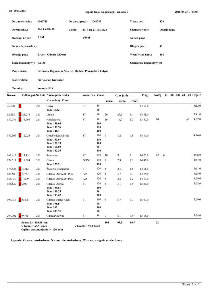RJ 2014/2015 Raport trasy dla pociągu - zmiana V Nr zamówienia.: 1060749 Nr zam. grupy: Nr wniosku.: 803-2-2346-15 z dnia: Rodzaj i nr poc.: APM 1060749 2015-08-25 / 07:08 V max poc.: 120 2015-08-24 14:36:22 Charakter poc.: Okazjonalny 55041 Nazwa poc.: Nr miedzynarodowy: Długość poc.: 42 Relacja poc.: Wym. % m. ham.: 102 Brusy - Gdynia Główna Seria lokomotywy: SA131 Obciążenie lokomotywy:85 Przewoźnik: Przewozy Regionalne Sp.z o.o. Oddział Pomorski w Gdyni Konstruktor: Piórkowski Krzysztof Terminy: kursuje: 5.IX; Km osi Odl m. pkt.Nr linii Nazwa posterunku oznaczenie V max Km zmiany V max 26,598 52,612 137,344 149,367 162,817 174,511 Z 211 Z 26,014 Z 16,708 Z 12,023 Z 13,45 Z 11,694 211 201 201 201 201 Przyj. Czas jazdy norm. skróc. ST Lipusz ST 80 Kościerzyna Km 139,03 Km 139,76 Km 148,4 ST 90 Gołubie Kaszubskie Km 153,67 Km 159,19 Km 161,69 Km 162,35 ST Somonino ST Glincz Km 175,2 PODG pt pn pm zd ph Odjazd rezer. 50 Brusy Km 41,32 Postój 13:12,0 13:12,0 80 29 27,6 1,4 13:41,0 13:41,0 10 ph 14:07,0 16 14,7 1,3 13:57,0 9 8,2 0,8 14:16,0 110 10 9 1 14:26,0 110 9 7,9 1,1 14:47,0 14:47,0 100 120 100 100 14:16,0 110 100 90 110 12 pt 14:38,0 120 178,823 Z 4,312 201 Żukowo Wschodnie ST 120 4 2,5 1,5 14:51,0 14:51,0 184,58 Z 5,757 201 Gdańsk Osowa R1 PZS PZS 120 4 3,7 0,3 14:55,0 14:55,0 186,459 Z 1,879 201 Gdańsk Osowa R4 PZS PZS 120 4 2,8 1,2 14:59,0 14:59,0 188,529 Z 2,07 201 Gdańsk Osowa Km 189,51 Km 190,25 Km 193,62 ST 120 4 3,1 0,9 15:03,0 15:03,0 Gdynia Wielki Kack Km 196,5 Km 202 Km 203,75 ST 6 5,7 0,3 15:09,0 15:09,0 Gdynia Główna ST 9 8,1 0,9 15:18,0 15:18,0 104 93,3 10,7 194,937 204,702 Z 6,408 Z 9,765 201 201 Suma: L= 110,08 km V techn:= 63,5 km/h Ogólny czas przejazdu:= 126 min 100 90 100 100 90 100 80 80 22 V handl:= 52,4 km/h Legenda: Z - zam. zatwierdzone; N - zam. niezatwierdzone; W - zam. wstępnie zatwierdzone; Strona 1 z 1