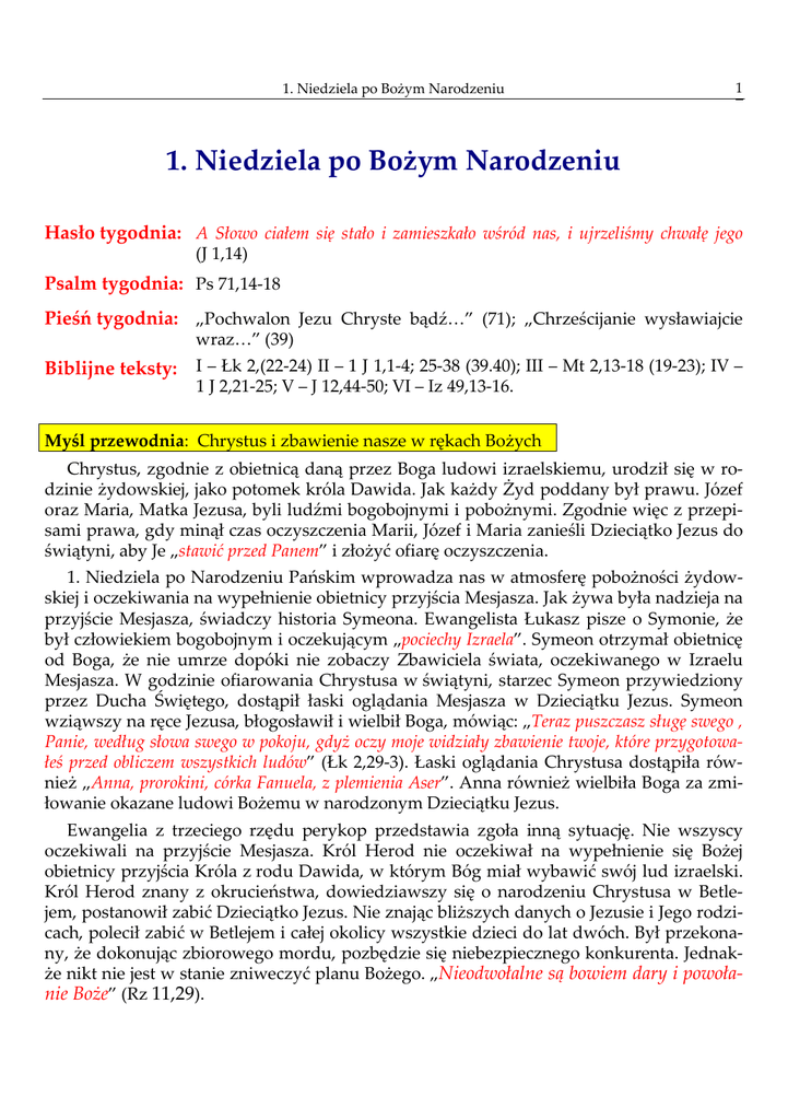 1. Niedziela po Bożym Narodzeniu 1 1. Niedziela po Bożym Narodzeniu Hasło tygodnia: A Słowo ciałem się stało i zamieszkało wśród nas, i ujrzeliśmy chwałę jego (J 1,14) Psalm tygodnia: Ps 71,14-18 Pieśń tygodnia: „Pochwalon Jezu Chryste bądź…” (71); „Chrześcijanie wysławiajcie wraz…” (39) Biblijne teksty: I – Łk 2,(22-24) II – 1 J 1,1-4; 25-38 (39.40); III – Mt 2,13-18 (19-23); IV – 1 J 2,21-25; V – J 12,44-50; VI – Iz 49,13-16. Myśl przewodnia: Chrystus i zbawienie nasze w rękach Bożych Chrystus, zgodnie z obietnicą daną przez Boga ludowi izraelskiemu, urodził się w rodzinie żydowskiej, jako potomek króla Dawida. Jak każdy Żyd poddany był prawu. Józef oraz Maria, Matka Jezusa, byli ludźmi bogobojnymi i pobożnymi. Zgodnie więc z przepisami prawa, gdy minął czas oczyszczenia Marii, Józef i Maria zanieśli Dzieciątko Jezus do świątyni, aby Je „stawić przed Panem” i złożyć ofiarę oczyszczenia. 1. Niedziela po Narodzeniu Pańskim wprowadza nas w atmosferę pobożności żydowskiej i oczekiwania na wypełnienie obietnicy przyjścia Mesjasza. Jak żywa była nadzieja na przyjście Mesjasza, świadczy historia Symeona. Ewangelista Łukasz pisze o Symonie, że był człowiekiem bogobojnym i oczekującym „pociechy Izraela”. Symeon otrzymał obietnicę od Boga, że nie umrze dopóki nie zobaczy Zbawiciela świata, oczekiwanego w Izraelu Mesjasza. W godzinie ofiarowania Chrystusa w świątyni, starzec Symeon przywiedziony przez Ducha Świętego, dostąpił łaski oglądania Mesjasza w Dzieciątku Jezus. Symeon wziąwszy na ręce Jezusa, błogosławił i wielbił Boga, mówiąc: „Teraz puszczasz sługę swego , Panie, według słowa swego w pokoju, gdyż oczy moje widziały zbawienie twoje, które przygotowałeś przed obliczem wszystkich ludów” (Łk 2,29-3). Łaski oglądania Chrystusa dostąpiła również „Anna, prorokini, córka Fanuela, z plemienia Aser”. Anna również wielbiła Boga za zmiłowanie okazane ludowi Bożemu w narodzonym Dzieciątku Jezus. Ewangelia z trzeciego rzędu perykop przedstawia zgoła inną sytuację. Nie wszyscy oczekiwali na przyjście Mesjasza. Król Herod nie oczekiwał na wypełnienie się Bożej obietnicy przyjścia Króla z rodu Dawida, w którym Bóg miał wybawić swój lud izraelski. Król Herod znany z okrucieństwa, dowiedziawszy się o narodzeniu Chrystusa w Betlejem, postanowił zabić Dzieciątko Jezus. Nie znając bliższych danych o Jezusie i Jego rodzicach, polecił zabić w Betlejem i całej okolicy wszystkie dzieci do lat dwóch. Był przekonany, że dokonując zbiorowego mordu, pozbędzie się niebezpiecznego konkurenta. Jednakże nikt nie jest w stanie zniweczyć planu Bożego. „Nieodwołalne są bowiem dary i powołanie Boże” (Rz 11,29). 2 1. Niedziela po Narodzeniu Pańskim Bóg uratował Dzieciątko Jezus, polecając udać się Józefowi i Marii z Dzieciątkiem Jezus do Egiptu. Ewangelista Mateusz zaznacza, że śmierć dzieci Betlejemskich i ucieczka Marii z Jezusem do Egiptu, były przepowiedziane w Starym Testamencie (Mt 2,13-23). Bóg zna całą historię stworzonego przez siebie świata. I wszystko się dzieje co Bóg wie. Prorocy natchnieni przez Ducha Bożego mogli więc przewidzieć losy urodzonego w Betlejem Jezusa. Duch Boży stawia nas w 1. Niedzielę po Bożym Narodzeniu wobec pytania: Jak przyjmujemy Zbawiciela, Jezusa Chrystusa, który przychodzi do nas i obecny jest w naszym życiu w Słowie i Sakramentach? Z tego pytania rodzą się następne. Czy przyjmujemy Go z radością i uwielbieniem? A może jest On niewygodnym Gościem w życiu naszym? Apostoł Jan wzywa nas, abyśmy mieli społeczność z Chrystusem, a przez Niego społeczność z Bogiem i Ojcem naszym. Chrystus jest życiem naszym. W Nim objawiony został żywot wieczny. Duch Boży nakazuje nam przeto wpatrywać się w Symeona i Annę, gdyż ich wiara i postawa jest miła Bogu. Kto przyjmuje Chrystusa z wiarą i wdzięcznością, ten ma żywot wieczny. „To, co słyszeliście od początku, niech pozostanie w was. Jeżeli pozostanie w was to, co od początku słyszeliście, i wy pozostaniecie w Synu i w Ojcu. A obietnica, którą sam nam dał, to żywot wieczny” 1 J 2,24-25). Często mówimy, że powinniśmy przyjąć Chrystusa z wiarą. Ale Nowy Testament zna też inne sformułowania, które opisują nasz związek z Chrystusem, Synem Bożym. Święty apostoł Paweł raczej pisze o naszej drodze wiary jako o egzystencji w Chrystusie. Chrystus więc nie przyszedł jedynie dlatego, aby zamieszkać wśród nas i abyśmy Go jak gościa przyjęli, lecz wkroczył w historię, aby nasza, ludzka historia w Nim dopełniła się i abyśmy w Chrystusie przeobrazili się, stali się nowymi stworzeniami i abyśmy przez wiarę nieustannie w Niego wzrastali i przemieniali się na Jego obraz. Symeon trzymając Dziecię Jezus na rękach swoich, powiedział do Marii: „Oto ten przeznaczony jest, aby przezeń upadło i powstało wielu w Izraelu i aby był znakiem, któremu sprzeciwiać się będą” (Łk 2,34). Tak było od pierwszych chwil narodzenia Chrystusa i tak będzie dopóki nie przyjdzie w chwale i mocy, aby osądzić wszystkie narody świata. Trwa czas łaski i decyzji, którą podjąć musi każdy, kto w życiu swoim spotka się z Chrystusem. „Panie nasz i Stwórco wszego, Tron Twój wiecznie będzie stał. Z miłosierdzia niezmiernego Syna swego światuś dał (…). Doń, grzesznicy, pośpieszajcie, Bierzcie darmo łaski dar, Tylko się upamiętajcie, A ujdziecie wiecznych kar”. *** 1. Niedziela po Bożym Narodzeniu 3 „Chciał tedy Bóg «pojednać w Chrystusie świat z sobą» (2 Kor 5,19) i sam Stwórca przyjął na siebie naturę swojego stworzenia, aby jej przywrócić swój obraz i podobieństwo” (Leon Wielki) „Chrystus, Słowo Boże, raz tylko narodził się w ciele, co było dowodem Jego dobroci i miłości ku ludziom; ale jest zawsze gotów narodzić się duchowo u