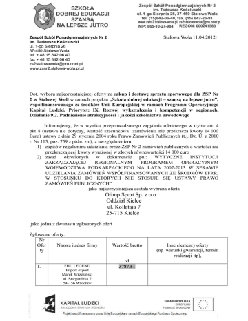 Stalowa Wola 11.04.2012r Zespól Szkół Ponadgimnazjalnych Nr 2 Im. Tadeusza Kościuszki ul. 1-go Sierpnia 26 37-450 Stalowa Wola tel. + 48 15 842 06 40 fax + 48 15 842 06 40 [email protected] www.zsnr2.stalowa-wola.pl.pl Dot. wyboru najkorzystniejszej oferty na zakup i dostawę sprzętu sportowego dla ZSP Nr 2 w Stalowej Woli w ramach projektu „Szkoła dobrej edukacji – szansą na lepsze jutro”, współfinansowanego ze środków Unii Europejskiej w ramach Programu Operacyjnego Kapitał Ludzki, Priorytet: IX. Rozwój wykształcenia i kompetencji w regionach, Działanie 9.2. Podniesienie atrakcyjności i jakości szkolnictwa zawodowego Informujemy, że w wyniku przeprowadzonego zapytania ofertowego w trybie art. 4 pkt 8 (ustawa nie dotyczy, wartość szacunkowa zamówienia nie przekracza kwoty 14 000 Euro) ustawy z dnia 29 stycznia 2004 roku Prawo Zamówień Publicznych (t.j. Dz. U. z 2010 r. Nr 113, poz. 759 z późn. zm), z uwzględnieniem: 1) zapisów regulaminu udzielania przez ZSP Nr 2 zamówień publicznych o wartości nie przekraczającej kwoty wyrażonej w złotych równowartości 14 000 euro 2) zasad określonych w dokumencie pn.: WYTYCZNE INSTYTUCJI ZARZĄDZAJĄCEJ REGIONALNYM PROGRAMEM OPERACYJNYM WOJEWÓDZTWA PODKARPACKIEGO NA LATA 2007-2013 W SPRAWIE UDZIELANIA ZAMÓWIEŃ WSPÓŁFINANSOWANYCH ZE ŚRODKÓW EFRR, W STOSUNKU DO KTÓRYCH NIE STOSUJE SIĘ USTAWY PRAWO ZAMÓWIEŃ PUBLICZNYCH” jako najkorzystniejsza została wybrana oferta Olimp Sport Sp. z o.o. Oddział Kielce ul. Kołłątaja 7 25-715 Kielce jako jedna z dwunastu zgłoszonych ofert . Zgłoszone oferty: Nr Ofer Nazwa i adres firmy ty 1. FHU LEGEND Import export Marek Wrzesiński ul. Stargardzka 7 54-156 Wrocław Wartość brutto zł 3787,51 Inne elementy oferty (np warunki gwarancji, termin realizacji itp), 2. 3. 4 5 6 7 8 9 10 11 12 MAAW SPORT Hurt Detal Artykuły Sportowe Wojciech Kiszka ul. Piłsudskiego 2 37-200 Przeworsk CEZAS – GLOB Sp. z o.o. ul. Żelazna 2 10-419 Olsztyn Serwis Gospodarczy Paweł Szczepaniak ul. Tuwima 22 98-300 Wieluń 3017,00 Hurtowniasportowa.net S.C. ul. Kożuchowska 20 D 65-001 Zielona Góra Olimp Sport Sp. z o.o. Oddział Kielce ul. Kołłątaja 7 25-715 Kielce PHPU LEBA-SPORT Lech Kupran ul. Dworcowa 62/115 10-437 Olsztyn ,,KAJA” KOZŁOWSCY Sp. J. ul. Św. Rocha 5 lok. 3 15-879 Białystok KAL-SPORT Paweł Kalita ul. Rejtana 8 35-310 Rzeszów SK-SPORT S. Gulina, J. Łuszcz ul. Siemieńskiego 14 35-203 Rzeszów ELEPHANT PRO-SPORT Sp.J. ul. Tenisowa 18 53-033 Wrocław Sklep Sportowy Maraton Sowa Dorota ul. Okulickiego 88 4509,68 4416,00 3709,00 2650,00 4188,00 4222,95 3950,00 4086,00 4421,75 3482,00 Wybrana oferta spełnia wszystkie wymagania formalne Zamawiającego i posiada najkorzystniejsza cenę. Dziękujemy za udział w postępowaniu. Otrzymują : 1 x adresat 1 x a/a