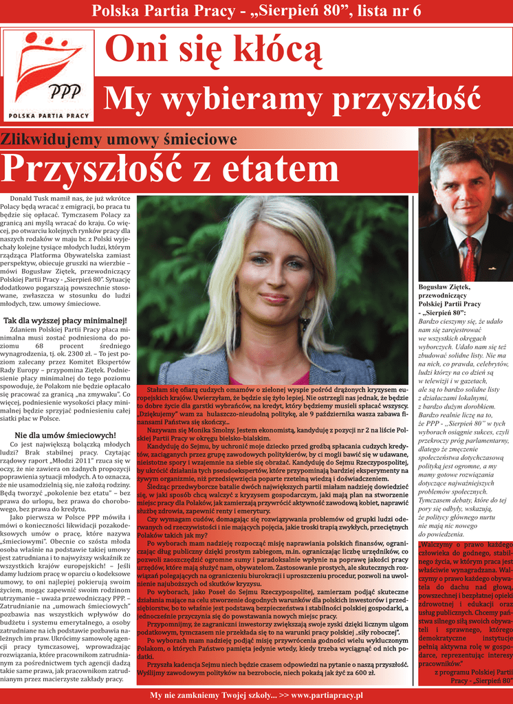 Polska Partia Pracy - „Sierpień 80”, lista nr 6 Oni się kłócą My wybieramy przyszłość Zlikwidujemy umowy śmieciowe Przyszłość z etatem Donald Tusk mamił nas, że już wkrótce Polacy będą wracać z emigracji, bo praca tu będzie się opłacać. Tymczasem Polacy za granicą ani myślą wracać do kraju. Co więcej, po otwarciu kolejnych rynków pracy dla naszych rodaków w maju br. z Polski wyjechały kolejne tysiące młodych ludzi, którym rządząca Platforma Obywatelska zamiast perspektyw, obiecuje gruszki na wierzbie – mówi Bogusław Ziętek, przewodniczący Polskiej Partii Pracy - „Sierpień 80”. Sytuację dodatkowo pogarszają powszechnie stosowane, zwłaszcza w stosunku do ludzi młodych, tzw. umowy śmieciowe. Tak dla wyższej płacy minimalnej! Zdaniem Polskiej Partii Pracy płaca minimalna musi zostać podniesiona do poziomu 68 procent średniego wynagrodzenia, tj. ok. 2300 zł. – To jest poziom zalecany przez Komitet Ekspertów Rady Europy – przypomina Ziętek. Podniesienie płacy minimalnej do tego poziomu spowoduje, że Polakom nie będzie opłacało się pracować za granicą „na zmywaku”. Co więcej, podniesienie wysokości płacy minimalnej będzie sprzyjać podniesieniu całej siatki płac w Polsce. Nie dla umów śmieciowych! Co jest największą bolączką młodych ludzi? Brak stabilnej pracy. Czytając rządowy raport „Młodzi 2011” rzuca się w oczy, że nie zawiera on żadnych propozycji poprawienia sytuacji młodych. A to oznacza, że nie usamodzielnią się, nie założą rodziny. Będą tworzyć „pokolenie bez etatu” – bez prawa do urlopu, bez prawa do chorobowego, bez prawa do kredytu. Jako pierwsza w Polsce PPP mówiła i mówi o konieczności likwidacji pozakodeksowych umów o pracę, które nazywa „śmieciowymi”. Obecnie co szósta młoda osoba właśnie na podstawie takiej umowy jest zatrudniana i to najwyższy wskaźnik ze wszystkich krajów europejskich! – Jeśli damy ludziom pracę w oparciu o kodeksowe umowy, to oni najlepiej pokierują swoim życiem, mogąc zapewnić swoim rodzinom utrzymanie – uważa przewodniczący PPP. – Zatrudnianie na „umowach śmieciowych” pozbawia nas wszystkich wpływów do budżetu i systemu emerytalnego, a osoby zatrudniane na ich podstawie pozbawia należnych im praw. Ukrócimy samowolę agencji pracy tymczasowej, wprowadzając rozwiązania, które pracownikom zatrudnianym za pośrednictwem tych agencji dadzą takie same prawa, jak pracownikom zatrudnianym przez macierzyste zakłady pracy. Stałam sięlatofiarą omamów zielonej wyspie pośród drążonych euza sytuację na rynku pracy, jakkryzysem to się działo Już kilka temucudzych Polska Partia Pracyo zaropejskich krajów. Uwierzyłam, że będzienosię żyło lepiej. Nielatach. ostrzegli nas jednak, w ostatnich Stąd też jeden że z będzie postuczęła pracować nad własnym projektem to dobre życieustawy dla garstkiowybrańców, na kredyt, który będziemy spłacać wszyscy. latów PPP głosi, że musieli np. w przetargach z funwelizacji zatrudnianiu „Dziękujemy” za hulaszczo-nieudolną 9 października zabawa fiduszy ale państwowych i wasza samorządowych pracownikówwam tymczasowych. Projekt ten politykę, nansami Państwa się skończy... zakłada m.in., że firma nie może zatrudniać powinny być preferowane firmy, które zaNazywam siętymczasowych Monika Smolny. ekonomistą, kandyduję z pozycji nr 2dające na liście Poltrudniają na umowy o pracę zabezpracowników naJestem „śmiecioskiej Pracy wjeżeli okręgu bielsko-bialskim. wychPartii umowach”, w okresie ostatnich pieczenie socjalne i fundusz emerytalny. A Kandyduję do Sejmu, by uchronić moje dziecko przed groźbą cudzych kredyprzypomnijmy, żespłacania te kontrakty niejedno6 miesięcy zwolniła swoich macierzystych tów, zaciąganych przez grupę zawodowych by ci mogli się w udawane, krotnie opiewają na bawić gigantyczne kwoty. – pracowników. Ma to ukrócić zastępowaniepolitykierów, nieistotne spory i wzajemnie naludźmi, siebie się obrażać. Kandyduję do Sejmu Rzeczypospolitej, Chcemy, by samorząd i agendy państwowe pracowników wypożyczonymi któby tych pseudoekspertów, przypominają eksperymenty na były zobowiązanebardziej do zatrudniania na podrzyukrócić tylko zdziałania nazwy są pracownikami, a niektóre żywym organizmie, przedsięwzięcia poparte rzetelną wiedzą i doświadczeniem. stawie umów kodeksowych i w ten sposób mają żadnych praw niż pracowniczych. Ponadto Śledząc przedwyborcze batalie dwóch największych miałam nadzieję dowiedzieć „świeciłypartii przykładem”, a nie wykorzystywedług tego projekt, pracownik tymczasię, w jaki sposób chcą walczyć zgorzej, kryzysem mają plan na stworzenie wały młodychjaki ludzi na bezpłatnych stażach sowy nie może być traktowany niż gospodarczym, miejsc pracy dla Polaków, jak zamierzają przywrócić aktywność zawodową kobiet, naprawić – mówi Iwona Mandat, kandydatka PPP z pracownicy zatrudnieni przez tego pracosłużbę zapewnić emerytury. Częstochowy. dawcęzdrowia, na takim samymrenty lub i podobnym Czy wymagam domagając się rozwiązywania problemów od grupki Przedstawiciele Polskiej Partiiludzi Pracyodezastanowisku pracy. cudów, Pracownikowi tymczasorwanych od rzeczywistości i nie świadczenia mających pojęcia, jakie troskiżetrapią zwykłych, przeciętnych powiedzieli, w parlamencie będą prowawemu przysługują wszelkie Polaków takich jak my? wynikające z obowiązujących u takiego pra- dzić taką politykę wspierania tworzenia Po wyborach mam nadzieję rozpocząć misję naprawiania polskich finansów,każdemu ograninowych miejsc pracy, by zapewnić codawcy. czając dług publiczny dzięki prostym zabiegom, m.in. ograniczając liczbę urzędników, co możliwość zatrudnienia. – Stoimy na stano– Nasz projekt ma 3 strony. Dotyczy pozwoli ogromne sumy i paradoksalnie na poprawę jakości pracy każdy cz
