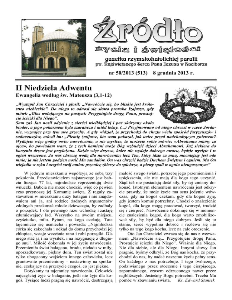 gazetka rzymskokatolickiej parafii pw. Najświętszego Serca Pana Jezusa w Raciborzu nr 50/2013 (513) 8 grudnia 2013 r. II Niedziela Adwentu Ewangelia według św. Mateusza (3,1-12) „Wystąpił Jan Chrzciciel i głosił: „Nawróćcie się, bo bliskie jest królestwo niebieskie”. Do niego to odnosi się słowo proroka Izajasza, gdy mówi: „Głos wołającego na pustyni: Przygotujcie drogę Panu, prostujcie ścieŜki dla Niego”. Sam zaś Jan nosił odzienie z sierści wielbłądziej i pas skórzany około bioder, a jego pokarmem była szarańcza i miód leśny. (...) Przyjmowano od niego chrzest w rzece Jordanie, wyznając przy tym swe grzechy. A gdy widział, Ŝe przychodzi do chrztu wielu spośród faryzeuszów i saduceuszów, mówił im: „Plemię Ŝmijowe, kto wam pokazał, jak uciec przed nadchodzącym gniewem? Wydajcie więc godny owoc nawrócenia, a nie myślcie, Ŝe moŜecie sobie mówić: «Abrahama mamy za ojca», bo powiadam wam, Ŝe z tych kamieni moŜe Bóg wzbudzić dzieci Abrahamowi. JuŜ siekiera do korzenia drzew jest przyłoŜona. KaŜde więc drzewo, które nie wydaje dobrego owocu, będzie wycięte i w ogień wrzucone. Ja was chrzczę wodą dla nawrócenia; lecz Ten, który idzie za mną, mocniejszy jest ode mnie; ja nie jestem godzien nosić Mu sandałów. On was chrzcić będzie Duchem Świętym i ogniem. Ma On wiejadło w ręku i oczyści swój omłot: pszenicę zbierze do spichrza, a plewy spali w ogniu nieugaszonym” W jednym mieszkaniu współŜyją ze sobą trzy pokolenia. Przedstawicielem najstarszego jest babcia licząca 77 lat, najmłodsze reprezentują dwie wnuczki. Babcia nie moŜe chodzić, więc co pewien czas przynoszę jej Komunię świętą. Z reguły zastawałem w mieszkaniu duŜy bałagan i nie znajdowałem ani ja, ani rodzice Ŝadnych argumentów zdolnych przekonać młode dziewczęta, by zadbały o porządek. I oto pewnego razu wchodzę i zastaję zdumiewający ład. Wszystko na swoim miejscu, czyściutko, miło. Pytam, na kogo czekają. Tata tajemniczo się uśmiecha i powiada: „Najmłodsza córka się zakochała i odkąd do domu przychodzi jej chłopiec, wstaje wcześnie rano i robi porządki. Dla niego stać ją i na wysiłek, i na rezygnację z długiego snu”. Miłość dokonała w jej Ŝyciu nawrócenia. Przemieniła świat bałaganu, brudu, nieładu w miły, uporządkowany, piękny dom. Ten świat został nie tylko ubogacony wejściem innego człowieka, lecz gruntownie przemieniony – nastawiony na spotkanie, czekający na przeŜycie czegoś, co jest piękne. Dotykamy tu tajemnicy nawrócenia. Człowiek najczęściej Ŝyje w bałaganie, jeśli nie Ŝyje dla kogoś. Tysiące ludzi pragną się nawrócić, dostrzegają małość swego świata, potrzebę jego przemienienia i upiększenia, ale nie mają dla kogo tego uczynić. Stąd teŜ nie posiadają dość siły, by tej zmiany dokonać. Istotnym elementem nawrócenia jest odkrycie prawdy, Ŝe moje Ŝycie ma sens jedynie wówczas, gdy na kogoś czekam, gdy dla kogoś Ŝyję, gdy jestem komuś potrzebny. Chodzi o znalezienie kogoś, dla kogo mogę pracować, tworzyć, trudzić się i cierpieć. Nawrócenie dokonuje się w momencie znalezienia kogoś, dla kogo warto zmobilizować siły, by być dla niego dobrym. Jeśli się to stanie, serce wypełnia dobroć i rozlewa się nie tylko na tego kogo kocha, lecz na całe otoczenie. Oto Jan Chrzciciel zwraca się do nas z wezwaniem „Nawróćcie się... Przygotujcie drogę Panu. Prostujcie ścieŜki dla Niego”. Właśnie dla Niego. Nie dla siebie, ale dla Niego. Innymi słowy Jan pragnie, byśmy odkryli, Ŝe Bóg nas kocha, Ŝe przychodzi do nas, by nadać naszemu Ŝyciu pełny sens. On kaŜdego z nas potrzebuje. I tego twórczego, podziwianego przez otoczenie i tego cierpiącego, zapomnianego, czasem odrzuconego nawet przez najbliŜszych. Jesteśmy Bogu potrzebni. Trzeba Mu pomóc w zbawianiu świata. Ks. Edward Staniek 2 Źródło - gazetka Poniedziałek – 9 grudnia 2013 Łk 5,17-26 630 Za † Zofię Mysiakowską (od sąsiadów) 700 Za † Jerzego Dudka w 11. rocznicę śmierci, †† rodziców z obu stron, pokrewieństwo i dusze w czyśćcu cierpiące 1730 1. Roraty. Za †† rodziców Gertrudę i Edwarda oraz brata Piotra, bratową ElŜbietę, Gintra i Jensta 2. Do BoŜej Opatrzności przez wstawiennictwo Matki Boskiej Nieustającej Pomocy z podziękowaniem za otrzymane łaski w intencji Gerarda z okazji 75. rocznicy urodzin, z prośbą o dalsze BoŜe błogosławieństwo i zdrowie w rodzinie 3. Za † Eleonorę Barszczow (od sąsiadów) Wtorek – 10 grudnia 2013 Mt 18,12-14 630 Do BoŜej Opatrzności w intencji syna Ryszarda w 51. rocznicę urodzin z prośbą o zdrowie, BoŜe błogosławieństwo i dary Ducha Świętego oraz o zdrowie dla syna Andrzeja 800 W języku niemieckim: Zu Gottes Barmherzigkeit für die †† Eltern Ernst und Maria sowie für alle †† Verwandten und Vorfahren der Familien: Jendrosch, Gonschior, Podhajski und Rödiger 900 Za † męŜa i ojca Henryka Cichonia, †† rodziców Marię i Karola, ojca Jana Kunika, †† z pokrewieństwa oraz dusze w czyśćcu cierpiące 1730 1. Roraty. Za † Zofię Kalatę w 27. rocznicę śmierci i †† z rodziny Pietsch 2. Za † Zofię Mysiakowską (w 30. dzień) Środa – 11 grudnia 2013 Mt 11,28-30 630 1. Za † Jana Miśtę (od Barbary Błachuckiej z dziećmi) 2. wolna intencja 700 Za †† matkę Annę Haufe, jej męŜa Helmuta, siostrę Urszulę, Henryka, Annę, Henryka Drabik, †† z rodziny z obu stron i dusze w czyśćcu cierpiące 1730 1. Roraty. Za †† mamę Genowefę, tatę Filipa, rodzeństwo Pelagię, Jana, Zdzisława oraz za †† z pokrewieństwa 2. Za † męŜa Grzegorza Sochę w rocznicę urodzin Czwartek – 12 grudnia 2013 Mt 11, 11-15 630 Do Miłosierdzia BoŜego za † Alfredę Galińską (od sąsiadów z ulicy Słowackiego 50) 700 Za †† Wiktora Solfa, Margarette Saporowski, Paula Pakullę oraz o zdrowie dla Cecylii Pakulla 173