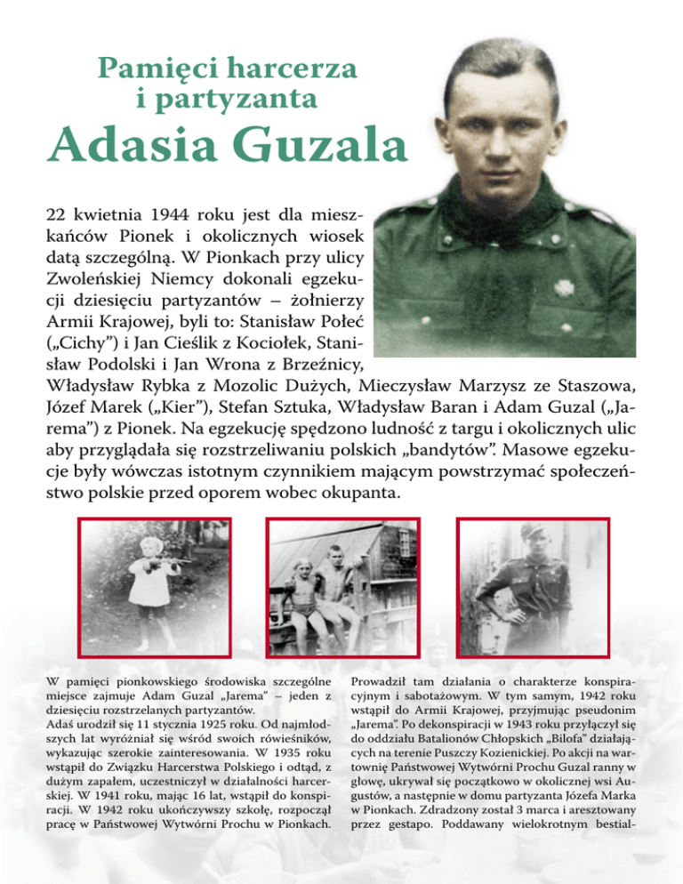 Pamięci harcerza i partyzanta Adasia Guzala 22 kwietnia 1944 roku jest dla mieszkańców Pionek i okolicznych wiosek datą szczególną. W Pionkach przy ulicy Zwoleńskiej Niemcy dokonali egzekucji dziesięciu partyzantów – żołnierzy Armii Krajowej, byli to: Stanisław Połeć („Cichy”) i Jan Cieślik z Kociołek, Stanisław Podolski i Jan Wrona z Brzeźnicy, Władysław Rybka z Mozolic Dużych, Mieczysław Marzysz ze Staszowa, Józef Marek („Kier”), Stefan Sztuka, Władysław Baran i Adam Guzal („Jarema”) z Pionek. Na egzekucję spędzono ludność z targu i okolicznych ulic aby przyglądała się rozstrzeliwaniu polskich „bandytów”. Masowe egzekucje były wówczas istotnym czynnikiem mającym powstrzymać społeczeństwo polskie przed oporem wobec okupanta. W pamięci pionkowskiego środowiska szczególne miejsce zajmuje Adam Guzal „Jarema” – jeden z dziesięciu rozstrzelanych partyzantów. Adaś urodził się 11 stycznia 1925 roku. Od najmłodszych lat wyróżniał się wśród swoich rówieśników, wykazując szerokie zainteresowania. W 1935 roku wstąpił do Związku Harcerstwa Polskiego i odtąd, z dużym zapałem, uczestniczył w działalności harcerskiej. W 1941 roku, mając 16 lat, wstąpił do konspiracji. W 1942 roku ukończywszy szkołę, rozpoczął pracę w Państwowej Wytwórni Prochu w Pionkach. Prowadził tam działania o charakterze konspiracyjnym i sabotażowym. W tym samym, 1942 roku wstąpił do Armii Krajowej, przyjmując pseudonim „Jarema”. Po dekonspiracji w 1943 roku przyłączył się do oddziału Batalionów Chłopskich „Bilofa” działających na terenie Puszczy Kozienickiej. Po akcji na wartownię Państwowej Wytwórni Prochu Guzal ranny w głowę, ukrywał się początkowo w okolicznej wsi Augustów, a następnie w domu partyzanta Józefa Marka w Pionkach. Zdradzony został 3 marca i aresztowany przez gestapo. Poddawany wielokrotnym bestial- Naszym celem jest ocalić od zapomnienia chwalebne czyny Adasia i innych żołnierzy, które do naszego miasta wniosły powiew Wielkości. Czym jest owa Wielkość? Jest to Wielkość Czynu, który nie przemija wraz z życiem jego autora pozostając w pamięci następnych pokoleń. Adaś Guza spełnia rolę wzorca wychowawczego dla przyszłych pokoleń dzieci i młodzieży. skim torturom w radomskim więzieniu nie wydał swoich towarzyszy walki. Podczas egzekucji po odczytaniu przez niemieckiego oficera wyroku skazującego na śmierć za działalność z bronią w ręku Adaś zdążył krzyknąć „Niech żyje Polska!”. Posypały się wówczas salwy z karabinów maszynowych, skazani osunęli się na ziemię. Werkschutz kulami z pistoletu dobił rannych. Ciała zabitych przewieziono wozem konnym i zakopano w dole na odpadki, na końskim cmentarzu. Ostatnią drogę przeszedł Adaś Guzal 8 kwietnia 1945 roku. Tego dnia dokonano ekshumacji zwłok ze zbiorowych mogił Polaków poległych w walce o wyzwolenie Ojczyzny spod okupacji hitlerowskiej. Po uroczystej mszy świętej polowej trumny przeniesiono na nowy cmentarz gdzie spoczęły na tzw. Górce Partyzantów. Adaś Guzal pozostał w pamięci środowiska lokalnego jako bohater: harcerz i partyzant, jako wzór patriotyzmu i oddania ukochanej Ojczyźnie. W miejscu rozstrzelania gdzie 22 kwietnia 1944 roku odbyła się egzekucja, znajduje się obecnie ufundowany przez mieszkańców Pionek pomnik, który upamiętnia ów dzień i rozstrzelanych Polaków. Co roku w kolejne rocznice tragicznego wydarzenia odprawiane są przy pomniku msze święte. Ulotka wydana ze środków: 24. Ogólnopolskie Puszczañskie Harce dofinansowali: Ministerstwa Obrony Narodowej Ministerstwo Obrony Narodowej Urzędu do Spraw Kombatantów i Osób Represjonowanych Urz¹d Marsza³kowski Województwa Mazowieckiego w ramach realizowanego Projektu „Pamięci harcerza i partyzanta Adasia Guzala”. Miasteczko zlotowe: Leœna polana - posada za by³¹ siedzib¹ Nadleœnictwa Kozienice w Pionkach, wjazd od ulicy dr Marii Garszwo (droga wylotowa na wieœ Januszno). Komendant Obchodów 95-lecia Harcerstwa: hm. Tomasz Wyroœlak HR, tel. 0-607070985 (potwierdzenie udzia³u) „Pozwólcie, że my, żyjący staniemy się spadkobiercami Waszego ducha. Pozwólcie, że z Waszych skostniałych rąk weźmiemy Testament pisany krwią dla potomnych, a z Testamentu tego głęboko w sercach utrwalimy naczelne słowa: Bóg i Ojczyzna. Młodzieży droga! Złóż Ślubowanie, że Testamentu tego w życiu dochowasz, złóż ślubowanie, że Bogu i Ojczyźnie w zgodzie i w harmonii służyć będziesz. Złóż ślubowanie, że nie zapomnisz chwil stracenia Twego drogiego Kolegi Adasia Guzala i Jego towarzyszów śmierci, że podejmiesz, niby chór milionowy i przekażesz całemu światu Jego i Ich ostatni krzyk „Niech żyje Polska!” Młodzieży! Złóż ślubowanie, że ta Polska żyć będzie Twoim szlachetnym życiem. Idźcie do ziemi umarli, zamordowani Przyjaciele, Koledzy! Niech ta ziemia, od wieków zmieszana z krwią, co tak często tuliła Was do siebie za życia, utuli do snu wieczystego – snu o Polsce! Wystawimy Wam tu pomnik z serc całego narodu, a na nim napis: Z ducha Waszego my wszyscy! A komu ręce do pracy dla Ojczyzny opadać będą, przyjdzie tu po wzmocnienie; a komu w życiu zabraknie wielkich ideałów, tu również po nie przyjdzie!” Ostatnie pożegnanie Ks. Józefa Giżyckiego