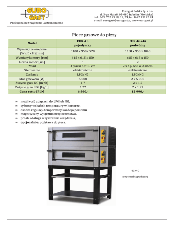 Eurogast Polska Sp. z o.o. ul. 3-go Maja 8, 05-080 Izabelin (Mościska) tel.: 0-22 752 25 18, 19, 23, fax: 0-22 752 25 24 e-mail: [email protected], www.eurogast.pl Profesjonalne Urządzenia Gastronomiczne Piece gazowe do pizzy Model Wymiary zewnętrzne (W x D x H) [mm] Wymiary komory [mm] Liczba komór [szt.] Wsad Sterowanie Zasilanie Moc grzewcza [W] Zużycie gazu NG [m3/h] Zużycie gazu LPG [kg/h] Cena netto [PLN] • • • • • • EUR.4 G pojedynczy EUR.4G+4G podwójny 1100 x 950 x 520 1100 x 950 x 1040 615 x 615 x 150 1 4 placki o Ø 30 cm elektroniczne LPG/NG 5 000 1,7 1,27 6 860,- 615 x 615 x 150 2 2 x 4 placki o Ø 30 cm elektroniczne LPG/NG 2 x 5 000 2 x 1,7 2 x 1,27 12 990,- możliwość adaptacji do LPG lub NG, cyfrowy wskaźnik temperatury w komorze, osobna regulacja temperatury każdego poziomu, magnetyczny wyłącznik bezpieczeństwa, prosta obsługa i czyszczenie urządzenia, opcjonalnie: podstawa do pieca. 4G+4G z opcjonalną podstawą