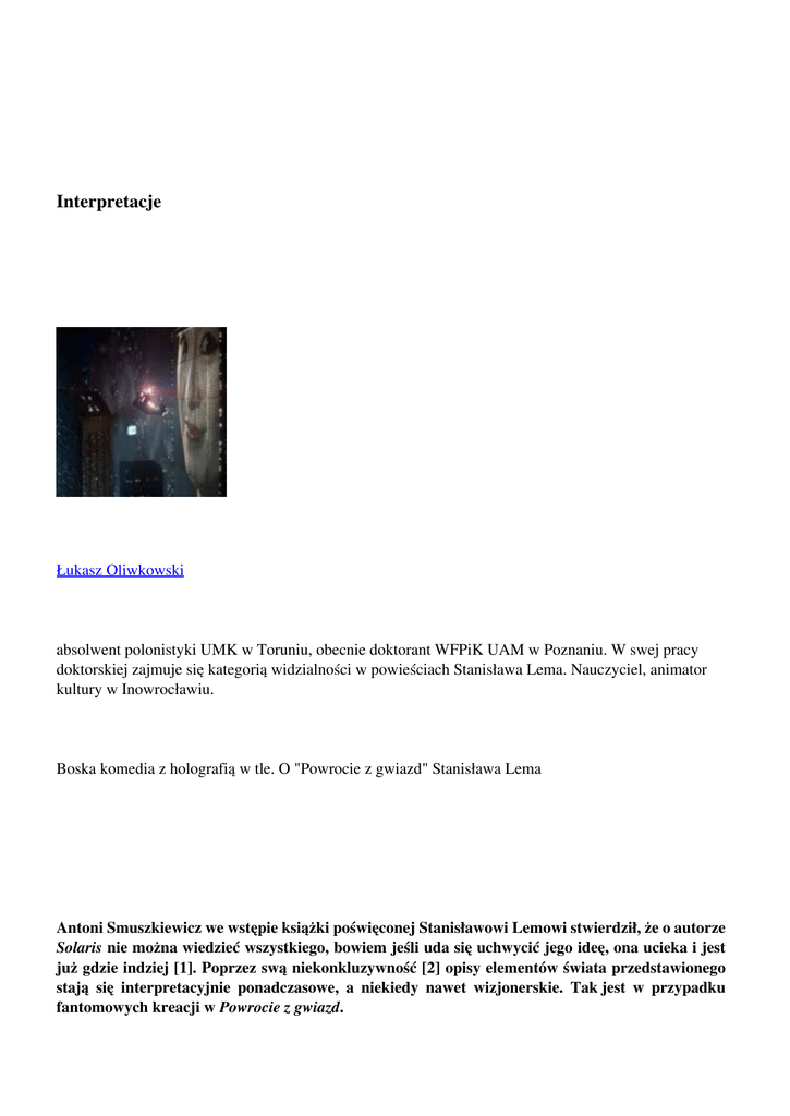 Interpretacje Łukasz Oliwkowski absolwent polonistyki UMK w Toruniu, obecnie doktorant WFPiK UAM w Poznaniu. W swej pracy doktorskiej zajmuje się kategorią widzialności w powieściach Stanisława Lema. Nauczyciel, animator kultury w Inowrocławiu. Boska komedia z holografią w tle. O "Powrocie z gwiazd" Stanisława Lema Antoni Smuszkiewicz we wstępie książki poświęconej Stanisławowi Lemowi stwierdził, że o autorze Solaris nie można wiedzieć wszystkiego, bowiem jeśli uda się uchwycić jego ideę, ona ucieka i jest już gdzie indziej [1]. Poprzez swą niekonkluzywność [2] opisy elementów świata przedstawionego stają się interpretacyjnie ponadczasowe, a niekiedy nawet wizjonerskie. Tak jest w przypadku fantomowych kreacji w Powrocie z gwiazd. 3 D według Lema i Baudrillarda Avatar Jamesa Camerona miał być przełomem w kinie, głównie z powodu trójwymiarowej animacji komputerowej. Przełom jednak nie nastąpił [3]. Prezentowanie filmów w technologii 3D wydaje się być wciąż zabiegiem jedynie o charakterze ludycznym; nadal mało filmów, które umożliwiłyby potraktowanie hiperrealnego obrazu jako semantycznego kodu wizualnego [4]. Semiotyka kinowego trójwymiaru ma na razie niesprecyzowaną funkcję. Potraktowany jako rozwinięcie konturowości obrazu filmowego rości on sobie prawo do bycia podstawowym wizualnym zadaniem strukturalnym, ale na tym jego zadanie wyczerpuje się [5]. Rzec co najwyżej można, że semiotycznym fundamentem wszelkich nowych powstających systemów – np. 3D, holografii - jest ich wielomedialność [6]. Na fakt wykorzystania technologii 3D we współczesnym kinie, warto spojrzeć w perspektywie zaproponowanej przez Jeana Baudrillarda, który niemalże profetycznie pisał w Symulakrach i symulacjach: „Stworzenie trójwymiarowego kina jest w nie większym stopniu przeznaczeniem hologramu niż przeznaczeniem kina było odtworzenie teatru, a fotografii – podjęcie na nowo tematów malarstwa” [7]. Francuski filozof przewidywał więc, że stworzenie technologii 3D jest efektem naturalnego procesu ewolucji ludzkiej percepcji. Technologia podejmuje wątek biologicznego samodoskonalenia. Arnheim pisał, iż wśród wynalazków technicznych, które mają zmniejszyć dysproporcję pomiędzy zainteresowaniami człowieka, a możliwościami jego zmysłów, jest telewizja, choć myślał – formułując tę konstatację - jedynie o dwuwymiarowym tworzeniu obrazów [8]. Trójwymiarowe kino realizuje więc jeszcze bardziej wizualne (celowo brzmi to tautologicznie) marzenia ludzkiego umysłu. Myślicielem, który – sięgając do konwencji powieści fantastyczno-naukowej – przedstawił społeczeństwo wiecznego karnawału, ludzi traktujących trójwymiarowe artefakty jako przejaw zdewaluowanej sztuki, był Stanisław Lem. Oto obraz trójwymiarowego kina w Powrocie z gwiazd, powieści z 1961 roku: „Odskoczyłem, ukazał się wtedy właściciel głosu, ten gruby w czapce — chciałem go chwycić za ramię, palce przeszły na wylot i zamknęły się w powietrzu. Stałem jak ogłuszony, a oni gadali dalej; naraz wydało mi się, że z ciemności ponad autami, z góry, ktoś na mnie patrzy, zbliżyłem się do granicy światła i zobaczyłem blade plamy twarzy, był tam, w górze, jak gdyby balkon. Oślepiony, nie widziałem dokładnie, dość jednak, aby pojąć, jak okropnie się zbłaźniłem. Uciekłem, jakby mnie kto gonił” [9]. Holografia wywołuje u Hala Bregga – astronauty, głównego bohatera powieści, ofiary relatywizmu czasowego - „szok przyszłości”. Mówi on wielokrotnie, że czuje się w społeczeństwie przyszłości jak barbarzyńca. Najbardziej szokuje go jednak widzialna strona rzeczywistości. Można by tu zacytować McLuhana, który interpretując wiersz Wallace'a Stevensa stwierdził, że najmniejsza metamorfoza w obrębie świata wizualnego wywołuje delikatną zmianę w naszym odczuciu samych siebie, zarówno osobistym, jak i zbiorowym [10]. Bregg nie jest świadkiem małej przemiany wokół siebie – jej skala daje szanse na przekroczenie granic adaptacyjnych, a to z kolei – jak pisał autor Szoku przyszłości – może spowodować objawy psychopatologiczne [11]. Wracając do Baudrillarda: holografia, która jest podstawową metodą zapisu i odtwarzania trójwymiarowego obrazu, stanowi w ujęciu francuskiego badacza realizację fantazmatu spotkania swojego sobowtóra. Człowiek dąży w istocie do tego, aby uczynić swe odbicie coraz bardziej perfekcyjnym, aby stworzyć swą wizualną kopię, symulację swojego in statu nascendi. „Po fantazmacie ujrzenia samego siebie nadchodzi fantazmat możliwości obejścia samego siebie, a w końcu i przede wszystkim fantazmat przeniknięcia przez samego siebie” [12]. Realizacja fantazmatu, którego źródła sięgają mitu o Narcyzie dokonuje się także w Pałacu Merlina, miejscu, do którego opisu jeszcze powrócę: „Naraz moje odbicie spojrzało na mnie. Ten ruch nie był odzwierciedleniem mojego. Zastygłem, a tamten, wielki, barczysty, powoli popatrzał najpierw na ciemnowłosą kobietę, potem na jej towarzysza — żadne z nas nie poruszało się i tylko odbicia, usamodzielnione w jakiś niepojęty sposób, ożyły i rozegrały między sobą milczącą scenę” [13]. Ewolucja udoskonalania własnego odbicia związana jest oczywiście ze zmianą percepcji z takiej, która przystosowana była do odbioru druku i dwuwymiarowego obrazu, później zmodyfikowana została do percepcji audiowizualnej, aby wreszcie dostosować się do świata multimediów czy, w końcu, świata wirtualnego. W tym miejscu pojawia się jednak problem, ponieważ funkcjonowanie w świecie wirtualnym wiązać się może z dewaluacją kategorii umowności świata hologramów. Człowiek – jak powiedziano wcześniej – dąży do wytworzenia kopii samego siebie. Jednak paradoksalnie pełną satysfakcję dać mu może jedynie świadomość obcowania z wytworem techniki, z kopią niedo