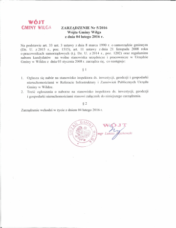 WÓJT GMINY WILGA ZARZĄDZENIE Nr 5/2016 Wójta Gminy Wilga z dnia 04 lutego 2016 r. Na podstawie art. 33 ust. 3 ustawy z dnia 8 marca 1990 r. o samorządzie gminnym (Dz. U. z 2015 r., poz. 1515), art. 11 ustawy z dnia 21 listopada 2008 roku o pracownikach samorządowych (tj. Dz. U. z 2014 r., poz. 1202) oraz regulaminu naboru kandydatów na wolne stanowiska urzędnicze i pracownicze w Urzędzie Gminy w Wildze z dnia 03 stycznia 2008 r. zarządza się, co następuje: §l 1. Ogłasza się nabór na stanowisko nieruchomościami 2. w Referacie Gminy w Wildze. Treść ogłoszenia o naborze i gospodarki nieruchomościami inspektora ds. inwestycji, Infrastruktury na stanowisko i Zamówień inspektora Publicznych ds. inwestycji, Urzędu geodezji stanowi załącznik do niniejszego zarządzenia. §2 Zarządzenie geodezji i gospodarki wchodzi w życie z dniem 04 lutego 2016 r. Załącznik do zarządzenia Wójta Gminy Wilga Nr 5/2016 z dnia 4 lutego 2016 r. Wójt Gminy Wilga ogłasza nabór kandydatów na wolne stanowisko urzędnicze w Urzędzie Gminy Wilga ul. Warszawska 38, 08-470 Wilga Inspektor ds. inwestycji, geodezji i gospodarki nieruchomościami w Referacie Infrastruktury i Zamówień Publicznych Urzędu Gminy w Wildze Zakres zadań wykonywanych na stanowisku: 1. Realizacja zadań inwestycyjnych, remontowych, związanych z utrzymaniem obiektów, wykonywanie i opiniowanie projektów organizacji i inwestycji. Realizacja zadań inwestycyjnych i remontowych w zakresie formalnego przygotowania oraz zakończenia inwestycji (sprawy własnościowe nieruchomości, pozwolenie na budowę, użytkowanie) rozliczenia inwestycji (fakturowanie) oraz w zakresie przygotowania inwestycji, nadzoru inwestorskiego w trakcie realizacji inwestycji oraz przekazywanie do użytkowania. 2. Nadzór nad realizacją zadań w ramach ustawy prawo budowlane, zamówień publicznych, zagospodarowania przestrzennego, prawo ochrony środowiska, gospodarki nieruchomościami, geologiczne, wodne. 3. Realizacja zadań w ramach ustawy prawo budowlane, zamówień publicznych, zagospodarowania przestrzennego, prawo ochrony środowiska, gospodarki nieruchomościami, kpa, kc. realizacja zadań w zakresie przygotowywan.ia założeń rzeczowo-finansowych i planów inwestycyjnych w zakresie utrzymania, remontów obiektów, w tym pozyskiwanie wykonawców robót i usług w trybie ustawy Prawo Zamówień Publicznych, współpraca z komórkami organizacyjnymi Urzędu, jednostkami organizacyjnymi Gminy, Policją oraz innymi podmiotami i organami w zakresie prowadzonych spraw, nadzór i ocena realizacji zadań, ocena ryzyka, pełnienie funkcji inspektora nadzoru. 4. Regulacja praw do nieruchomości na rzecz ich posiadaczy bez tytułu prawnego, opłaty adiacenckie, zgody właścicielskie, przygotowanie nieruchomości do zbycia. 5. Przygotowywanie projektów oświadczeń o prawie do dysponowania nieruchomością na cele budowlane oraz zgód właścicielskich, . 6. Przygotowywanie odwołań, wniosków o wznowienie postępowania, zmianę, uchylenie za zgodą stron lub stwierdzenie nieważności decyzji administracyjnych dotyczących warunków zabudowy oraz zatwierdzających projekt budowlany 7. 8. 9. 10. 11. i zezwalających na budowę obiektów budowlanych związanych z udziałem Gminy Wilga. Podejmowanie czynności związanych z rozpatrywaniem wniosków o zmianę umów użytkowania wieczystego w zakresie sposobu zagospodarowania. Przenoszenie własności lub oddawanie w użytkowanie wieczyste nieruchomości w trybie art. 209a ugn oraz prowadzenie korespondencji z tym związanej z innymi komórkami organizacyjnymi urzędu. Prowadzenie spraw z zakresu geodezji i kartografii dotyczących: zasadniczej mapy miasta, i geodezyjnej Ewidencja sieci uzbrojenia terenu, prowadzenie spraw z zakresu gromadzenia i prowadzenia powiatowego zasobu geodezyjnego i kartograficznego, w tym: aktualizacja baz danych zasobu. Charakterystyka pracy: aktualizacja treści numerycznej mapy zasadniczej, weryfikacja danych numerycznych z opracowań geodezyjnych, przekształcanie analogowej mapy zasadniczej do postaci numerycznej. Informacja o warunkach pracy na danym stanowisku Praca w budynku Urzędu i poza nim. Budynek niedostosowany dla osób niedowidzących i niewidzących. Budynek, ciągi komunikacyjne o szerokości umożliwiającej poruszanie się wózkiem inwalidzkim. Toalety niedostosowane do poruszania się wózkiem inwalidzkim. Stanowisko pracy Stanowisko pracy związane jest z pracą przy komputerze, przemieszczaniem się wewnątrz budynku i w terenie oraz bezpośrednią i telefoniczną obsługa klienta. Na stanowisku pracy brak specjalistycznych urządzeń umożliwiających pracę osobom niewidomym Wymagania niezbędne: • obywatelstwo polskie • pełna zdolność do czynności prawnych oraz korzystanie z pełni praw publicznych • niekaralność za umyślne przestępstwo ścigane z oskarżenia publicznego lub umyślne przestępstwo skarbowe • nieposzlakowana opinia • umiejętność sprawnej obsługi komputera weryfikowana podczas rozmowy kwalifikacyjnej • wykształcenie wyższe I lub II stopnia Wymagania dodatkowe nieobowiązkowe: wykształcenie wyższe I lub II stopnia o kierunku: Geodezja, Prawo, Administracja, Zarządzanie z zakresu gospodarki nieruchomościami min.2 letni staż pracy pożądane kompetencje: samodzielność, sumienność. Wskaźnik zatrudnienia osób niepełnosprawnych: W miesiącu poprzedzającym datę upublicznienia ogłoszenia wskaźnik zatrudnienia osób niepełnosprawnych w jednostce, w rozumieniu przepisów o rehabilitacji zawodowej i społecznej oraz zatrudnianiu osób niepełnosprawnych, jest niższy niż 6 % Wymagane dokumenty i oświadczeni 1) 2) 3) 4) curriculum vitae z przebiegiem nauki i pracy zawodowej, list motywacyjny, kserokopia dyplomu ukończenia studiów wyższych I lub II stopnia, kserokopie świadectw pracy dokumentujących wymagany staż pracy lub zaświadczenie o zatrudnieniu, zawierające okres zatrudnienia, w pr