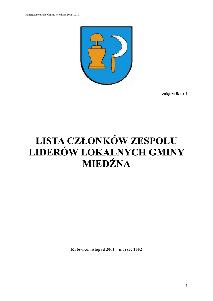 Strategia Rozwoju Gminy Miedźna 2001-2010 załącznik nr 1 LISTA CZŁONKÓW ZESPOŁU LIDERÓW LOKALNYCH GMINY MIEDŹNA Katowice, listopad 2001 – marzec 2002 1 Strategia Rozwoju Gminy Miedźna 2001-2010 Lista uczestników Zespołu Liderów Lokalnych Gminy Miedźna. Lp. Nazwisko i imię w porządku alfabetycznym 1. Bandoła Barbara 2. Bartosz Antoni 3. Bratek Augustyn 4. Chrostek Alojzy 5. Cofała Jan 6. Czarnota Tadeusz 7. Czech Bernadeta 8. Czysz Józef 9. Czyż Stanisław 10. Domżoł Renata 11. Faltus Piotr 12. Gruszka Antoni 13. Gwóźdź Anna 14. Jakut Magdalena 15. Jeleń Janina 16. Karbowy Stanisław 17. Kazimierczak Elżbieta 18. Klenczar Franciszek 19. Koczor Józef 20. Korkosz Marianna 21. Krawczyk Dariusz 22. Kwiecień Zbigniew 23. Lewandowska Sławomira 24. Limańczyk Andrzej 25. Lukasek Bronisław 26. Madeja Henryka 27. Matjasowicz Adam 28. Matyrzkiewicz Grażyna 29. Michalska Regina 30. Mika Maria 31. Miszczak-Kowalska Edyta 32. Morkisz Bożena 33. Norek Jan 34. Nowak Andrzej 35. Pająk Roman 36. Palka Alicja Instytucja Zespół Oświaty i Wychowania KWK Piast Izba Rolnicza „Chrostek” Sołtys - Miedźna „WolTer” sp. z o.o. Starostwo Powiatowe Pszczyna Bank Spółdzielczy Miedźna Spółdzielnia Kółek Rolniczych Sekretarz Gminy Centrum Przedsiębiorczości w Woli Rada Gminy Skarbnik Gminy Starostwo Powiatowe Pszczyna Urząd Gminy Zarząd Gminy Urząd Gminy Zarząd Gminy „Dendrobud” Zespół Oświaty i Wychowania Zastępca Wójta Gminy „DELTA” sp. z o.o. Urząd Gminy „Limańczyk” Sołtys - Gilowice Gminny Ośrodek Kultury Rada Gminy Zespół Oświaty i Wychowania PKO BP S.A. Sołtys - Grzawa Rada Gminy, NZOZ Medyk Zespół Oświaty i Wychowania Sołtys - Wola „WolTer” sp. z o.o. Gminny Zakład Inżynierii Komunalnej Urząd Gminy 2 Strategia Rozwoju Gminy Miedźna 2001-2010 37. 38. 39. 40. 41. 42. 43. 44. 45. 46. 47. 48. 49. Pawela Tadeusz Pikania Henryk Przewoźnik Tadeusz Rąba Teofil Soja Stanisław Stańczyk Andrzej Szczepanek Maria Taranowski Bogdan Wasztyl Antoni Wilk Danuta Wiśniewska Ewa Wroński Grzegorz Zachariasz Czesław Urząd Gminy Przewodniczący Rady Osiedla Wola II Sołtys - Frydek Sołtys - Góra Przewodniczący Rady Osiedla Wola I Rada Gminy Urząd Gminy Wójt Gminy Ochotnicza Straż Pożarna Urząd Gminy Starostwo Powiatowe Pszczyna „SILESIA” S.A. Urząd Gminy 3