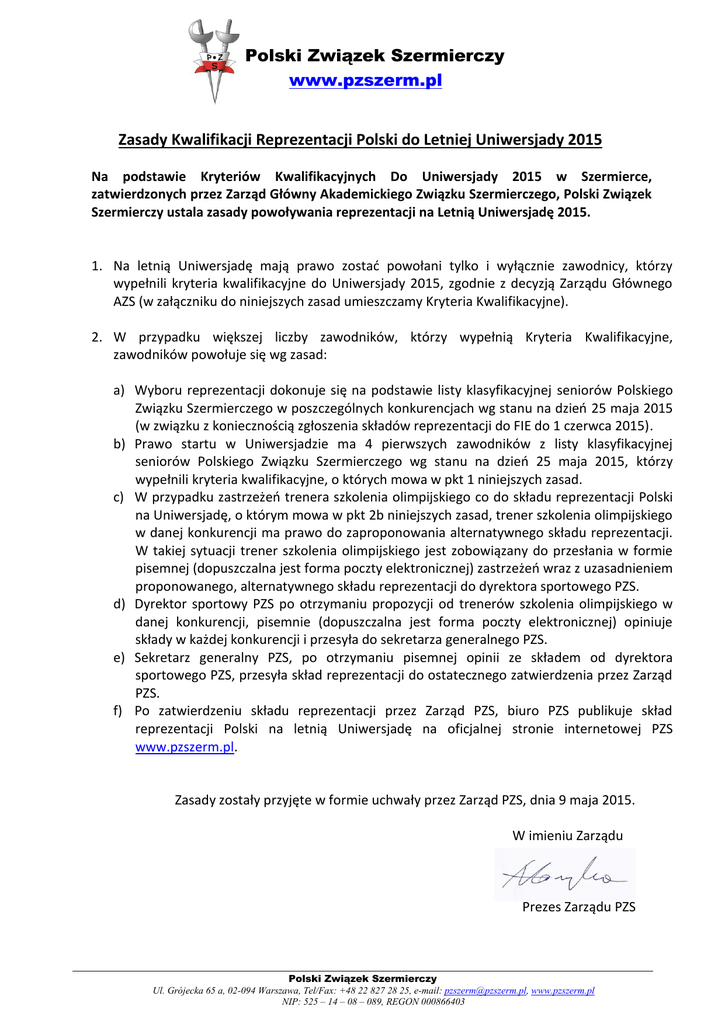 Polski Związek Szermierczy www.pzszerm.pl Zasady Kwalifikacji Reprezentacji Polski do Letniej Uniwersjady 2015 Na podstawie Kryteriów Kwalifikacyjnych Do Uniwersjady 2015 w Szermierce, zatwierdzonych przez Zarząd Główny Akademickiego Związku Szermierczego, Polski Związek Szermierczy ustala zasady powoływania reprezentacji na Letnią Uniwersjadę 2015. 1. Na letnią Uniwersjadę mają prawo zostać powołani tylko i wyłącznie zawodnicy, którzy wypełnili kryteria kwalifikacyjne do Uniwersjady 2015, zgodnie z decyzją Zarządu Głównego AZS (w załączniku do niniejszych zasad umieszczamy Kryteria Kwalifikacyjne). 2. W przypadku większej liczby zawodników, którzy wypełnią Kryteria Kwalifikacyjne, zawodników powołuje się wg zasad: a) Wyboru reprezentacji dokonuje się na podstawie listy klasyfikacyjnej seniorów Polskiego Związku Szermierczego w poszczególnych konkurencjach wg stanu na dzień 25 maja 2015 (w związku z koniecznością zgłoszenia składów reprezentacji do FIE do 1 czerwca 2015). b) Prawo startu w Uniwersjadzie ma 4 pierwszych zawodników z listy klasyfikacyjnej seniorów Polskiego Związku Szermierczego wg stanu na dzień 25 maja 2015, którzy wypełnili kryteria kwalifikacyjne, o których mowa w pkt 1 niniejszych zasad. c) W przypadku zastrzeżeń trenera szkolenia olimpijskiego co do składu reprezentacji Polski na Uniwersjadę, o którym mowa w pkt 2b niniejszych zasad, trener szkolenia olimpijskiego w danej konkurencji ma prawo do zaproponowania alternatywnego składu reprezentacji. W takiej sytuacji trener szkolenia olimpijskiego jest zobowiązany do przesłania w formie pisemnej (dopuszczalna jest forma poczty elektronicznej) zastrzeżeń wraz z uzasadnieniem proponowanego, alternatywnego składu reprezentacji do dyrektora sportowego PZS. d) Dyrektor sportowy PZS po otrzymaniu propozycji od trenerów szkolenia olimpijskiego w danej konkurencji, pisemnie (dopuszczalna jest forma poczty elektronicznej) opiniuje składy w każdej konkurencji i przesyła do sekretarza generalnego PZS. e) Sekretarz generalny PZS, po otrzymaniu pisemnej opinii ze składem od dyrektora sportowego PZS, przesyła skład reprezentacji do ostatecznego zatwierdzenia przez Zarząd PZS. f) Po zatwierdzeniu składu reprezentacji przez Zarząd PZS, biuro PZS publikuje skład reprezentacji Polski na letnią Uniwersjadę na oficjalnej stronie internetowej PZS www.pzszerm.pl. Zasady zostały przyjęte w formie uchwały przez Zarząd PZS, dnia 9 maja 2015. W imieniu Zarządu Adam Konopka Prezes Zarządu PZS Polski Związek Szermierczy Ul. Grójecka 65 a, 02-094 Warszawa, Tel/Fax: +48 22 827 28 25, e-mail: [email protected], www.pzszerm.pl NIP: 525 – 14 – 08 – 089, REGON 000866403