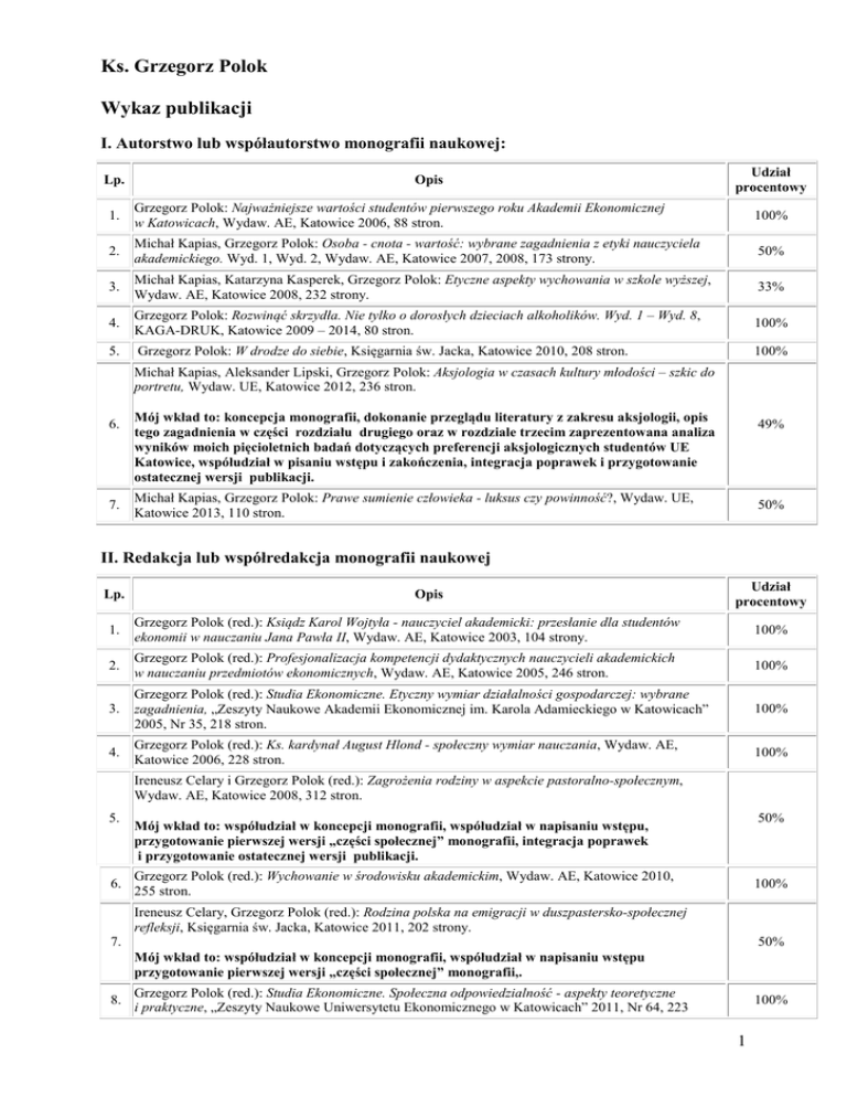 Ks. Grzegorz Polok Wykaz publikacji I. Autorstwo lub współautorstwo monografii naukowej: Lp. Opis Udział procentowy 1. Grzegorz Polok: Najważniejsze wartości studentów pierwszego roku Akademii Ekonomicznej w Katowicach, Wydaw. AE, Katowice 2006, 88 stron. 100% 2. Michał Kapias, Grzegorz Polok: Osoba - cnota - wartość: wybrane zagadnienia z etyki nauczyciela akademickiego. Wyd. 1, Wyd. 2, Wydaw. AE, Katowice 2007, 2008, 173 strony. 50% 3. Michał Kapias, Katarzyna Kasperek, Grzegorz Polok: Etyczne aspekty wychowania w szkole wyższej, Wydaw. AE, Katowice 2008, 232 strony. 33% 4. Grzegorz Polok: Rozwinąć skrzydła. Nie tylko o dorosłych dzieciach alkoholików. Wyd. 1 – Wyd. 8, KAGA-DRUK, Katowice 2009 – 2014, 80 stron. 100% 5. Grzegorz Polok: W drodze do siebie, Księgarnia św. Jacka, Katowice 2010, 208 stron. 100% Michał Kapias, Aleksander Lipski, Grzegorz Polok: Aksjologia w czasach kultury młodości – szkic do portretu, Wydaw. UE, Katowice 2012, 236 stron. 6. 7. Mój wkład to: koncepcja monografii, dokonanie przeglądu literatury z zakresu aksjologii, opis tego zagadnienia w części rozdziału drugiego oraz w rozdziale trzecim zaprezentowana analiza wyników moich pięcioletnich badań dotyczących preferencji aksjologicznych studentów UE Katowice, współudział w pisaniu wstępu i zakończenia, integracja poprawek i przygotowanie ostatecznej wersji publikacji. 49% Michał Kapias, Grzegorz Polok: Prawe sumienie człowieka - luksus czy powinność?, Wydaw. UE, Katowice 2013, 110 stron. 50% II. Redakcja lub współredakcja monografii naukowej Lp. Opis Udział procentowy 1. Grzegorz Polok (red.): Ksiądz Karol Wojtyła - nauczyciel akademicki: przesłanie dla studentów ekonomii w nauczaniu Jana Pawła II, Wydaw. AE, Katowice 2003, 104 strony. 100% 2. Grzegorz Polok (red.): Profesjonalizacja kompetencji dydaktycznych nauczycieli akademickich w nauczaniu przedmiotów ekonomicznych, Wydaw. AE, Katowice 2005, 246 stron. 100% 3. Grzegorz Polok (red.): Studia Ekonomiczne. Etyczny wymiar działalności gospodarczej: wybrane zagadnienia, „Zeszyty Naukowe Akademii Ekonomicznej im. Karola Adamieckiego w Katowicach” 2005, Nr 35, 218 stron. 100% 4. Grzegorz Polok (red.): Ks. kardynał August Hlond - społeczny wymiar nauczania, Wydaw. AE, Katowice 2006, 228 stron. 100% Ireneusz Celary i Grzegorz Polok (red.): Zagrożenia rodziny w aspekcie pastoralno-społecznym, Wydaw. AE, Katowice 2008, 312 stron. 5. 6. 50% Mój wkład to: współudział w koncepcji monografii, współudział w napisaniu wstępu, przygotowanie pierwszej wersji „części społecznej” monografii, integracja poprawek i przygotowanie ostatecznej wersji publikacji. Grzegorz Polok (red.): Wychowanie w środowisku akademickim, Wydaw. AE, Katowice 2010, 255 stron. 100% Ireneusz Celary, Grzegorz Polok (red.): Rodzina polska na emigracji w duszpastersko-społecznej refleksji, Księgarnia św. Jacka, Katowice 2011, 202 strony. 7. 50% Mój wkład to: współudział w koncepcji monografii, współudział w napisaniu wstępu przygotowanie pierwszej wersji „części społecznej” monografii,. 8. Grzegorz Polok (red.): Studia Ekonomiczne. Społeczna odpowiedzialność - aspekty teoretyczne i praktyczne, „Zeszyty Naukowe Uniwersytetu Ekonomicznego w Katowicach” 2011, Nr 64, 223 100% 1 strony. 9. Ireneusz Celary, Grzegorz Polok (red. nauk.): Homo oeconomicus w pastoralno-społecznej przestrzeni, Wydział Teologiczny Uniwersytetu Śląskiego w Katowicach, Księgarnia św. Jacka, Katowice 2013, 263 strony. 50% Mój wkład to: współudział w koncepcji monografii, współudział w napisaniu wstępu przygotowanie pierwszej wersji „części społecznej” monografii. Ireneusz Celary, Grzegorz Polok (red.): Odpowiedzialność w przestrzeni społeczno-pastoralnej, Wydaw. UE, Katowice 2013, 364 strony. 10. 50% Mój wkład to: współudział w koncepcji monografii, przygotowanie pierwszej wersji „części społecznej” monografii ,współudział w napisaniu wstępu, integracja poprawek i przygotowanie ostatecznej wersji publikacji. III. Autorstwo lub współautorstwo rozdziału w monografii naukowej: Lp. Opis Udział procentowy 1. Grzegorz Polok: Ksiądz Karol Wojtyła - duszpasterz i nauczyciel akademicki - nota biograficzna, [w:] Ksiądz Karol Wojtyła - nauczyciel akademicki: przesłanie dla studentów ekonomii w nauczaniu Jana Pawła II, red. Grzegorz Polok, Wydaw. AE, Katowice 2003, s. 15-31. 100% 2. Grzegorz Polok: Rola kodeksów etycznych w regulacji zachowań podmiotów rynkowych, [w:] Konsument - przedsiębiorstwo – przestrzeń, red. nauk. Zofia Kędzior, Jan Pyka, Urszula ZagóraJonszta, Krystyna Znaniecka, Teresa Żabińska, Wydaw. AE, Centrum Badań i Ekspertyz. T. 1, Katowice 2004, s. 80-92. 100% 3. Grzegorz Polok: Sylwetka etycznego pracownika, [w:] Public relations: sztuka skutecznej komunikacji w teorii i praktyce, red. Henryk Przybylski, Wydaw. AE, Katowice 2004, s. 328-334. 100% 4. Grzegorz Polok: Asystenckie Warsztaty Pedagogiczne Akademii Ekonomicznej w Katowicach jako jedna z możliwości profesjonalizacji kompetencji dydaktycznych nauczycieli akademickich, [w:] Profesjonalizacja kompetencji dydaktycznych nauczycieli akademickich w nauczaniu przedmiotów ekonomicznych, red. Grzegorz Polok, Wydaw. AE, Katowice 2005, s. 23-30. 100% 5. Grzegorz Polok, Katarzyna Kasperek: Asystenckie Warsztaty Pedagogiczne jako element doskonalenia jakości procesu dydaktycznego w Akademii Ekonomicznej w Katowicach, [w:] Uczelnia oparta na wiedzy: organizacja procesu oraz zarządzanie wiedzą w ekonomicznym szkolnictwie wyższym, red. Tomasz Gołębiowski, Marcin Dąbrowski i Beata Mierzejewska, Fundacja Promocji i Akredytacji Kierunków Ekonomicznych, Warszawa 2005, s. 186-195. 50% Mój wkład to: współudział w koncepcji artykułu, dokonanie przeglądu literatury, przygotowanie pierwszej wersji manuskryptu. 6. Grzegorz Polok: Ksiądz Karol Wojtyła - duszpasterz i nauczyciel akademicki - nota biograficzna, 