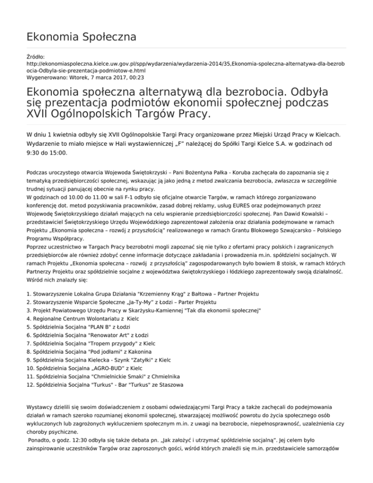 Ekonomia Społeczna Źródło: http://ekonomiaspoleczna.kielce.uw.gov.pl/spp/wydarzenia/wydarzenia-2014/35,Ekonomia-spoleczna-alternatywa-dla-bezrob ocia-Odbyla-sie-prezentacja-podmiotow-e.html Wygenerowano: Wtorek, 7 marca 2017, 00:23 Ekonomia społeczna alternatywą dla bezrobocia. Odbyła się prezentacja podmiotów ekonomii społecznej podczas XVII Ogólnopolskich Targów Pracy. W dniu 1 kwietnia odbyły się XVII Ogólnopolskie Targi Pracy organizowane przez Miejski Urząd Pracy w Kielcach. Wydarzenie to miało miejsce w Hali wystawienniczej „F” należącej do Spółki Targi Kielce S.A. w godzinach od 9:30 do 15:00. Podczas uroczystego otwarcia Wojewoda Świętokrzyski – Pani Bożentyna Pałka - Koruba zachęcała do zapoznania się z tematyką przedsiębiorczości społecznej, wskazując ją jako jedną z metod zwalczania bezrobocia, zwłaszcza w szczególnie trudnej sytuacji panującej obecnie na rynku pracy. W godzinach od 10.00 do 11.00 w sali F-1 odbyło się oficjalne otwarcie Targów, w ramach którego zorganizowano konferencję dot. metod pozyskiwania pracowników, zasad dobrej reklamy, usług EURES oraz podejmowanych przez Wojewodę Świętokrzyskiego działań mających na celu wspieranie przedsiębiorczości społecznej. Pan Dawid Kowalski – przedstawiciel Świętokrzyskiego Urzędu Wojewódzkiego zaprezentował założenia oraz działania podejmowane w ramach Projektu „Ekonomia społeczna – rozwój z przyszłością” realizowanego w ramach Grantu Blokowego Szwajcarsko – Polskiego Programu Współpracy. Poprzez uczestnictwo w Targach Pracy bezrobotni mogli zapoznać się nie tylko z ofertami pracy polskich i zagranicznych przedsiębiorców ale również zdobyć cenne informacje dotyczące zakładania i prowadzenia m.in. spółdzielni socjalnych. W ramach Projektu „Ekonomia społeczna – rozwój z przyszłością” zagospodarowanych było bowiem 8 stoisk, w ramach których Partnerzy Projektu oraz spółdzielnie socjalne z województwa świętokrzyskiego i łódzkiego zaprezentowały swoją działalność. Wśród nich znalazły się: 1. Stowarzyszenie Lokalna Grupa Działania "Krzemienny Krąg" z Bałtowa – Partner Projektu 2. Stowarzyszenie Wsparcie Społeczne „Ja-Ty-My” z Łodzi – Parter Projektu 3. Projekt Powiatowego Urzędu Pracy w Skarżysku-Kamiennej "Tak dla ekonomii społecznej" 4. Regionalne Centrum Wolontariatu z Kielc 5. Spółdzielnia Socjalna "PLAN B" z Łodzi 6. Spółdzielnia Socjalna "Renowator Art" z Łodzi 7. Spółdzielnia Socjalna "Tropem przygody" z Kielc 8. Spółdzielnia Socjalna "Pod jodłami" z Kakonina 9. Spółdzielnia Socjalna Kielecka - Szynk "Zatyłki" z Kielc 10. Spółdzielnia Socjalna „AGRO-BUD” z Kielc 11. Spółdzielnia Socjalna "Chmielnickie Smaki" z Chmielnika 12. Spółdzielnia Socjalna "Turkus" - Bar "Turkus" ze Staszowa Wystawcy dzielili się swoim doświadczeniem z osobami odwiedzającymi Targi Pracy a także zachęcali do podejmowania działań w ramach szeroko rozumianej ekonomii społecznej, stwarzającej możliwość powrotu do życia społecznego osób wykluczonych lub zagrożonych wykluczeniem społecznym m.in. z uwagi na bezrobocie, niepełnosprawność, uzależnienia czy choroby psychiczne. Ponadto, o godz. 12:30 odbyła się także debata pn. „Jak założyć i utrzymać spółdzielnie socjalną”. Jej celem było zainspirowanie uczestników Targów oraz zaproszonych gości, wśród których znaleźli się m.in. przedstawiciele samorządów lokalnych, ośrodków pomocy społecznej oraz powiatowych centrów pomocy rodzinie do podejmowania inicjatyw w ramach przedsiębiorczości społecznej. Spotkanie poprowadził Pan Dariusz Krajewski reprezentujący Stowarzyszenie Wsparcie Społeczne „Ja-Ty-My” z Łodzi. Wśród panelistów znaleźli się: - Pan Jarosław Kuba – Prezes Stowarzyszenia Lokalna Grupa Działania „Krzemienny Krąg” z Bałtowa - Pan Michał Braun – Prezes Regionalnego Centrum Wolontariatu z Kielc - Pani Katarzyna Santy - Stowarzyszenie Wsparcie Społeczne „Ja-Ty-My” z Łodzi. - Pan Roman Białek – Dyrektor Powiatowego Urzędu Pracy w Skarżysku-Kamiennej - Pani Emilia Banasiak – Spółdzielnia Socjalna „Plan B” z Łodzi - Pan Marcin Jedliński – Spółdzielnia Socjalna „Tropem Przygody” z Kielc Uczestnicy debaty dzielili się wiedzą w zakresie dobrych praktyk, nie unikając jednak wskazywania trudności związanych z prowadzeniem spółdzielni socjalnych. Podkreślono także szczególną rolę partnerstw pomiędzy podmiotami ekonomii społecznej a władzami samorządowymi. Wojewoda Świętokrzyski - Pani Bożentyna Pałka Koruba podczas oficjalnego otwarcia Targów Pan Dawid Kowalski - przedstawiciel Świętokrzyskiego Urzędu Wojewódzkiego Pan Dawid Kowalski przedstawiciel Świętokrzyskiego Urzędu Wojewódzkiego Stoisko zagospodarowane przez Świetokrzyski Urząd Wojewódzki w Kielcach oraz Stowarzyszenie Wsparcie Społeczne "Ja-TY-My" z Łodzi Przedstawiciele Spółdzielni Socjalnej "Plan B" oraz "Renowator Art" z Łodzi Przedsatwiciele Spółdzielni Socjalnej "Tropem Przygody" oraz "Pod Jodłami" Stoisko Stowarzyszenia Lokalna Grupa Działania "Krzemienny Krąg" z Bałtowa Panel dyskusyjny "Jak założyć i utrzymać spółdzielnie socjalną" Paneliści- od lewej, Pan Michał Braun, Pan Jarosław Kuba, Pani Katarzyna Santy, Pan Roman Białek, Pani Emilia Banasiak, Pan Marcin Jedliński Załączniki do strony "Ekonomia społeczna-rozwój z przyszłością" 1.52 MB Data publikacji 02.04.2014 09:00 Drukuj Generuj PDF Powiadom znajomego Wstecz