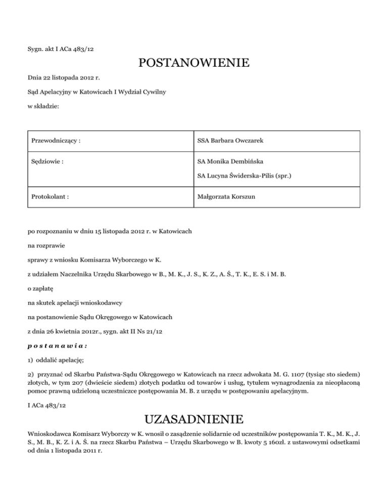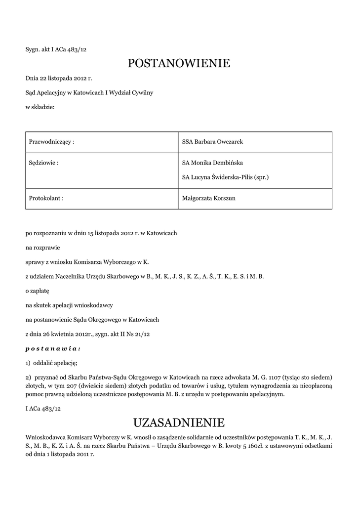 Sygn. akt I ACa 483/12 POSTANOWIENIE Dnia 22 listopada 2012 r. Sąd Apelacyjny w Katowicach I Wydział Cywilny w składzie: Przewodniczący : SSA Barbara Owczarek Sędziowie : SA Monika Dembińska SA Lucyna Świderska-Pilis (spr.) Protokolant : Małgorzata Korszun po rozpoznaniu w dniu 15 listopada 2012 r. w Katowicach na rozprawie sprawy z wniosku Komisarza Wyborczego w K. z udziałem Naczelnika Urzędu Skarbowego w B., M. K., J. S., K. Z., A. Ś., T. K., E. S. i M. B. o zapłatę na skutek apelacji wnioskodawcy na postanowienie Sądu Okręgowego w Katowicach z dnia 26 kwietnia 2012r., sygn. akt II Ns 21/12 postanawia: 1) oddalić apelację; 2) przyznać od Skarbu Państwa-Sądu Okręgowego w Katowicach na rzecz adwokata M. G. 1107 (tysiąc sto siedem) złotych, w tym 207 (dwieście siedem) złotych podatku od towarów i usług, tytułem wynagrodzenia za nieopłaconą pomoc prawną udzieloną uczestniczce postępowania M. B. z urzędu w postępowaniu apelacyjnym. I ACa 483/12 UZASADNIENIE Wnioskodawca Komisarz Wyborczy w K. wnosił o zasądzenie solidarnie od uczestników postępowania T. K., M. K., J. S., M. B., K. Z. i A. Ś. na rzecz Skarbu Państwa – Urzędu Skarbowego w B. kwoty 5 160zł. z ustawowymi odsetkami od dnia 1 listopada 2011 r. W uzasadnieniu wnioskodawca wskazywał, że odrzucił sprawozdanie finansowe Komitetu Wyborczego (...) C.. Komitet ten odwołał się od tego postanowienia do Sądu Okręgowego w Katowicach. Postanowieniem z dnia17 października 2011 r., w sprawie o sygn. akt I Ns 243/11, odwołanie zostało odrzucone. Komitet Wyborczy nie przekazał Komisarzowi Wyborczemu dokumentu wpłaty, stąd wniosek w niniejszej sprawie. Uczestnik postępowania Urząd Skarbowy w B. wnosił o uwzględnienie wniosku. Uczestnik postępowania J. S. wnosił o oddalenie wniosku podnosząc, że brak było podstaw od odrzucenia sprawozdania finansowego Komitetu, albowiem wpłata kwoty 4 500zł. na rzecz Komitetu pochodziła od osoby fizycznej, natomiast faktury które złożył nie były kserokopiami. Faktury, które Komitet przedłożył były tymi, które otrzymał od wystawcy. Uczestnicy T. K., M. K., M. B., K. Z. i A. Ś. nie zajęli merytorycznego stanowiska w postępowaniu przed Sądem pierwszej instancji. Zaskarżonym postanowieniem Sąd Okręgowy w Katowicach wniosek oddalił. Sąd pierwszej instancji ustalił, iż postanowieniem z dnia 22 sierpnia 2011 r. Komisarz Wyborczy w K. odrzucił sprawozdanie finansowe o przychodach, wydatkach, i zobowiązaniach finansowych sporządzone przez pełnomocnika finansowego Komitetu Wyborczego (...) C., Pana J. S. i ustalił korzyść majątkową, którą Komitet Wyborczy przyjął z naruszeniem przepisów ustawy ordynacja wyborcza do rad gmin, rad powiatów i sejmików województw na kwotę 5 160 zł. Od postanowienia tego Komitet Wyborczy złożył odwołanie, które postanowieniem Sądu Okręgowego w Katowicach z dnia 17 października 2011r., sygnatura akt I Ns 243/11, zostało odrzucone. W skład Komitetu Wyborczego (...)C. wchodzili: T. K., M. K., M. B., K. Z., A. Ś. i J. S.. Komitet Wyborczy dobrowolnie wpłaty nie dokonał wpłaty wskazanej kwoty na rzecz właściwego urzędu skarbowego. W ocenie Sądu pierwszej instancji żądanie z jakim Komisarz Wyborczy występuje do sądu to żądanie orzeczenia przepadku korzyści majątkowej lub jej równowartości oraz wydanie tej korzyści lub zapłatę jej równowartości. Z takim żądaniem wnioskodawca nie wystąpił, a sformułowane przez niego żądanie nie ma umocowania prawnego, skoro wnioskodawca domagał się jedynie zasądzenia kwoty 5 160zł. z ustawowymi odsetkami. Stąd wobec braku prawnej podstawy do uwzględnienia tak sformułowanego żądania Sąd wniosek oddalił. Od powyższego orzeczenia apelację złożył wnioskodawca wnosząc o jego zmianę i orzeczenie zgodnie z wnioskiem. Skarżący zarzucał mające wpływ na treść zaskarżonego postanowienia naruszenie przepisów prawa materialnego, a mianowicie art. 84 d ust. 5 Ordynacji wyborczej poprzez uznanie, że Komisarz Wyborczy występuje do sądu z żądaniem orzeczenia przepadku korzyści majątkowej lub jej równowartości oraz wydanie tej korzyści lub zapłatę jej równowartości, podczas gdy Komisarz Wyborczy domagał się zasądzenia kwoty 5160 zł. z ustawowymi odsetkami, mając na względzie literalne brzmienie art. 84d ust. 5 Ordynacji wyborczej, który stanowi, iż Komisarz Wyborczy może wnieść żądanie o orzeczenie przepadku korzyści majątkowej lub jej równowartości oraz wydanie tej korzyści lub zapłatę jej równowartości. W uzasadnieniu apelacji skarżący m. in. motywował swe stanowisko tym, iż Sąd nie był bezwzględnie związanym samym sformułowaniem żądania. Sąd na każdym etapie postępowania winien dbać o prawidłowe, dostatecznie szczegółowe i precyzyjne sformułowanie żądania, a braki w tym zakresie uzupełnianie są na żądanie Przewodniczącego, w przypadku pozwu w trybie art. 130 kpc, a w toku procesu w trybie art. 212 kpc. Uczestniczka postępowania, a to M. B. i J. S. wnosili o oddalenie apelacji. Sąd Apelacyjny zważył, co następuje: Apelacja nie zasługuje na uwzględnienie. Norma art. 84d. 1 ustawy ordynacja wyborcza do rad gmin, rad powiatów i sejmików województw z dnia 16 lipca 1998r. ( Dz. U. z 2010r., Nr 176, poz. 1190 ze zm.) stanowi, że korzyści majątkowe przyjęte przez komitet wyborczy z naruszeniem przepisów ustawy podlegają przepadkowi na rzecz Skarbu Państwa. Jeżeli korzyść majątkowa została zużyta lub utracona, przepadkowi podlega jej równowartość. Przepis ust. 1 nie dotyczy korzyści majątkowych przekazanych komitetowi wyborczemu z naruszeniem przepisów ustawy, które to korzyści lub ich równowartość zostały, w terminie 14 dni od dnia doręczenia komitetowi wyborczemu postanowienia o odrzuceniu jego sprawozdania finansowego, a w przypadku złożenia odwołania, o którym mowa w art. 84a ust. 5, lub skargi, o której mowa w