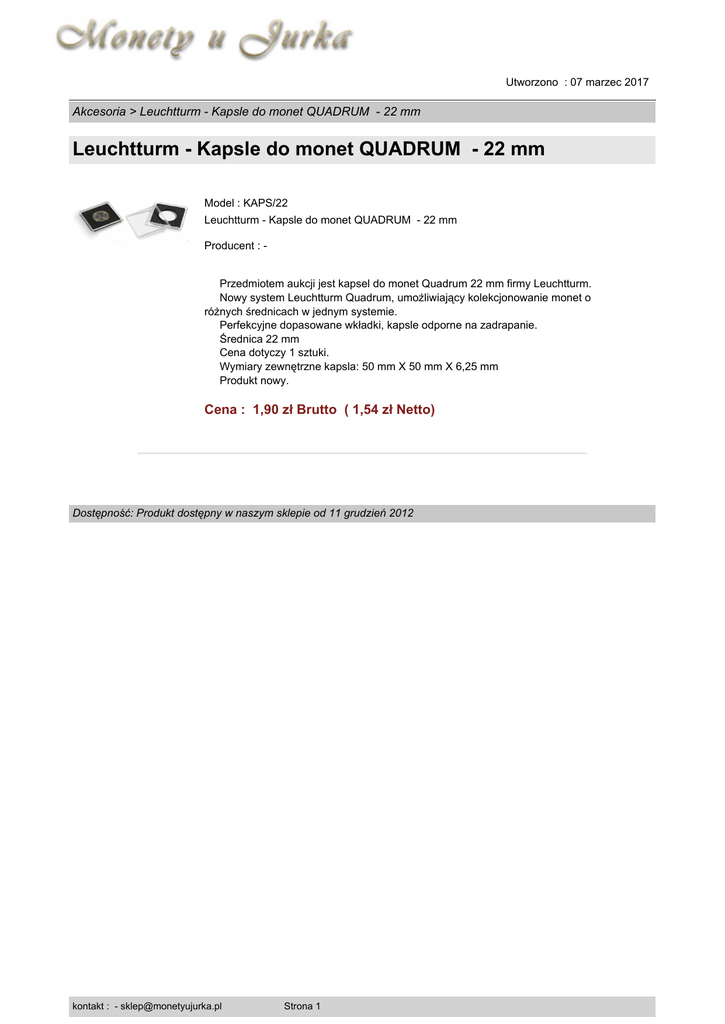 Utworzono : 07 marzec 2017 Akcesoria > Leuchtturm - Kapsle do monet QUADRUM - 22 mm Leuchtturm - Kapsle do monet QUADRUM - 22 mm Model : KAPS/22 Leuchtturm - Kapsle do monet QUADRUM - 22 mm Producent : Przedmiotem aukcji jest kapsel do monet Quadrum 22 mm firmy Leuchtturm. Nowy system Leuchtturm Quadrum, umożliwiający kolekcjonowanie monet o różnych średnicach w jednym systemie. Perfekcyjne dopasowane wkładki, kapsle odporne na zadrapanie. Średnica 22 mm Cena dotyczy 1 sztuki. Wymiary zewnętrzne kapsla: 50 mm X 50 mm X 6,25 mm Produkt nowy. Cena : 1,90 zł Brutto ( 1,54 zł Netto) Dostępność: Produkt dostępny w naszym sklepie od 11 grudzień 2012 kontakt : - [email protected] Strona 1