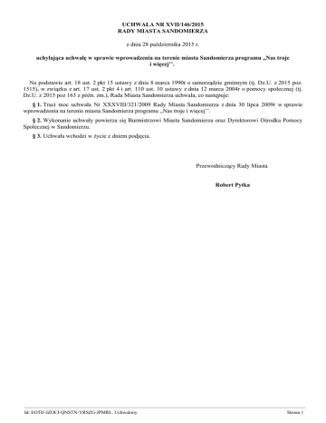 UCHWAŁA NR XVII/146/2015 RADY MIASTA SANDOMIERZA z dnia 28 października 2015 r. uchylająca uchwałę w sprawie wprowadzenia na terenie miasta Sandomierza programu ,,Nas troje i więcej’’. Na podstawie art. 18 ust. 2 pkt 15 ustawy z dnia 8 marca 1990r o samorządzie gminnym (tj. Dz.U. z 2015 poz. 1515), w związku z art. 17 ust. 2 pkt 4 i art. 110 ust. 10 ustawy z dnia 12 marca 2004r o pomocy społecznej (tj. Dz.U. z 2015 poz 163 z późn. zm.), Rada Miasta Sandomierza uchwala, co następuje: § 1. Traci moc uchwała Nr XXXVIII/321/2009 Rady Miasta Sandomierza z dnia 30 lipca 2009r w sprawie wprowadzenia na terenie miasta Sandomierza programu ,,Nas troje i więcej’’. § 2. Wykonanie uchwały powierza się Burmistrzowi Miasta Sandomierza oraz Dyrektorowi Ośrodka Pomocy Społecznej w Sandomierzu. § 3. Uchwała wchodzi w życie z dniem podjęcia. Przewodniczący Rady Miasta Robert Pytka ————————————————————————————————————————————————————————— Id: EOTIJ-JZOCI-QNSTN-YRSZG-JPMRL. Uchwalony Strona 1 Uzasadnienie Od dnia 1 stycznia 2015 r. program wspierania rodzin wielodzietnych jest realizowany na podstawie ustawy z dnia 5 grudnia 2014 r. o Karcie Dużej Rodziny (Dz. U. 2014 poz. 1863), która określa zasady przyznawania członkom rodziny wielodzietnej - Karty Dużej Rodziny, jako uprawnienia do zniżek i ulg nie tylko na terenie gminy ale na terenie całego kraju. Uchwała Nr XXXVIII/321/2009 Rady Miasta Sandomierza z dnia 30 lipca 2009 r. w sprawie wprowadzenia na terenie miasta Sandomierza programu ,,Nas troje i więcej” została podjęta na podstawie art. 17 ust. 2 pkt 4 ustawy o pomocy społecznej, który głosi, że do zadań własnych gminy należy podejmowanie innych zadań z zakresu pomocy społecznej, wynikających z rozeznania potrzeb gminy, w tym tworzenie i realizacja programów osłonowych. Podstawą prawną ww. uchwały był również art. 110 ust. 10 ustawy o pomocy społecznej, w świetle którego program „Nas troje i więcej” powstał, jako lokalny program pomocy społecznej na podstawie potrzeb przedstawionych przez Dyrektora OPS w sprawozdaniu z działalności ośrodka. W chwili podjęcia ww. uchwały nie istniał inny przepis prawa pozwalający na przyznanie rodzinom wielodzietnym, niezależnie od kryterium dochodowego, wsparcia oraz kreowania pozytywnego wizerunku rodziny wielodzietnej, co pozwalało na realizację programu gminnego na rzecz tych rodzin na podstawie ustawy o pomocy społecznej. Od dnia wejścia w życie ustawy o Karcie Dużej Rodziny brak jest podstaw prawnych, aby programy osłonowe pomocy społecznej były skierowane do rodzin wielodzietnych. Zadanie to jest bowiem realizowane na podstawie innej ustawy (ustawy o Karcie Dużej Rodziny). Gmina Sandomierz w chwili obecnej jest realizatorem Ogólnopolskiej Karty Dużej Rodziny, który to program stanowi system zniżek dla rodzin wielodzietnych do dostępu do dóbr kultury, aktywnego wypoczynku, a co za tym idzie obniża ich wydatki na codzienne życie. Gmina nie ponosi żadnych opłat ze swoich środków za korzystanie z ogólnopolskiej Karty Dużej Rodziny. Natomiast w związku z realizacją programu osłonowego „Nas troje i więcej” koszty związane z wydawaniem kart rabatowych oraz obsługą programu obciążają budżet gminy. Na przestrzeni lat 2010-2015 sam koszt wydruku kart i ich aktualizacja wyniosła około 2 800 zł, koszty te pokryto z budżetu Ośrodka Pomocy Społecznej. Realizacja programu, to również promocja programu, szczególnie szeroko zakrojona w roku 2009, za co opłatę wniósł Urząd Miasta, obsługa osobowa, dodatkowe obowiązki pracownika socjalnego koordynującego program, zużycie materiałów biurowych i sprzętu komputerowego OPS. Ponadto na podstawie przeprowadzonej oceny realizacji programu gminnego „Nas troje i więcej”, stwierdza się, że w okresie od 01.10.2014 r. do 30.09.2015 r. w programie uczestniczyło 78 sandomierskich rodzin (377 osób), w tym jedynie 13 rodzin to rodziny korzystające ze stałego wsparcia Ośrodka Pomocy Społecznej w Sandomierzu, co stanowi zaledwie 16,67% ogółu rodzin wielodzietnych, które uczestniczyły w programie gminnym we wskazanym okresie. W programie w chwili obecnej uczestniczą 23 firmy z terenu gminy Sandomierz, przy czym upusty oferowane rodzinom wielodzietnym kształtują się przeważnie w wysokości 520% rabatu na świadczone usługi. Najwyższą ulgę oferowały dotychczas Miejski Ośrodek Sportu i Rekreacji (zarówno nieodpłatne uczestnictwo dzieci i młodzieży w różnych formach zajęć artystycznych, jak i ponad 60% ulga w ramach wejściówki na basen) oraz Sandomierskie Centrum Kultury do 50% rabatu i Iluzjon Art Cafe – 30% rabatu, stając się tym samym największą atrakcją dla członków rodzin wielodzietnych. Analizując wykaz firm i instytucji uczestniczących w ogólnopolskim programie Karta Dużej Rodziny należy zaznaczyć, że instytucje takie, jak MOSiR i SCK są wpisane w rejestr Karty Dużej Rodziny i udzielają zbliżonych ulg. Ponadto w ramach KDR w programie uczestniczą również Muzeum Okręgowe w Sandomierzu oferując bezpłatny wstęp na wystawy dla dzieci i młodzieży z rodzin wielodzietnych oraz Muzeum Diecezjalne w Sandomierzu z 50% zniżką na bilety wstępu do Muzeum. Sandomierskie rodziny uczestniczące w programie Karty Dużej Rodziny mogą więc korzystać ze zniżek zarówno lokalnie, jak i na terenie całego kraju. W świetle powyższego oraz rozwijającej się turystyki na terenie Sandomierza zasadnym wydaje się zachęcanie lokalnych przedsiębiorców do przystępowania do ogólnopolskiego programu wsparcia rodzin wielodzietnych, zaś firm i instytucji uczestniczących do udzielenia rabatów tożsamych z funkcjonującymi w ramach programu gminnego i tym samym nie tylko wspierania i promocji wizerunku rodziny wielodzietnej, ale również promocj