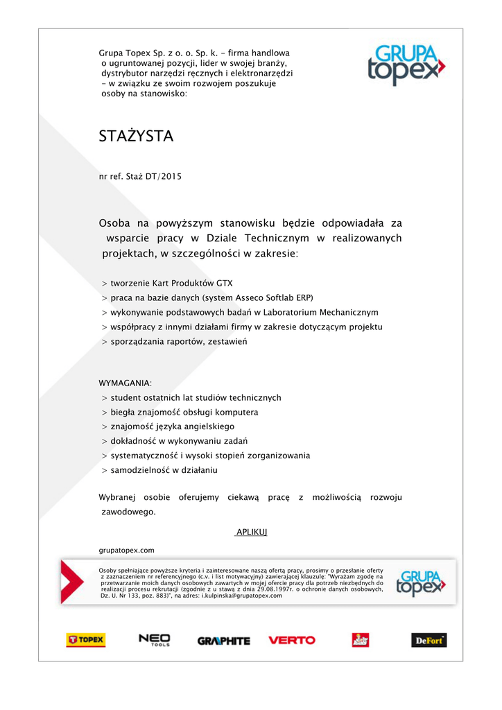 Grupa Topex Sp. z o. o. Sp. k. - firma handlowa o ugruntowanej pozycji, lider w swojej branży, dystrybutor narzędzi ręcznych i elektronarzędzi - w związku ze swoim rozwojem poszukuje osoby na stanowisko: STAŻYSTA nr ref. Staż DT/2015 Osoba na powyższym stanowisku będzie odpowiadała za wsparcie pracy w Dziale Technicznym w realizowanych projektach, w szczególności w zakresie: > tworzenie Kart Produktów GTX > praca na bazie danych (system Asseco Softlab ERP) > wykonywanie podstawowych badań w Laboratorium Mechanicznym > współpracy z innymi działami firmy w zakresie dotyczącym projektu > sporządzania raportów, zestawień WYMAGANIA: > student ostatnich lat studiów technicznych > biegła znajomość obsługi komputera > znajomość języka angielskiego > dokładność w wykonywaniu zadań > systematyczność i wysoki stopień zorganizowania > samodzielność w działaniu Wybranej osobie oferujemy ciekawą pracę z możliwością rozwoju zawodowego. APLIKUJ grupatopex.com Osoby spełniające powyższe kryteria i zainteresowane naszą ofertą pracy, prosimy o przesłanie oferty z zaznaczeniem nr referencyjnego (c.v. i list motywacyjny) zawierającej klauzulę: "Wyrażam zgodę na przetwarzanie moich danych osobowych zawartych w mojej ofercie pracy dla potrzeb niezbędnych do realizacji procesu rekrutacji (zgodnie z u stawą z dnia 29.08.1997r. o ochronie danych osobowych, Dz. U. Nr 133, poz. 883)", na adres: [email protected]