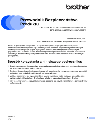 Przewodnik Bezpieczeństwa Produktu 1 DCP-J100/J105/J132W/J152W/J172W/J552DW/J752DW/ MFC-J200/J245/J470DW/J650DW/J870DW Brother Industries, Ltd. 15-1, Naeshiro-cho, Mizuho-ku, Nagoya 467-8561, Japonia Przed rozpoczęciem korzystania z urządzenia lub przed przystąpieniem do czynności serwisowych należy zapoznać się z niniejszym dokumentem. Nieprzestrzeganie niniejszych instrukcji może zwiększyć ryzyko wystąpienia pożaru, porażenia prądem elektrycznym, poparzenia lub uduszenia. Firma Brother nie ponosi odpowiedzialności za żadne uszkodzenia wynikające z nieprzestrzegania przez właściciela produktu instrukcji zawartych w niniejszym podręczniku. Sposób korzystania z niniejszego podręcznika: 1 1 Przed rozpoczęciem korzystania z urządzenia zapoznaj się z całym podręcznikiem i pozostaw go w celu późniejszego wykorzystania. 2 Postępuj dokładnie według instrukcji zawartych w podręczniku i zawsze przestrzegaj wszystkich ostrzeżeń oraz instrukcji znajdujących się na urządzeniu. 3 Jeśli po zapoznaniu się z podręcznikiem pewne kwestie są nadal niejasne, skontaktuj się z działem obsługi klienta firmy Brother lub z lokalnym przedstawicielem firmy Brother. 4 Aby w pełni zrozumieć wszystkie instrukcje, zapoznaj się z symbolami i konwencjami użytymi w dokumentacji. Wersja 0 POL 1 Symbole i konwencje użyte w dokumentacji W dokumentacji zostały użyte poniższe symbole oraz konwencje. Przestrzegaj wszystkich ostrzeżeń i instrukcji umieszczonych na urządzeniu. OSTRZEŻENIE OSTRZEŻENIE informuje o potencjalnie niebezpiecznej sytuacji, która może doprowadzić do śmierci lub poważnych obrażeń ciała, jeśli nie zostaną podjęte kroki w celu jej uniknięcia. Pogrubienie Tekst pogrubiony oznacza przyciski na panelu sterowania urządzenia, cyfry klawiatury na panelu dotykowym oraz przyciski na ekranie komputera. Kursywa Tekst pisany kursywą wskazuje na ważną informację lub kieruje do pokrewnego tematu. Courier New Czcionką Courier New oznaczone są komunikaty pojawiające się na wyświetlaczu LCD urządzenia. UWAGA UWAGA informuje o potencjalnie niebezpiecznej sytuacji, która może doprowadzić do niewielkich lub umiarkowanych obrażeń ciała, jeśli nie zostaną podjęte kroki w celu jej uniknięcia. WAŻNE WAŻNE informuje o potencjalnie niebezpiecznej sytuacji, która może doprowadzić do uszkodzenia mienia lub utraty funkcjonalności urządzenia, jeśli nie zostaną podjęte kroki w celu jej uniknięcia. INFORMACJA Uwagi informują o tym, jak należy reagować w danej sytuacji, lub zawierają porady dotyczące wykonywania czynności w kontekście innych funkcji. Ikony zakazu oznaczają czynności, których nie należy wykonywać. Ta ikona oznacza zakaz używania łatwopalnych aerozoli. Ta ikona oznacza zakaz używania rozpuszczalników organicznych, takich jak alkohol, i innych płynów. Ikony zagrożenia elektrycznego ostrzegają o występującym ryzyku porażenia prądem elektrycznym. Ikona zagrożenia pożarem informuje o możliwości wystąpienia pożaru. 2 INFORMACJA Ilustracje w niniejszym podręczniku przedstawiają model MFC-J870DW. 1 Nota dotycząca opracowania i publikacji 1 Niniejszy podręcznik został opracowany i wydany w celu dostarczenia informacji dotyczących bezpieczeństwa produktu aktualnych na czas publikacji. Informacje zawarte w niniejszym podręczniku mogą zostać zmienione. Najnowsze wersje podręczników można znaleźć na stronie internetowej http://solutions.brother.com/. Wybór bezpiecznego miejsca ustawienia urządzenia 1 Postaw urządzenie na płaskiej, stabilnej powierzchni, wolnej od drgań i wstrząsów, na przykład na biurku. Umieść urządzenie w pobliżu gniazda telefonicznego i standardowego gniazda elektrycznego z uziemieniem. Wybierz suche, dobrze wentylowane miejsce, w którym temperatura utrzymuje się w granicach od 10C do 35C. OSTRZEŻENIE NIE narażaj urządzenia na bezpośrednie działanie światła słonecznego, zbyt wysoką temperaturę, otwarte źródła ognia, korozyjne gazy, wilgoć lub kurz. NIE umieszczaj urządzenia na dywanie lub chodniku, gdyż będzie narażone na działanie kurzu. Kurz może spowodować ryzyko wystąpienia zwarcia elektrycznego lub pożaru. Może również doprowadzić do zniszczenia urządzenia i/lub spowodować, że będzie niesprawne. NIE umieszczaj urządzenia w pobliżu grzejników, klimatyzatorów, wody, środków chemicznych ani urządzeń, które zawierają magnesy bądź generują pole magnetyczne. Kontakt urządzenia z wodą również może spowodować ryzyko wystąpienia zwarcia elektrycznego bądź pożaru (dotyczy to również zjawiska skraplania pary wodnej spowodowanego ogrzewaniem, działaniem klimatyzacji lub wentylacją). NIE należy umieszczać urządzenia w pobliżu chemikaliów lub w miejscach, w których może dojść do wycieków substancji chemicznych. W szczególności płyny lub rozpuszczalniki organiczne mogą spowodować stopienie lub rozpuszczenie się obudowy i/lub przewodów, a co za tym idzie – zwiększyć ryzyko wystąpienia pożaru lub porażenia prądem elektrycznym. Mogą również spowodować awarię urządzenia lub jego odbarwienie. 3 Szczeliny i otwory na obudowie z tyłu i na spodzie urządzenia są otworami wentylacyjnymi. Urządzenie powinno być umieszczone w taki sposób, aby nie stykało się ze ścianą ani innymi urządzeniami, ponieważ mogłoby to spowodować zablokowanie lub zasłonięcie tych otworów. Zablokowanie otworów wentylacyjnych może spowodować przegrzanie i/lub pożar urządzenia. WAŻNE • Urządzenie zawsze ustawiaj na równym, twardym podłożu – nigdy na łóżku, sofie, dywanie lub podobnych miękkich powierzchniach. • Nie umieszczaj urządzenia w zabudowie. WAŻNE • Na urządzeniu NIE należy kłaść jakichkolwiek przedmiotów. • (Tylko modele MFC) NIE umieszczaj przed urządzeniem żadnych przedmiotów, które mogą blokować odbierane faksy. NIE umieszczaj niczego na drodze odbier