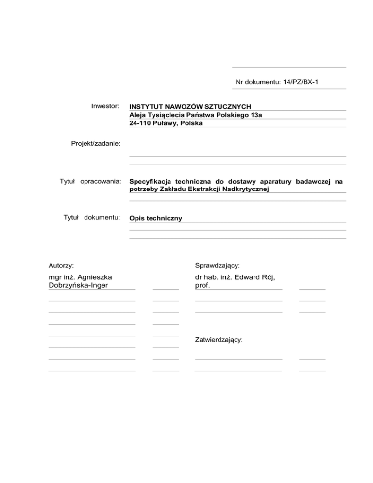 Nr dokumentu: 14/PZ/BX-1 Inwestor: INSTYTUT NAWOZÓW SZTUCZNYCH Aleja Tysiąclecia Państwa Polskiego 13a 24-110 Puławy, Polska Projekt/zadanie: w warunkach nadkrytycznego CO2 Tytuł opracowania: Tytuł dokumentu: Specyfikacja techniczna do dostawy aparatury badawczej na potrzeby Zakładu Ekstrakcji Nadkrytycznej Opis techniczny Autorzy: Sprawdzający: mgr inż. Agnieszka Dobrzyńska-Inger dr hab. inż. Edward Rój, prof. Zatwierdzający: 1. Przedmiot zamówienia Przedmiotem zamówienia jest dostawa przystawki wraz z głowicą i sondą stanowiące system spektrometru masowego typu pułapka jonowa (MSn) wraz z wyposażeniem przeznaczonego do współpracy z chromatografem cieczowym pracującym w Zakładzie Ekstrakcji Nadkrytycznej 2. Założenia Aparatura będzie stanowiła element doposażenia aparatury badawczej funkcjonującej w laboratorium Zakładu Ekstrakcji Nadkrytycznej 3. Opis techniczny przedmiotu zamówienia Detektor masowy do podłączenia do chromatografu cieczowego Accela 1250 stanowiącego wyposażenie Zakładu Ekstrakcji Nadkrytycznej o parametrach nie gorszych niż: Zakres mas analizatora 15 do 4000 amu z rozdzielczością jednostkową w całym zakresie mas. Detektor masowy z analizatorem kwadrupolowym działającym na zasadzie pułapki jonów przystosowany do współpracy z głowicą do jonizacji ESI (electrospray), usytuowaną pod katem 60 do osi analizatora, z opcjonalną możliwością wyposażenia w głowicę do jonizacji APCI (chemiczna jonizacja), nanospray, API MALDI (jonizacja laserowa) lub APPI (fotojonizacja). Rodzaje skanowania mas: pełne widmo, SIM (wybrane jony), MS/MS widmo fragmentów wybranego jonu macierzystego, monitorowanie wybranego przebiegu reakcji (SRM), z wysoką rozdzielczością w wąskim zakresie mas nie gorszą niż 0,3 m/z oraz analiza z inteligentnym sterowaniem w zależności od bieżącego sygnału analitycznego. Zaawansowane funkcje skanowania obejmujące Dynamic Exclusion, WideBand Activation i Normalized Collision Energy. Czułość dla analiz MS/MS: Jonizacja ESI: nastrzyk bezpośredni 2 ul roztworu rezerpiny o stężeniu 1 pg/ul w przepływie 400 ul/min 50 % izopropanolu/ 50 % wody pozwala na uzyskanie stosunku sygnału do szumu 100:1 dla przejścia jonu macierzystego m/z 609 na największy jon fragmentacji ( m/z 448 lub m/z 397) przy przemiataniu mas z jednostkową rozdzielczością w zakresie m/z 165 do 615. Możliwość wykonywania analiz MSn (n=10). Automatyczne sterowanie czasem jonizacji (AGC), automatyczne strojenie, automatyczne dobieranie wzmocnienia, automatyczne elektroniczne sterowanie przepływami gazów w głowicach API. Wyposażony w nasadkę typu Ion Sweep oraz wyjmowaną kapilarę transferową zapewniające zmniejszenie szumu chemicznego i łatwość konserwacji. Głowica do jonizacji electrospray (ESI) dla spektrometru mas. Zakres przepływu: 1 ul/min do 1 ml/min dla 100% wody bez podziału przepływu, oraz przepływ od 200 nl/min z wąską igłą rozpylacza. Zakres napięcia jonizacji do +/- 8 kV, 100 uA maksymalnie. Możliwość regulacji ustawienia rozpylacza względem wlotu jonów do detektora. Z opcją wtórnej fragmentacji kolizyjnej (CID) jonów w źródle jonów i analizatorze mas (MS/MS). System transferu jonów składający się z dwóch oktapoli i soczewki pośredniej zapewniający efektywną transmisję jonów do analizatora mas. Wbudowana w spektrometr pompa strzykawkowa z dwoma szybkościami przepływu oraz sześciodrożny zawór przełączania przepływu do detektora masowego lub do „ścieku”, sterowane z oprogramowania. System próżniowy pompowany różnicowo za pomocą jednej dwustopniowej hybrydowej pompy turbomolekularnej z chłodzeniem powietrznym i pompy rotacyjnej o dużej wydajności ze specjalnym system zabezpieczenia próżni. Sterowanie wszystkimi funkcjami chromatografu cieczowego Accela 1250 oraz spektrometru mas jak również akwizycja danych, analiza ilościowa i jakościowa wyników (oprogramowanie systemowe oraz oprogramowanie użytkowe) – musi odbywać się z poziomu jednego oprogramowania komputerowego. Licencje na oprogramowanie zainstalowane na komputerze (systemowe, narzędziowe i użytkowe). Komputer powinien mieć pamięć operacyjną o pojemności przynajmniej 4 GB oraz dysk o pojemności przynajmniej 1TB. Zestawy instalacyjne do podłączenia systemu i jego pełnego uruchomienia oraz oprogramowania narzędziowego i użytkowego. Materiały eksploatacyjne w tym: dodatkowa strzykawka do pompy strzykawkowej, dodatkowa kapilara transferowa do źródła jonów, rękawiczki gumowe bezpyłowe lub bawełniane Szkolenie – w siedzibie Odbiorcy min. 24 godziny niezależnie od czasu instalacji sprzętu, Dostawa, instalacja, uruchomienie, kalibracja i szkolenie na koszt Dostawcy w siedzibie zamawiającego w terminie ustalonym z zamawiającym. Dostawca zapewni: bezpłatny serwis gwarancyjny, płatny serwis pogwarancyjny co najmniej 5 lat po okresie gwarancyjnym, czas rekcji serwisu w okresie gwarancyjnym maksymalnie 72 godziny (podjęcie działań naprawczych), maksymalny czas oczekiwania na naprawę 30 dni. 4. Wymagania techniczne oraz przepisy i standardy Przedmiot zamówienia powinien spełniać wymagania obowiązujących przepisów prawa w UE, w szczególności dotyczących bezpieczeństwa pracy oraz ochrony środowiska. 5. Zakres dostawy Zakres dostawy do miejsca użytkowania (siedziby Zamawiającego) powinien obejmować: kompletne, nowe urządzenia, papierową dokumentację techniczną w dwóch egzemplarzach zawierająca instrukcje do spektrometru, papierową dokumentację oprogramowania narzędziowego i użytkowego w języku angielskim lub polskim, kartę gwarancyjną, wykaz części zamiennych zawierający dane umożliwiające ich jednoznaczne określenie przy zamówieniu. 6. Gwarancje oczekiwane 24 miesiące od daty odbioru sprzętu, każda pozycja dostawy, która nie spełni wymagań zakresie rozwiązań konstrukcyjnych, zastosowanych materiałów lub wykonania zostanie z