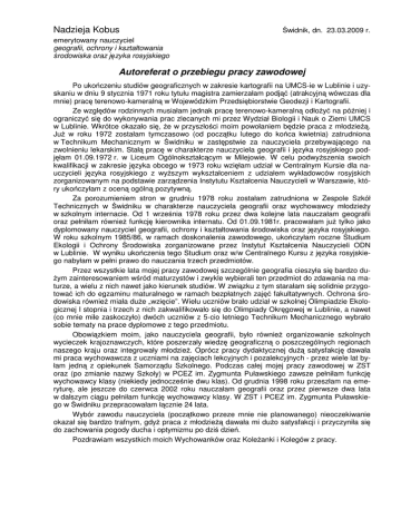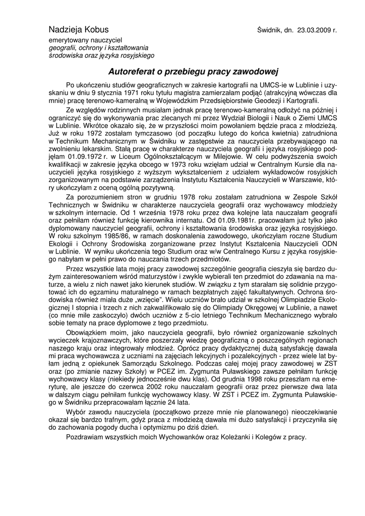 Nadzieja Kobus Świdnik, dn. 23.03.2009 r. emerytowany nauczyciel geografii, ochrony i kształtowania środowiska oraz języka rosyjskiego Autoreferat o przebiegu pracy zawodowej Po ukończeniu studiów geograficznych w zakresie kartografii na UMCS-ie w Lublinie i uzyskaniu w dniu 9 stycznia 1971 roku tytułu magistra zamierzałam podjąć (atrakcyjną wówczas dla mnie) pracę terenowo-kameralną w Wojewódzkim Przedsiębiorstwie Geodezji i Kartografii. Ze względów rodzinnych musiałam jednak pracę terenowo-kameralną odłożyć na później i ograniczyć się do wykonywania prac zlecanych mi przez Wydział Biologii i Nauk o Ziemi UMCS w Lublinie. Wkrótce okazało się, że w przyszłości moim powołaniem będzie praca z młodzieżą. Już w roku 1972 zostałam tymczasowo (od początku lutego do końca kwietnia) zatrudniona w Technikum Mechanicznym w Świdniku w zastępstwie za nauczyciela przebywającego na zwolnieniu lekarskim. Stałą pracę w charakterze nauczyciela geografii i języka rosyjskiego podjęłam 01.09.1972 r. w Liceum Ogólnokształcącym w Milejowie. W celu podwyższenia swoich kwalifikacji w zakresie języka obcego w 1973 roku wzięłam udział w Centralnym Kursie dla nauczycieli języka rosyjskiego z wyższym wykształceniem z udziałem wykładowców rosyjskich zorganizowanym na podstawie zarządzenia Instytutu Kształcenia Nauczycieli w Warszawie, który ukończyłam z oceną ogólną pozytywną. Za porozumieniem stron w grudniu 1978 roku zostałam zatrudniona w Zespole Szkół Technicznych w Świdniku w charakterze nauczyciela geografii oraz wychowawcy młodzieży w szkolnym internacie. Od 1 września 1978 roku przez dwa kolejne lata nauczałam geografii oraz pełniłam również funkcję kierownika internatu. Od 01.09.1981r. pracowałam już tylko jako dyplomowany nauczyciel geografii, ochrony i kształtowania środowiska oraz języka rosyjskiego. W roku szkolnym 1985/86, w ramach doskonalenia zawodowego, ukończyłam roczne Studium Ekologii i Ochrony Środowiska zorganizowane przez Instytut Kształcenia Nauczycieli ODN w Lublinie. W wyniku ukończenia tego Studium oraz w/w Centralnego Kursu z języka rosyjskiego nabyłam w pełni prawo do nauczania trzech przedmiotów. Przez wszystkie lata mojej pracy zawodowej szczególnie geografia cieszyła się bardzo dużym zainteresowaniem wśród maturzystów i zwykle wybierali ten przedmiot do zdawania na maturze, a wielu z nich nawet jako kierunek studiów. W związku z tym starałam się solidnie przygotować ich do egzaminu maturalnego w ramach bezpłatnych zajęć fakultatywnych. Ochrona środowiska również miała duże „wzięcie”. Wielu uczniów brało udział w szkolnej Olimpiadzie Ekologicznej I stopnia i trzech z nich zakwalifikowało się do Olimpiady Okręgowej w Lublinie, a nawet (co mnie mile zaskoczyło) dwóch uczniów z 5-cio letniego Technikum Mechanicznego wybrało sobie tematy na prace dyplomowe z tego przedmiotu. Obowiązkiem moim, jako nauczyciela geografii, było również organizowanie szkolnych wycieczek krajoznawczych, które poszerzały wiedzę geograficzną o poszczególnych regionach naszego kraju oraz integrowały młodzież. Oprócz pracy dydaktycznej dużą satysfakcję dawała mi praca wychowawcza z uczniami na zajęciach lekcyjnych i pozalekcyjnych - przez wiele lat byłam jedną z opiekunek Samorządu Szkolnego. Podczas całej mojej pracy zawodowej w ZST oraz (po zmianie nazwy Szkoły) w PCEZ im. Zygmunta Puławskiego zawsze pełniłam funkcję wychowawcy klasy (niekiedy jednocześnie dwu klas). Od grudnia 1998 roku przeszłam na emeryturę, ale jeszcze do czerwca 2002 roku nauczałam geografii oraz przez pierwsze dwa lata w dalszym ciągu pełniłam funkcję wychowawcy klasy. W ZST i PCEZ im. Zygmunta Puławskiego w Świdniku przepracowałam łącznie 24 lata. Wybór zawodu nauczyciela (początkowo przeze mnie nie planowanego) nieoczekiwanie okazał się bardzo trafnym, gdyż praca z młodzieżą dawała mi dużo satysfakcji i przyczyniła się do zachowania pogody ducha i optymizmu po dziś dzień. Pozdrawiam wszystkich moich Wychowanków oraz Koleżanki i Kolegów z pracy.