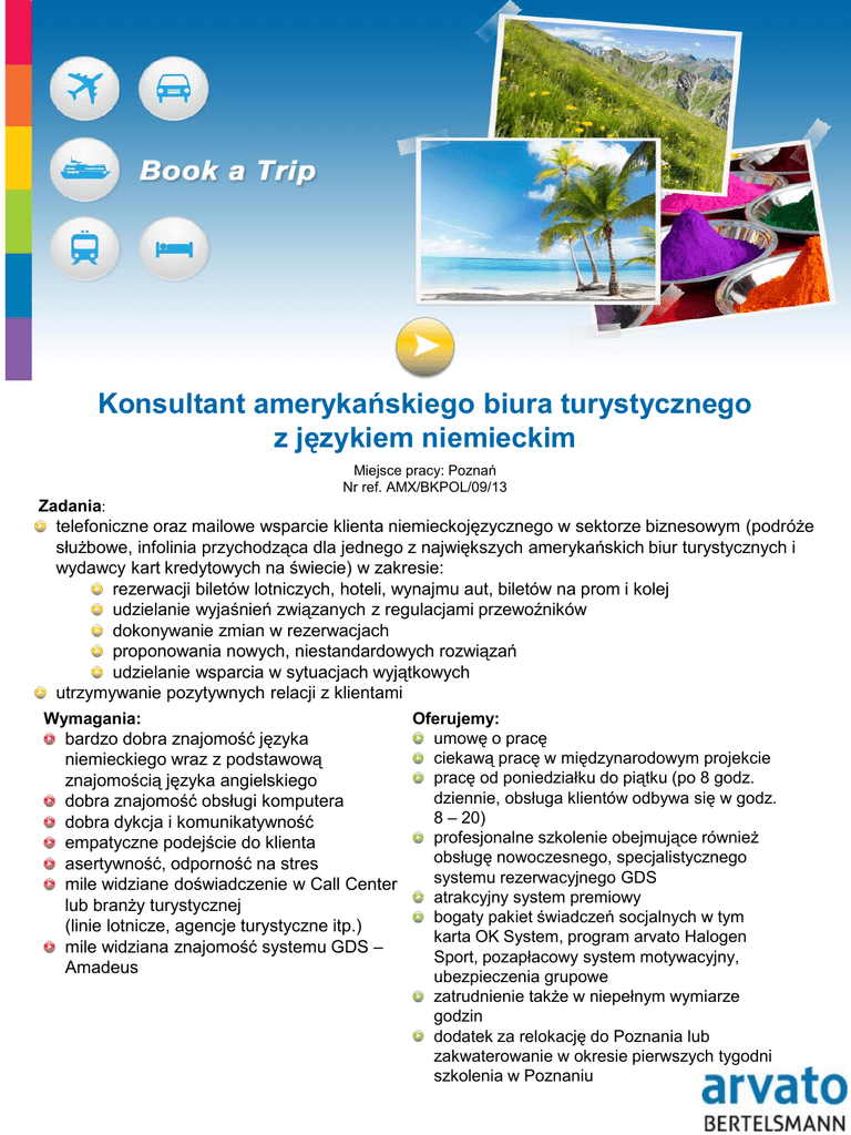 Konsultant amerykańskiego biura turystycznego z językiem niemieckim Miejsce pracy: Poznań Nr ref. AMX/BKPOL/09/13 Zadania: telefoniczne oraz mailowe wsparcie klienta niemieckojęzycznego w sektorze biznesowym (podróże służbowe, infolinia przychodząca dla jednego z największych amerykańskich biur turystycznych i wydawcy kart kredytowych na świecie) w zakresie: rezerwacji biletów lotniczych, hoteli, wynajmu aut, biletów na prom i kolej udzielanie wyjaśnień związanych z regulacjami przewoźników dokonywanie zmian w rezerwacjach proponowania nowych, niestandardowych rozwiązań udzielanie wsparcia w sytuacjach wyjątkowych utrzymywanie pozytywnych relacji z klientami Wymagania: Oferujemy: umowę o pracę bardzo dobra znajomość języka ciekawą pracę w międzynarodowym projekcie niemieckiego wraz z podstawową pracę od poniedziałku do piątku (po 8 godz. znajomością języka angielskiego dziennie, obsługa klientów odbywa się w godz. dobra znajomość obsługi komputera 8 – 20) dobra dykcja i komunikatywność profesjonalne szkolenie obejmujące również empatyczne podejście do klienta obsługę nowoczesnego, specjalistycznego asertywność, odporność na stres systemu rezerwacyjnego GDS mile widziane doświadczenie w Call Center atrakcyjny system premiowy lub branży turystycznej bogaty pakiet świadczeń socjalnych w tym (linie lotnicze, agencje turystyczne itp.) karta OK System, program arvato Halogen mile widziana znajomość systemu GDS – Sport, pozapłacowy system motywacyjny, Amadeus ubezpieczenia grupowe zatrudnienie także w niepełnym wymiarze godzin dodatek za relokację do Poznania lub zakwaterowanie w okresie pierwszych tygodni szkolenia w Poznaniu