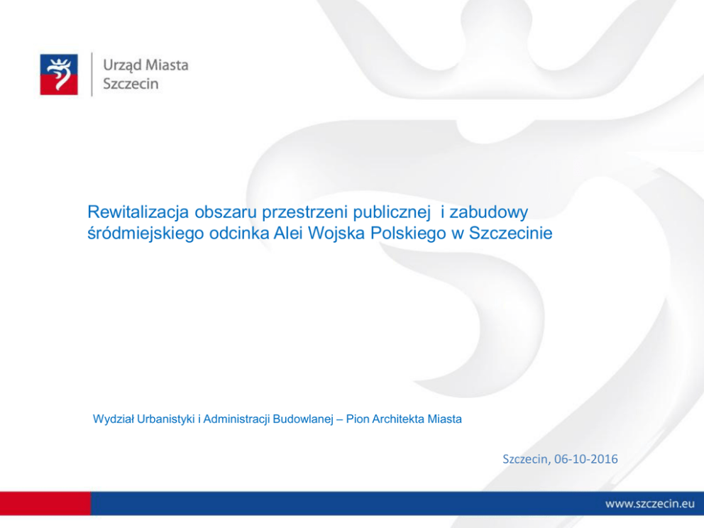 Rewitalizacja obszaru przestrzeni publicznej i zabudowy śródmiejskiego odcinka Alei Wojska Polskiego w Szczecinie Wydział Urbanistyki i Administracji Budowlanej – Pion Architekta Miasta Szczecin, 06-10-2016 Rewitalizacja obszaru przestrzeni publicznej i zabudowy śródmiejskiego odcinka Alei Wojska Polskiego w Szczecinie Szczecin, 10.2016r Rewitalizacja obszaru przestrzeni publicznej i zabudowy śródmiejskiego odcinka Alei Wojska Polskiego w Szczecinie Projekt Rewitalizacja obszaru przestrzeni publicznej i zabudowy śródmiejskiego odcinka Alei Wojska Polskiego w Szczecinie. Projekt jest współfinansowany ze środków Ministerstwa Rozwoju RP i Unii Europejskiej w ramach Programu Operacyjnego Pomoc Techniczna 2014-2020 i został wybrany w konkursie na „Modelową rewitalizację miast”. Wysokość przyznanej dotacji: 3.762.090 zł. Łączna wysokość projektu (kwota dotacji 90% i wkład własny 10%) wynosi 4.180.100 zł. Dotacja współfinansowana jest w 85% ze środków Unii Europejskiej, w ramach Funduszu Spójności w ramach Programu Operacyjnego Pomoc Techniczna 2014-2020 oraz w 15% z budżetu państwa. Umowa dotacyjna z Ministerstwem Rozwoju została podpisana w dniu 1 sierpnia 2016 r. Termin realizacji projektu został ustalony na dzień 31 grudnia 2018 r. Szczecin, 10.2016r Rewitalizacja obszaru przestrzeni publicznej i zabudowy śródmiejskiego odcinka Alei Wojska Polskiego w Szczecinie Zadania: 1. Przygotowanie modelu 3D fragmentu obszaru Śródmieścia Szczecina na potrzeby Konkursu na opracowanie koncepcji zagospodarowania przestrzeni publicznych w obszarze Alei Wojska Polskiego w Szczecinie. 2. Przygotowanie Konkursu na opracowanie koncepcji zagospodarowania przestrzeni publicznych w obszarze Alei Wojska Polskiego w Szczecinie. Szczecin, 10.2016r Rewitalizacja obszaru przestrzeni publicznej i zabudowy śródmiejskiego odcinka Alei Wojska Polskiego w Szczecinie 1. Przygotowanie modelu 3D fragmentu obszaru Śródmieścia Szczecina na potrzeby Konkursu na opracowanie koncepcji zagospodarowania przestrzeni publicznych w obszarze Alei Wojska Polskiego w Szczecinie. Opis przedmiotu zamówienia Przedmiotem zamówienia jest przygotowanie modelu 3D stanu istniejącego fragmentu obszaru Śródmieścia Szczecina, wskazanego w Lokalnym Programie Rewitalizacji dla Miasta Szczecina jako Projekt Zintegrowany. Szczegółowość modelu: • dla obszaru nr 1 - model powinien być wykonany z dokładnym oddaniem struktury elewacji, dachu budynków i ważnych elementów architektonicznych (okna, drzwi, bramy, gzymsy, lukarny, wykusze, zwieńczenia) oraz kolorów elewacji (dokładność sytuacyjna i wysokościowa do 0,5m, najmniejszy rozróżnialny obiekt 2x2m). • dla obszaru oznaczonego nr 2 - szczegółowość modelu to proste białe bryły budynków uwzględniające kształt dachu i ważne elementy architektoniczne (lukarny, wykusze, zwieńczenia, bramy), ściany pozbawione tekstur (dokładność sytuacyjna do 2m, wysokościowa do 1m, najmniejszy rozróżnialny obiekt 4x4m). • dla obszaru oznaczonego nr 3 - szczegółowość modelu to proste białe bryły budynków uwzględniające kształt dachu, ściany pozbawione tekstur (dokładność sytuacyjna do 2m, wysokościowa do 1m, najmniejszy rozróżnialny obiekt 4x4m). Termin wykonania zamówienia nie może być dłuższy do dnia 15 grudnia 2016 r. Szczecin, 10.2016r Rewitalizacja obszaru przestrzeni publicznej i zabudowy śródmiejskiego odcinka Alei Wojska Polskiego w Szczecinie Szczecin, 10.2016r Rewitalizacja obszaru przestrzeni publicznej i zabudowy śródmiejskiego odcinka Alei Wojska Polskiego w Szczecinie 2. Przygotowanie Konkursu na opracowanie koncepcji zagospodarowania przestrzeni publicznych w obszarze Opis przedmiotu zamówienia Przedmiotem zamówienia jest przygotowanie Konkursu na opracowanie koncepcji zagospodarowania przestrzeni publicznych Alei Wojska Polskiego, zgodnie z zapisami ustawy z dnia 29 stycznia 2004 r. Prawo zamówień publicznych (t.j. Dz. U. z 2015 r. poz. 2164 z późn. zm.). Zakres i przedmiot konkursu: Objęty konkursem będzie śródmiejski odcinek Alei Wojska Polskiego w Szczecinie między Placem Szarych Szeregów a Placem Zwycięstwa, przy zachowaniu wypracowanych założeń dotyczących sposobu przekształcenia alei. Przedmiotem konkursu będzie opracowanie szczegółowej koncepcji programowo-przestrzennej zagospodarowania przestrzeni publicznych w obszarze Alei Wojska Polskiego, w szczególności dotyczących aranżacji: Placu Zgody, terenu u zbiegu ulicy Ściegiennego i Królowej Jadwigi, terenu u zbiegu ulicy Obrońców Stalingradu i Alei Wojska Polskiego, odcinka ul. Śląskiej bez przejazdu (od ul. Więckowskiego do terenu za budynkami mieszkalnymi Spółdzielni Mieszkaniowej „Śródmieście”) wraz z terenem przy budynkach mieszkalnych Spółdzielni Mieszkaniowej „Śródmieście” (do ul. Obrońców Stalingradu). Termin wykonania zamówienia: Umowa zostanie zawarta na czas oznaczony od dnia jej podpisania do dnia rozstrzygnięcia konkursu, którego termin określony zostanie w Regulaminie konkursu oraz zakończenia procedury odwoławczej związanej z postępowaniem konkursowym, jednak nie później niż do dnia 1 maja 2017 roku. Szczecin, 10.2016r Rewitalizacja obszaru przestrzeni publicznej i zabudowy śródmiejskiego odcinka Alei Wojska Polskiego w Szczecinie 2. Przygotowanie Konkursu na opracowanie koncepcji zagospodarowania przestrzeni publicznych w obszarze Alei Wojska Polskiego Podstawą do opracowania pracy konkursowej będą: • Miejscowy plan zagospodarowania przestrzennego „Centrum – Plac Odrodzenia” (uchwała nr XXIII/596/08 Rady Miasta Szczecin z dnia 16 czerwca 2008 r.), • Koncepcja przebudowy Alei Wojska Polskiego na odcinku od Placu Zwycięstwa do Placu Szarych Szeregów, opracowana przez Pion Architekta Miasta Wydziału Urbanistyki i Administracji Budowlanej Urzędu Miasta Szczecin oraz poddana konsultacjom społecznym, a także będąca przedmiotem przeprowa