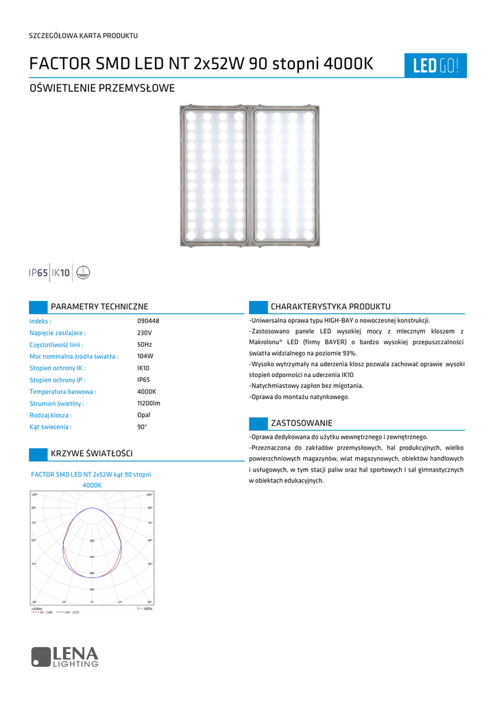 SZCZEGÓŁOWA KARTA PRODUKTU FACTOR SMD LED NT 2x52W 90 stopni 4000K OŚWIETLENIE PRZEMYSŁOWE PARAMETRY TECHNICZNE CHARAKTERYSTYKA PRODUKTU indeks : 090448 -Uniwersalna oprawa typu HIGH-BAY o nowoczesnej konstrukcji. Napięcie zasilajace : 230V -Zastosowano panele LED wysokiej mocy z mlecznym kloszem z Częstotliwość linii : 50Hz Makrolonu® LED (firmy BAYER) o bardzo wysokiej przepuszczalności Moc nominalna źródła światła : 104W światła widzialnego na poziomie 93%. Stopień ochrony IK : IK10 Stopień ochrony IP : IP65 Temperatura barwowa : 4000K Strumień świetlny : 11200lm Rodzaj klosza : Opal Kąt świecenia : 90° -Wysoko wytrzymały na uderzenia klosz pozwala zachować oprawie wysoki stopień odporności na uderzenia IK10 -Natychmiastowy zapłon bez migotania. -Oprawa do montażu natynkowego. ZASTOSOWANIE -Oprawa dedykowana do użytku wewnętrznego i zewnętrznego. KRZYWE ŚWIATŁOŚCI FACTOR SMD LED NT 2x52W kąt 90 stopni 4000K -Przeznaczona do zakładów przemysłowych, hal produkcyjnych, wielko powierzchniowych magazynów, wiat magazynowych, obiektów handlowych i usługowych, w tym stacji paliw oraz hal sportowych i sal gimnastycznych w obiektach edukacyjnych. SZCZEGÓŁOWA KARTA PRODUKTU FACTOR SMD LED NT 2x52W 90 stopni 4000K OŚWIETLENIE PRZEMYSŁOWE TABELA PARAMETRÓW TECHNICZNYCH indeks: 090448 Napięcie zasilajace: 230V Częstotliwość linii: 50Hz Moc nominalna źródła światła: 104W Stopień ochrony IK: IK10 Stopień ochrony IP: IP65 Skuteczność świetlna: 107lm/W Klasa energetyczna: A+ Jednolitość barwy: (0,38; 0,38) Oświetlenie akcentowe: Nie Źródło światła: LED GO! Liczba sztuk w opakowaniu zbiorczym: 1 szt. Klasa ETIM: EC001716 Kąt świecenia: 90° Źródło światła wymienne: Nie Klasa ochrony: I Wymiary: 380/300/150mm Waga: 6,6kg Materiał korpusu: Blacha stalowa malowana proszkowo Temperatura barwowa: 4000K Sposób montażu: Natynkowy Kolor: Szary Strumień świetlny: 11200lm Współczynnik mocy lampy: 0,98 Kod EAN: 5905963090448 Oznaczenie CE: Tak Materiał klosza: Makrolon® LED Rodzaj klosza: Opal Nominalny okres trwałości lampy: 50000h Znamionowa trwałość lampy: 50000h Współczynnik zachowania strumienia świetlnego na zakończenie nominalnego okresu 80% trwałości: Awaryjność 5000h: ≤1% Liczba cykli włącz / wyłącz poprzedzająca przedwczesny koniec 15000 eksploatacji: Czas nagrzewania się lampy do 60% pełnego strumienia świetlnego: pomijalny Współpraca z ściemniaczami: Brak możliwości ściemniania Szczegółowe warunki eksploatacji: Ta = 25°C Do zastosowań zewnętrznych: Nie Rozkład widmowy mocy: (0,36;0,36) Oddawanie barw: Ra>80 www.lenalighting.pl | Strona 2 SZCZEGÓŁOWA KARTA PRODUKTU FACTOR SMD LED NT 2x52W 90 stopni 4000K OŚWIETLENIE PRZEMYSŁOWE RYSUNKI TECHNICZNE Data aktualizacji karty: 2016-07-07 75/2014 www.lenalighting.pl | Strona 3