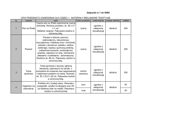 Załącznik nr 1 do SIWZ lp 1 OPIS PRZEDMIOTU ZAMÓWIENIA DLA CZĘŚCI 1 - MATERIAŁY REKLAMOWE TEKSTYLNE nazwa opis kolor produktu znakowanie rodzaj nadruku Czarne etui na iPada wykończone czarną lamówką. Wymiary produktu: ok. 26 x 21 zgodnie z Etui na iPada x 1 cm. czarny załączoną sitodruk Materiał: neopren. Pakowane osobno w wizualizacją ochronną folię. nakład 200 Parasol Parasol w kolorze czarnym, wiatroodporny, kieszonkowy; trzyczęściowy, metalowy trzon i końcówki, szkielet z aluminium, plastiku i włókna szklanego, rączką z gumową powłoką, poliestrowe poszycie, wodoodporna powłoka, zapinany na rzep, mechanizm składania i rozkładania - automatyczny. Średnica ok. 96 cm. Pakowany osobno w ochronną folię. czarny zgodnie z załączoną wizualizacją sitodruk 200 3 Torba sportowa Torba sportowa z boczną i główną kieszenią, zapinanymi na zamek, z uchwytami do noszenia oraz regulowanym i odpinanym paskiem na ramię. Wymiary: ok. 55 x 32,5 x 28 cm. Pakowana osobno w ochronną folię. czarno czerwony zgodnie z załączoną wizualizacją sitodruk 200 4 Organizer na dokumenty Portfolio A4 z imitacji skóry. Wewnatrz przegródki, szlufka na długopis oraz 25cio kartkowy blok na notatki. Pakowany osobno w ochronną folię zgodnie z załączoną wizualizacją sitodruk 2 ecru rudy 50 50