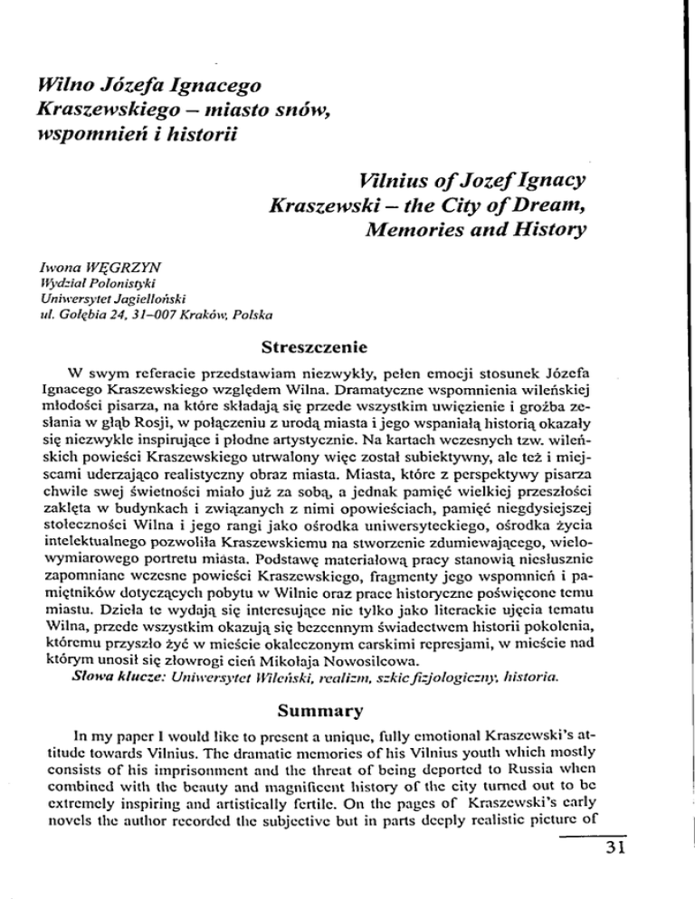 Wydaje si? wiec, ze nawet nie czytajac utworow Kraszewskiego z latwoscia^ domyslec si? mozna stosunku pisarza do miasta, w ktorym sp?dzil cz?sc swej mlodosci - powinna to bye historia zachwytu, opowiesc