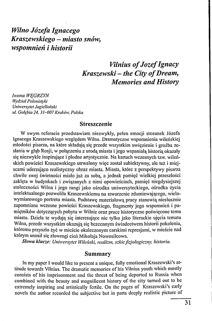Iwona Wcgrzyn. W I L N O J Ó Z E F A I G N A C E G O K R A S Z E W S K I E G O - M I A S T O SNÓW, WSPOMNIEÑ I HISTORI1