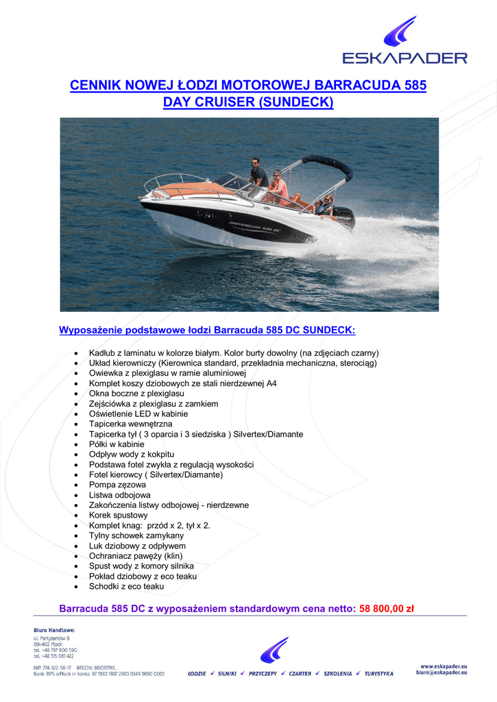 CENNIK NOWEJ ŁODZI MOTOROWEJ BARRACUDA 585 DAY CRUISER (SUNDECK) Wyposażenie podstawowe łodzi Barracuda 585 DC SUNDECK: Kadłub z laminatu w kolorze białym. Kolor burty dowolny (na zdjęciach czarny) Układ kierowniczy (Kierownica standard, przekładnia mechaniczna, sterociąg) Owiewka z plexiglasu w ramie aluminiowej Komplet koszy dziobowych ze stali nierdzewnej A4 Okna boczne z plexiglasu Zejściówka z plexiglasu z zamkiem Oświetlenie LED w kabinie Tapicerka wewnętrzna Tapicerka tył ( 3 oparcia i 3 siedziska ) Silvertex/Diamante Półki w kabinie Odpływ wody z kokpitu Podstawa fotel zwykła z regulacją wysokości Fotel kierowcy ( Silvertex/Diamante) Pompa zęzowa Listwa odbojowa Zakończenia listwy odbojowej - nierdzewne Korek spustowy Komplet knag: przód x 2, tył x 2. Tylny schowek zamykany Luk dziobowy z odpływem Ochraniacz pawęży (klin) Spust wody z komory silnika Pokład dziobowy z eco teaku Schodki z eco teaku Barracuda 585 DC z wyposażeniem standardowym cena netto: 58 800,00 zł Opcje wyposażenia dodatkowego : Hydrauliczny układ steruący do 115 kM 2450 zł Hydrauliczny układ sterujący do 150 kM 3550 zł Kierownica Baltic Sport 500 zł Kierownica drewniana 900 zł Podstawa regulowana sternika – przód/tył ( manualnie) + regulacja góra/dół ( pneumatycznie) 750 zł Fotel pasażera 1400 zł podstawa do fotela pasażera do wyboru: - standardowa mechaniczna 300 zł - pneumatyczna 950 zł Tapicerka dziobowa Silvertex/Diamante ( Sundeck) 750 zł Eco teak w kokpicie 1650 zł Eco teak z tyłu 950 zł Luk wejściowy (szkło hartowane) 950 zł Panel przełączników – 350 zł Lampa topowa – 250 zł Oświetlenie nawigacyjne – 600 zł Drabinka – 700 zł Bakisty w kabinie ( maksymalnie 2 szt. ) 200 zł/szt. Rolka dziobowa 300 zł Układ paliwowy ( Kompletny, Zbiornik 192 litry ) 4100 zł Prysznic ( Kompletny, Zbiornik 50l ) 2300 zł system ogrzewania postojowego 8000 zł system ładowania portowego 1900 zł Echosonda Lowrance Elite 5 Ti + czujnik Total Scan 3950 zł Echosonda Lowrance Hook 5 + czujnik Down Scan 2900 zł magistrala NMEA 2000 do echosondy z montażem 1 940 zł radio Lowrance VHF 1200 zł dodatkowe gniazdo zapalniczki 450 zł toalety chemiczna 350 zł dwa uchwyty na napoje 300 zł akumulator 100Ah (Marine) 870 zł radio bluetooth Fusion z czterema głośnikami 2300 zł radio FM/USB/MP3 z czterema głośnikami 1700 zł Uwaga: wszystkie ceny są cenami netto i nie zawierają 23 % podatku VAT cennik obowiązuje od dnia 01.01.2017 / dotychczasowe cenniki tracą ważność.