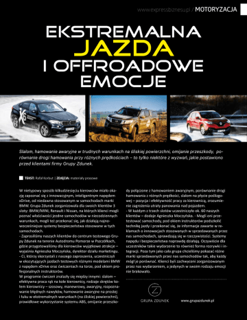 www.expressbiznesu.pl / MOTORYZACJA www.expressbiznesu.pl / BIZNES Ekstremalna jazda i offroadowe emocje Slalom, hamowanie awaryjne w trudnych warunkach na śliskiej powierzchni, omijanie przeszkody, porównanie drogi hamowania przy różnych prędkościach – to tylko niektóre z wyzwań, jakie postawiono przed klientami firmy Grupy Zdunek. TEKST: Rafał Korbut | ZDJĘCIA: materiały prasowe W nietypowy sposób kilkudziesięciu kierowców miało okazję zapoznać się z innowacyjnym, inteligentnym napędem xDrive, od niedawna stosowanym w samochodach marki BMW. Grupa Zdunek zorganizowała dla swoich klientów 3 sloty: BMW/MINI, Renault i Nissan, na których klienci mogli poznać właściwości jezdne samochodów w niecodziennych warunkach, mogli też przekonać się, jak działają najnowocześniejsze systemy bezpieczeństwa stosowane w tych samochodach. - Zaprosiliśmy naszych klientów do centrum testowego Grupy Zdunek na terenie Autodromu Pomorze w Pszczółkach, gdzie przygotowaliśmy dla kierowców wyjątkowe atrakcje – wyjaśnia Agnieszka Moczyńska, dyrektor działu marketingu. - Ci, którzy skorzystali z naszego zaproszenia, uczestniczyli w ekscytujących jazdach testowych różnymi modelami BMW z napędem xDrive oraz ćwiczeniach na torze, pod okiem profesjonalnych instruktorów. W programie ćwiczeń znalazły się między innymi: slalom – efektywna praca rąk na kole kierownicy, rodzaje skrętów kołem kierownicy – szosowy, manewrowy, awaryjny, rozpoznawanie błędnych nawyków, hamowanie awaryjne na prostej i łuku w ekstremalnych warunkach (na śliskiej powierzchni), prawidłowe wykorzystanie systemu ABS, omijanie przeszko- dy połączone z hamowaniem awaryjnym, porównanie drogi hamowania z różnych prędkości, slalom na płycie poślizgowej – pozycja i efektywność pracy za kierownicą, zrozumienie zagrożenia utraty panowania nad pojazdem. - W każdym z trzech slotów uczestniczyło ok. 60 naszych klientów – dodaje Agnieszka Moczyńska. - Mogli oni przetestować samochody, pod okiem instruktorów podszkolić technikę jazdy i przekonać się, że informacje zawarte w reklamach o innowacjach stosowanych w sprzedawanych przez nas samochodach, sprawdzają się w rzeczywistości. Systemy napędu i bezpieczeństwa naprawdę działają. Oczywiście dla uczestników takie wydarzenie to również forma rozrywki i integracji. Poza tym jako cała grupa chcieliśmy pokazać różne marki sprzedawanych przez nas samochodów tak, aby każdy mógł je porównać. Klienci byli zachwyceni zorganizowanym przez nas wydarzeniem, a jedynych w swoim rodzaju emocji nie brakowało. www..grupazdunek.pl 93
