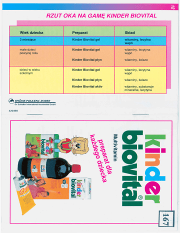 "," 'C'~""''''I:~ ~,,~_~. i\) I Wiek dziecka Preparat Skład 3 miesiące Klnder Blovltal gel witaminy. lecyłna wapń małe dzieci powyżej roku Kinder Biovtial gel witaminy, lecytyna wapń Kinder Biovital płyn witaminy, żelazo Kinder Biovital gel witaminy, lecytyna wapń Kinder Biovital płyn witaminy, żelazo Kinder Biovital aktiv witaminy, substancje mineralne, lecytyna dzieci w wieku szkolnym ~ RHONE-POULENC RORER Dr. Schleffer International Arznelmlttel GmbH - Kiedy żywienie nie jest w pełni racjonalne, w okresach intensywnego wzrostu lub zwiększonego, z jakichkolwiek powodów, zapotrzebowania Kinder Biovital wspomaga zdrowie i prawidłowy rozwój dziecka. Witaminy to swoiste "biokatalizatory". Są niezbędne do życia, gdyż regulują wszystkie zachodzące w organiźmie procesy. Organizm ludzki nie jest jednak w stanie sam ich wytwarzać (z nielicznymi wyjątkami). Codzienne zapotrzebowanie na witaminy powinno więc być zaspokajane przede wszystkim przez odpowiedni dobór pożywienia. Okazuje się, że jest to raczej trudne, dlatego coraz częściej zaleca się uzupełnianie codziennej diety preparatami witaminowymi i mineralnymi. Podobnie jak na dorosłych, tak i na dzieciach ciąży wiele trudnych obowiązków. Muszą zmierzyć się ze szkolnymi zadaniami, sprostać wymaganiom nauczycieli i rodziców, przezwyciężać związany z tym stres. Aby organizm dziecka mógł wytworzyć w sobie odpowiednią ilość energii, by rozwój dziecka przebiegał prawidłowo należy dostarczyć mu niezbędnych witamin i substancji mineralnych. Lata wzrostu to ogromny wysiłek dla młodego organizmu, to jednocześnie szczególnie ważny okres w życiu człowieka, okres, w którym kształtuje się ciało i umysł, od których zależy ogólna sprawność fizyczna i psychiczna. Dlatego też bardzo istotne jest by rozwijające się dzieci otrzymywały wszystkie niezbędne do budowy organizmu substancje. Opracowane specjalnie dla dzieci preparaty Kinder Biovital zawierają witaminy, mikroelementy i podstawowy "budulec krwi" - żelazo, gwarantując tym samym dostarczenie im ważnych do życia elementów w ilościach pokrywających dzienne zapotrzebowanie i usuwajacych ewentualne stany niedoborów. OKRES WZROSTU I CHOROBY WIEKU DZIECIĘCEGO POWODUJĄ, ŻE SZYBKO ZWIĘKSZA SIĘ ZAPOTRZEBOWANIE ORGANIZMU NA ŻYCIODAJNE SUBSTANCJE W każdej sekundzie szpik kostny wytwarza 2 miliony czerwonych krwinek. Organizm jest zdolny do takiej fantastycznej wydajności jedynie wtedy, gdy posiada wystarczającą ilość żelaza. Około 70 % zawartego w ustroju żelaza znajduje się w barwniku krwi, zwanym hemoglobiną. Dzięki hemoglobinie krew dostarcza komórkom tlen z płuc, a także pobiera z nich dwutlenek węgla, wydalany następnie podczas wydechu. Nic dziwnego, że dzieci, w przypadku najmniejszego nawet deficytu żelaza, reagują zmęczeniem. Kinder Biovital w płynie, z dużą zawartością żelaza, witaminy C i innych witamin, nadaje się szczególnie dla dzieci w wieku szybkiego wzrostu, w okresie rekonwalescencji po przebytych chorobach, w sytuacjach silnych obciążeń fizycznych i psychicznych, gdyż wtedy właśnie zapotrzebowanie na te składniki jest największe. Witamina C zwiększa w decydują~y . sposob wykorzystanie współtworzącego krew zelaza I wzmacnia siły obronne organizmu. NAUKA WYMAGA SiłY I KONCENTRACJI Nawet gdy dziecko jest zdrowe nal~ży dokł~d.ać star~ń aby było sprawne i w jak najlepszej kondY~jl fizycznej I psychicznej. KIN DER BIOVITAL w posta~1 t~bletek do żucia jest doskonałym preparatem dla dZlec~ w wieku . szkolnym. Obok witamin zawiera także wapn, ~~gnez I lecytynę, trzy składniki bardzo istotne dla rozwijającego się organizmu. Wapń spełnia ważne funkcje, zwiększając u dziecka zdolność do wysiłku. Reguluje pracę mięśni i nerwów, uaktywnia enzymy, stanowi główny "budulec" kości i zębów . • Czy nadmiar żelaza jest szkodliwy? Istnieją pewne zaburzenia przemiany żelaza (hemochromatoza), kiedy to jego nadmiar jest szkodliwy. Przy tej dolegliwości organizm przyswaja więcej żelaza niż jest to potrzebne, kumulując go w wielu narządach. Tak więc w przypadku zaburzeń przemiany żelaza lub hemochromatozy preparaty z żelazem nie mogą być stosowane. U ludzi zdrowych nie istnieje takie ryzyko, nadmiar jest po prostu wydalany. KINDER BIOVITAL można stosować bez obawy. Na pytanie czy nadmiar wapnia jest szkodliwy odpowiedż brzmi: Nie. U osób zdr?wych nie. ~ystępuje przyswajanie żadnych ilości wapnia ponad fizjologiczne zapotrzebowanie. Magnez jest przeciwnością wapnia. Oba pierwiastki muszą w organiżmie znajdować się w określonej równowadze. Dzieci, które otrzymują zbyt małą ilość magnezu reagują między innymi nerwowością i agresywnością. Obecnie wiadomo, że na skutek stresu wchłanianie magnezu z jelit ulega zmniejszeniu. U dzieci, które są z różnych powodów nerwowe, posiadają tiki, mają trudności z koncentracją uwagi lub inne podobne objawy, można za pomocą magnezu uzyskać znaczącą poprawę. Do nadmiernego poziomu magnezu w organiżmie może dojść jedynie w przypadku nieprawidłowego funkcjonowania nerek. Lecytyny są częścią składową wszystkich ludzkich komórek. Lecytyna sojowa zawarta w preparacie KINDER BIOVITAL jest bogata w wielonienasycone kwasy tłuszczowe. Szczególnie ważny jest jej udział w procesach przemiany materii zachodzących w mózgu i komórkach nerwowych. Poprawia zdolność koncentracji uwagi oraz ogólną sprawność mózgu. Spożywanie większych, niż jest to wymagane, ilości lecytyny nie powoduje skutków ubocznych. I. TAKZE NIEMOWLĘTA POTRZEBUJĄ ŻYCIODAJNYCH SUBSTANCJI. ~";~'\ ,:000 ~ ''\11 " ';, , \ KINDER BIOVITAL GEL w tubie to szybko działający preparat, o bardzo przyjemnym pomarańczowym smaku, który dzięki temu może być łatwo podawany małym dzieciom, a także niemowlętom. Kinder Biovital Gel dostarcza organizmowi nie tylko najważniejszych witam