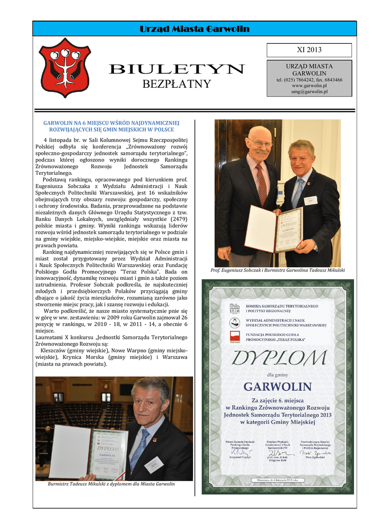 XI 2013 BIULETYN URZĄD MIASTA GARWOLIN BEZPŁATNY tel. (025) 7864242, fax. 6843466 www.garwolin.pl [email protected] GARWOLIN NA 6 MIEJSCU WŚRÓD NAJDYNAMICZNIEJ ROZWIJAJĄCYCH SIĘ GMIN MIEJSKICH W POLSCE 4 listopada br. w Sali Kolumnowej Sejmu Rzeczpospolitej Polskiej odbyła się konferencja „Zrównoważony rozwój społeczno-gospodarczy jednostek samorządu terytorialnego”, podczas której ogłoszono wyniki dorocznego Rankingu Zrównoważonego Rozwoju Jednostek Samorządu Terytorialnego. Podstawą rankingu, opracowanego pod kierunkiem prof. Eugeniusza Sobczaka z Wydziału Administracji i Nauk Społecznych Politechniki Warszawskiej, jest 16 wskaźników obejmujących trzy obszary rozwoju: gospodarczy, społeczny i ochrony środowiska. Badania, przeprowadzone na podstawie niezależnych danych Głównego Urzędu Statystycznego z tzw. Banku Danych Lokalnych, uwzględniały wszystkie (2479) polskie miasta i gminy. Wyniki rankingu wskazują liderów rozwoju wśród jednostek samorządu terytorialnego w podziale na gminy wiejskie, miejsko-wiejskie, miejskie oraz miasta na prawach powiatu. Ranking najdynamiczniej rozwijających się w Polsce gmin i miast został przygotowany przez Wydział Administracji i Nauk Społecznych Politechniki Warszawskiej oraz Fundację Polskiego Godła Promocyjnego "Teraz Polska". Bada on innowacyjność, dynamikę rozwoju miast i gmin a także poziom zatrudnienia. Profesor Sobczak podkreśla, że najskuteczniej młodych i przedsiębiorczych Polaków przyciągają gminy dbające o jakość życia mieszkańców, rozumianą zarówno jako stworzenie miejsc pracy, jak i szansę rozwoju i edukacji. Warto podkreślić, że nasze miasto systematycznie pnie się w górę w ww. zestawieniu: w 2009 roku Garwolin zajmował 26 pozycję w rankingu, w 2010 - 18, w 2011 - 14, a obecnie 6 miejsce. Laureatami X konkursu „Jednostki Samorządu Terytorialnego Zrównoważonego Rozwoju są: Kleszczów (gminy wiejskie), Nowe Warpno (gminy miejskowiejskie), Krynica Morska (gminy miejskie) i Warszawa (miasta na prawach powiatu). Burmistrz Tadeusz Mikulski z dyplomem dla Miasta Garwolin Prof. Eugeniusz Sobczak i Burmistrz Garwolina Tadeusz Mikulski 2 WIELKI REMONT I ROZBUDOWA MIEJSKO-POWIATOWEJ BIBLIOTEKI PUBLICZNEJ W GARWOLINIE JUŻ W PRZYSZŁYM ROKU. Program Wieloletni KULTURA+ ma na celu poprawę dostępu do kultury oraz uczestnictwa w życiu kulturalnym w mniejszych miejscowościach, poprzez modernizację i budowę infrastruktury bibliotecznej oraz digitalizację zasobów polskich muzeów, bibliotek i archiwów. W ramach programu zdefiniowano Priorytet „Biblioteka+ Infrastruktura Bibliotek” – dający szansę na przystosowanie bibliotek do obecnych standardów. Miejsko-Powiatowa Biblioteka Publiczna w Garwolinie mieści się w wymagającym już remontu 60-letnim budynku przy ulicy Nadwodnej 1. Mając na uwadze jego stan techniczny, a przede wszystkim w trosce o czytelników i mieszkańców miasta i powiatu, Urząd Miasta wraz w MPBP zgłosiły swój udział w programie Biblioteka +. Na początku marca br. Rada Miasta Garwolina podjęła decyzję o zabezpieczeniu środków finansowych na ten cel w budżecie miasta. Zabezpieczenie wkładu własnego miasta było niezbędnym krokiem w drodze po dofinansowanie. Dzięki rzetelnemu opracowaniu wniosku pozyskano dotację z Ministerstwa Kultury i Dziedzictwa Narodowego w wysokości 1 680 926 zł. Pozyskane środki finansowe wraz z 851 506 zł wkładu własnego miasta, posłużą na remont i modernizację 440 m2 pomieszczeń bibliotecznych, zakup mebli, nowoczesnych regałów bibliotecznych sytemu przesuwanego, niezbędnego sprzętu komputerowego oraz wymianę dachu nad biblioteką. Efektem remontu będzie także dobudowa pomieszczeń o łącznej powierzchni 120m2. W ich skład wchodzić będą: wyposażona w nowoczesne rozwiązania Mediateka a także toaleta dla czytelników przystosowana dla osób niepełnosprawnych. Oprócz pomieszczeń sanitarnych biblioteki zostanie wybudowany miejski WC, którego kosztów budowy nie można wliczać do programu, ponieważ nie są one związane z funkcjonowaniem biblioteki. Remont MPBP przewidziany jest na lata 2014-2015. Wizualizacja projektowanej nowej części biblioteki-sala mulimedialna (Mediateka) Wypożyczalnia w Miejsko-Powiatowej Bibliotece Publicznej w Garwolinie ODSŁONIĘCIE POMNIKA KSIĘCIA JANUSZA I STARSZEGO „Działo się to 12 września Roku Pańskiego 2013” – to pierwsze słowa aktu erekcyjnego, który został wmurowany pod pomnikiem księcia Janusza I Starszego. Uroczystość zgodnie z planem rozpoczęła się o godzinie 13:00 przy skrzyżowaniu ulic Kościuszki i Staszica. Wydawać by się mogło, że książę Janusz nie ma szczęścia do pogody: kiedy pomnik był montowany lało, w czwartek 12 września również mżył deszcz. Pogoda się jednak poprawiła, i już ze złożonymi parasolami przedstawiciele władz lokalnych, zaproszeni goście, zgromadzona młodzież i mieszkańcy miasta uczestniczyli w uroczystości odsłonięcia pomnika księcia Janusza I Starszego. Zebranych przywitał Sekretarz miasta Cezary Tudek, po czym głos zabrał Burmistrz Garwolina Tadeusz Mikulski. Włodarz miasta zwrócił uwagę na ciągłość dziejów historycznych: „Tutaj w tym miejscu łączy się przeszłość z teraźniejszością, na tablicach informacyjnych w przedstawionym kalendarium odkrywamy historię Garwolina od pierwszej zapisanej wzmianki po współczesne wydarzenia. Burmistrz w krótkich słowach przybliżył postać księcia Janusza: Książę Janusz jest nazywany przez historyków Kazimierzem Wielkim Mazowsza. Bez wahania stanął po stronie króla Polski w wielkiej wojnie z Zakonem Krzyżackim i wysłał wojsko na decydujące stracie w 1410 roku. Świadomość zagrożeń sprawia, że bardzo troszczymy się o to, co jest naszą własnością. Być może tak właśnie myślał książę, gdy wśród 20 miast, którym nadał prawa miejskie znalazł się również Garwol