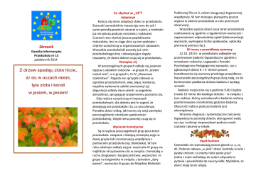 Co słychać w „13”? Skrzacik Gazetka informacyjna Przedszkola nr 13 październik 2014 Z drzew spadają złote liście, aż się w oczach mieni, tyle złota i korali w jesieni, w jesieni! Adaptacja Kończy się okres adaptacji dzieci w przedszkolu. Starszaki samodzielnie maszerują rano do sali i same potrafią powiesić ubranie w szatni, a średniaki już nie płaczą podczas rozstania z rodzicami. Czasami rano słychać jeszcze popłakiwanie maluszków, lecz w ciągu dnia są one spokojne i chętnie uczestniczą w organizowanych zabawach. Wszystkie przedszkolaki poznały już rytm przedszkolnego dnia i obowiązujące reguły. Uważamy, że dzieci dobrze czują się w przedszkolu. Poznajmy się W poszczególnych grupach odbyły się jesienne zajęcia z udziałem rodziców - w grupie III „Jesieni nastał czas”, a w grupach I, II i IV „Owocowe szaleństwo”. Pogoda nie sprzyjała zabawie w ogrodzie przedszkolnym, więc pląsy, konkursy, wspólne wykonanie sałatki owocowej i jej degustacja odbyły się w salach, w pogodnej atmosferze, sprzyjającej wzajemnemu poznaniu się. Gdy rodzice uczestniczą w imprezach przedszkolnych, dla dziecka jest to sygnał, że akceptują oni przedszkole i to, co ono oferuje. Ponadto dzieci widzą, jak tworzy się więź pomiędzy poszczególnymi członkami społeczności przedszkolnej. Dzięki temu pewniej czują się w przedszkolu. Wycieczki tematyczne Są to wyjścia poszczególnych grup poza teren przedszkola związane z bieżącą tematyką zajęć w danej grupie lub z kontynuacją współpracy z partnerami przedszkola (np. biblioteka). W tym roku szkolnym odbyły się już: wycieczka IV grupy na najbliższe skrzyżowanie ulic w związku z tematyką o ruchu drogowym i bezpieczeństwie, wycieczka I i II grupy na targowisko w związku z tematem „dary jesieni”, wycieczka III grupy do Miejskiej Biblioteki Publicznej filia nr 3, celem inauguracji tegorocznej współpracy. W tym miesiącu planujemy jeszcze wyjścia w okolice przedszkola w celu jesiennych obserwacji. Wszystkie wyjścia dzieci poza teren przedszkola realizowane są zgodnie z regulaminem wycieczek i zapewnieniem odpowiedniej opieki (dokumentacja wycieczki, wymagana liczba opiekunów, apteczka pierwszej pomocy itp.). W trosce o prawidłową wymowę 22.10. 2014 r. w przedszkolu odbędzie się przesiewowe badanie logopedyczne zgodnie z wnioskami rodziców. Logopeda z Poradni Psychologiczno-Pedagogicznej sprawdzi, czy u zgłoszonych dzieci 6- i 5- letnich proces kształtowania się wymowy przebiega prawidłowo. Nauczycielki poszczególnych grup służą radą, co do konieczności poddania dziecka badaniu i wydają wnioski. Badanie rozpocznie się o godzinie 9.00 i będzie trwało 15 minut dla każdego dziecka - w związku z tym rodzice, którzy wnioskowali o badanie zostaną poinformowani o konkretnej godzinie badania. Obecność rodzica podczas badania jest obowiązkowa. Wczesna diagnoza i systematyczne ćwiczenia logopedyczne pozwolą dziecku skorygować wadę na czas i uniknąć niepowodzeń podczas nauki czytania i pisania w szkole. Kącik humoru Czterolatki nie wymawiają jeszcze głosek sz ,ż, cz, dż. Podczas zabawy „w jeża” dzieci siedziały w kole i pytały chórem: co mamy robić panie jeżu? Jedna z mam wchodząc do szatni usłyszała to pytanie i powiedziała do nauczycielki: Myślałam, że dzieci mają teraz religię. Wspieranie rozwoju mowy dziecka przedszkolnego – rady dla rodziców Unikamy zbytniego spieszczania, zdrabniania mowy - budujemy zrozumiałe zdania, korzystamy z modulacji głosu. Zwracamy uwagę, aby dziecko oddychało nosem - w przypadku, gdy dziecko oddycha ustami, wspólnie z lekarzem oraz logopedą szukamy powodu. Ćwiczymy oddychanie (bańki mydlane, baloniki, piórka, wiatraczki), a także prezentujemy dziecku prawidłowy sposób oddychania: wdech nosem, wydech ustami. Opowiadamy i czytajmy bajki, wierszyki, wyliczanki, uczymy krótkich wierszy na pamięć - nawet, jeżeli dziecko będzie mówiło niewyraźnie chwalmy je za opanowanie treści. Oglądamy z dzieckiem obrazki - nazywamy przedmioty, opisujemy sytuacje. Ograniczamy oglądanie telewizji – oglądamy programy z dzieckiem, komentujemy wydarzenia pojawiające się na ekranie, rozmawiamy o nich. Naśladujemy odgłosy z otoczenia (kap- kap, ciach -ciach), wydawane przez zwierzęta (hau- hau, kum- kum) i inne – dzieci ćwiczą w ten sposób wiele funkcji mowy. Wybieramy dla dziecka zabawy poprawiające sprawność palców: wierszyki paluszkowe (np.„Idzie rak”, „Sroczka kaszkę warzyła”), ugniatanie plasteliny, klejenie, nawlekanie koralików, budowanie z klocków oraz patyczków – jest to korzystne, bo ośrodki ruchowe w koordynacji mózgowej znajdują się w sąsiedztwie ośrodków mowy. Bawimy się z dzieckiem w dialogowanie, tzn. tradycyjne zabawy z tekstem dialogowym (np. „Dzień dobry ci, królu LuLu”) - uczą one dzieci podstawowych zasad prowadzenia dialogu. Ćwiczymy z dzieckiem narządy mowy w formie zabawy (np. oblizywanie ust po deserze, naśladowanie motoru – wibracja warg, robienie baloników z policzków, kląskanie językiem – odgłos jadącego konia), robienie różnych min. Dostosowujemy dietę do wieku dziecka unikamy zbyt długiego podawania rozdrobnionych i tylko miękkich potraw, uczmy dzieci gryźć i żuć już od najwcześniejszych momentów np. jabłko, marchewka, kawałki mięsa, chleb ze skórką itp. Jama ustna i narząd mowy stanowią jeden aparat - bez sprawnego jedzenia, w tym także gryzienia, nie ma swobodnego mówienia. Czy rozpieszczasz swoje dziecko? Czasami zdarza się, że rodzice działając w dobrej wierze psują dziecko i rozpieszczają je. Wówczas staje się ono skoncentrowanym na sobie, małym egoistą, który gardzi innymi ludźmi. Jak zapobiec takiej sytuacji? Oczywiście trzeba tak wyważyć swoje postępowanie, by nie popaść w skrajność i nie zaniedbać autentycznych potrzeb dziecka, czyli: odpowiadać na żywotne p