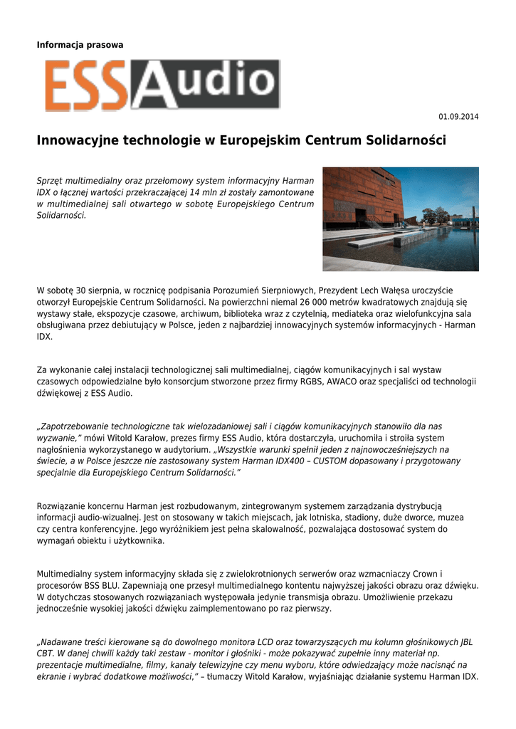 Informacja prasowa 01.09.2014 Innowacyjne technologie w Europejskim Centrum Solidarności Sprzęt multimedialny oraz przełomowy system informacyjny Harman IDX o łącznej wartości przekraczającej 14 mln zł zostały zamontowane w multimedialnej sali otwartego w sobotę Europejskiego Centrum Solidarności. W sobotę 30 sierpnia, w rocznicę podpisania Porozumień Sierpniowych, Prezydent Lech Wałęsa uroczyście otworzył Europejskie Centrum Solidarności. Na powierzchni niemal 26 000 metrów kwadratowych znajdują się wystawy stałe, ekspozycje czasowe, archiwum, biblioteka wraz z czytelnią, mediateka oraz wielofunkcyjna sala obsługiwana przez debiutujący w Polsce, jeden z najbardziej innowacyjnych systemów informacyjnych - Harman IDX. Za wykonanie całej instalacji technologicznej sali multimedialnej, ciągów komunikacyjnych i sal wystaw czasowych odpowiedzialne było konsorcjum stworzone przez firmy RGBS, AWACO oraz specjaliści od technologii dźwiękowej z ESS Audio. „Zapotrzebowanie technologiczne tak wielozadaniowej sali i ciągów komunikacyjnych stanowiło dla nas wyzwanie,” mówi Witold Karałow, prezes firmy ESS Audio, która dostarczyła, uruchomiła i stroiła system nagłośnienia wykorzystanego w audytorium. „Wszystkie warunki spełnił jeden z najnowocześniejszych na świecie, a w Polsce jeszcze nie zastosowany system Harman IDX400 – CUSTOM dopasowany i przygotowany specjalnie dla Europejskiego Centrum Solidarności.” Rozwiązanie koncernu Harman jest rozbudowanym, zintegrowanym systemem zarządzania dystrybucją informacji audio-wizualnej. Jest on stosowany w takich miejscach, jak lotniska, stadiony, duże dworce, muzea czy centra konferencyjne. Jego wyróżnikiem jest pełna skalowalność, pozwalająca dostosować system do wymagań obiektu i użytkownika. Multimedialny system informacyjny składa się z zwielokrotnionych serwerów oraz wzmacniaczy Crown i procesorów BSS BLU. Zapewniają one przesył multimedialnego kontentu najwyższej jakości obrazu oraz dźwięku. W dotychczas stosowanych rozwiązaniach występowała jedynie transmisja obrazu. Umożliwienie przekazu jednocześnie wysokiej jakości dźwięku zaimplementowano po raz pierwszy. „Nadawane treści kierowane są do dowolnego monitora LCD oraz towarzyszących mu kolumn głośnikowych JBL CBT. W danej chwili każdy taki zestaw - monitor i głośniki - może pokazywać zupełnie inny materiał np. prezentacje multimedialne, filmy, kanały telewizyjne czy menu wyboru, które odwiedzający może nacisnąć na ekranie i wybrać dodatkowe możliwości,” – tłumaczy Witold Karałow, wyjaśniając działanie systemu Harman IDX. Cały system jest uniwersalny nie tylko pod względem możliwości dopasowania się do wielkości obiektu. Każdy z zestawów tworzonych przez monitor i głośniki automatycznie zwiększa poziom swojego dźwięku, reagując na natężenie hałasu w otoczeniu. Dzięki temu odwiedzający bez większych problemów usłyszą przekaz niezależnie od panującego wokół gwaru. W audytorium, które może pełnić funkcje koncertowe, teatralne, kinowe czy konferencyjne znajduje się dyskretny system nagłośnienia, dzięki któremu wrażenia słuchowe w każdym miejscu sali są dokładnie takie same. Na potrzeby koncertów i sztuk teatralnych zostało zainstalowanych 16 kolumn głośnikowych szerokopasmowych i 6 podwieszonych pod sufitem subwooferów. „W przypadku, gdy sala ma być salą kinową w ciągu chwili pojawia się dużych rozmiarów ekran perforowany, a w projektorni można wybrać spośród najmocniejszego obecnie na rynku najwyższej jakości cyfrowego projektora kinowego Barco 4K-32B albo drugiego projektora wykorzystującego klasyczne materiały np. 35mm,” odsłania technologiczne kulisy Witold Karałow. „Za ekranem oraz na ścianach znajdują się wkomponowane w design sali najwyższej jakości głośniki kinowe, gwarantujące w odpowiednich momentach prawdziwe trzęsienie ziemi lub inne niezapomniane efekty dźwiękowe.” Za wrażenia akustyczne widzów odpowiedzialny jest zestaw 19 surroundów, dwa subwoofery i trzy kolumny zaekranowe JBL o łącznej mocy ciągłej 8 kW. Wartość szczytowa tego systemu może być niemal czterokrotnie większa. Wykorzystany w sali projektor cyfrowy Barco 4K-32B o jasności 33 000 lumentów jest najwłaściwszym wyborem dla sal kinowych, które wymagają wyraźnego, trójwymiarowego obrazu. Dzięki rozdzielczości urządzenia (4096 x 2160 pikseli) wszystkie wyświetlane detale mają niezwykłą ostrość. Model pracuje w oparciu o 1.38-calowy chip DLP Cinema® Enhanced, który w połączeniu z technologią DLP Cinema® zapewnia idealne odwzorowanie kolorów i wysoki kontrast. Każdy z ponad 500 wysokiej jakości foteli znajdujących się w tej niezwykle innowacyjnej sali jest wyposażony w pulpit systemu konferencyjnego oraz tłumaczeń symultanicznych, co pozwala organizować w tym pomieszczeniu wielojęzyczne spotkania, dyskusje, konferencje czy prezentacje. Wszystkie te rozwiązania są ze sobą integrowane poprzez system sterowania pozwalający na zarządzanie każdym z nich z jednego miejsca - realizatorki zlokalizowanej za salą. Do tego system sterowania obsługuje również odsłanianie i zasłanianie rolet, jak również regulację oświetlenia. Informacje o firmie ESS Audio jest wyłącznym przedstawicielem handlowym w Polsce grupy Harman Professional będącej jednym z największych na świecie producentów w branży audio. Do Grupy Harman Professional należą marki: JBL, Crown, dbx, Soundcraft, BSS Audio, Studer, AKG, Lexicon. ESS Audio jest liderem branży pro audio w Polsce oferując projekty akustyczne, elektroakustyczne i DSO, kompleksowe dostawy systemów nagłośnieniowych, doradztwo i szkolenia oraz autoryzowany serwis gwarancyjny i pogwarancyjny. Od 1989 roku zrealizowała wiele prestiżowych instalacji w licznych instytucjach administracji publicznej, stacjach radiowych i telewizyjnych, hotelach