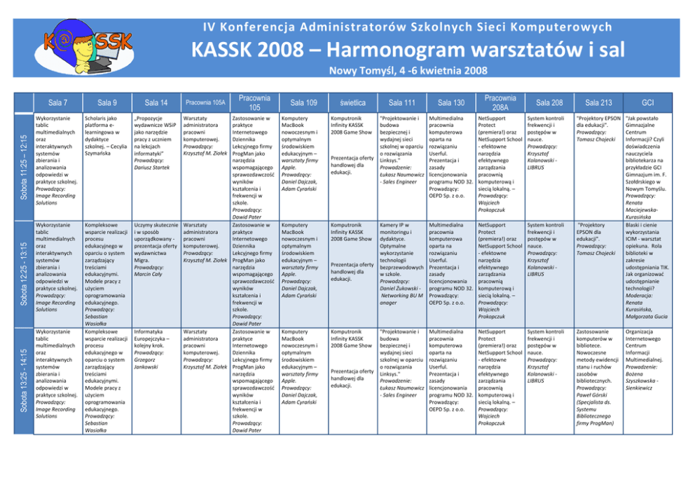 IV Konferencja Administratorów Szkolnych Sieci Komputerowych KASSK 2008 – Harmonogram warsztatów i sal Sobota 13:25 - 14:15 Sobota 12:25 - 13:15 Sobota 11:25 – 12:15 Nowy Tomyśl, 4 -6 kwietnia 2008 Sala 7 Sala 9 Sala 14 Pracownia 105A Wykorzystanie tablic multimedialnych oraz interaktywnych systemów zbierania i analizowania odpowiedzi w praktyce szkolnej. Prowadzący: Image Recording Solutions Scholaris jako platforma elearningowa w dydaktyce szkolnej. – Cecylia Szymaoska „Propozycje wydawnicze WSiP jako narzędzie pracy z uczniem na lekcjach informatyki” Prowadzący: Dariusz Startek Warsztaty administratora pracowni komputerowej. Prowadzący: Krzysztof M. Ziołek Wykorzystanie tablic multimedialnych oraz interaktywnych systemów zbierania i analizowania odpowiedzi w praktyce szkolnej. Prowadzący: Image Recording Solutions Kompleksowe wsparcie realizacji procesu edukacyjnego w oparciu o system zarządzający treściami edukacyjnymi. Modele pracy z użyciem oprogramowania edukacyjnego. Prowadzący: Sebastian Wasiołka Kompleksowe wsparcie realizacji procesu edukacyjnego w oparciu o system zarządzający treściami edukacyjnymi. Modele pracy z użyciem oprogramowania edukacyjnego. Prowadzący: Sebastian Wasiołka Wykorzystanie tablic multimedialnych oraz interaktywnych systemów zbierania i analizowania odpowiedzi w praktyce szkolnej. Prowadzący: Image Recording Solutions Pracownia 105 Zastosowanie w praktyce Internetowego Dziennika Lekcyjnego firmy ProgMan jako narzędzia wspomagającego sprawozdawczośd wyników kształcenia i frekwencji w szkole. Prowadzący: Dawid Pater Uczymy skutecznie Warsztaty Zastosowanie w i w sposób administratora praktyce uporządkowany pracowni Internetowego prezentacja oferty komputerowej. Dziennika wydawnictwa Prowadzący: Lekcyjnego firmy Krzysztof M. Ziołek ProgMan jako Migra. Prowadzący: narzędzia Marcin Cały wspomagającego sprawozdawczośd wyników kształcenia i frekwencji w szkole. Prowadzący: Dawid Pater Informatyka Warsztaty Zastosowanie w Europejczyka – administratora praktyce kolejny krok. pracowni Internetowego Prowadzący: komputerowej. Dziennika Grzegorz Prowadzący: Lekcyjnego firmy Jankowski Krzysztof M. Ziołek ProgMan jako narzędzia wspomagającego sprawozdawczośd wyników kształcenia i frekwencji w szkole. Prowadzący: Dawid Pater Sala 109 Pracownia 208A świetlica Sala 111 Sala 130 Komputery MacBook nowoczesnym i optymalnym środowiskiem edukacyjnym – warsztaty firmy Apple. Prowadzący: Daniel Dajczak, Adam Cyraoski Komputronik Infinity KASSK 2008 Game Show "Projektowanie i budowa bezpiecznej i wydajnej sieci szkolnej w oparciu o rozwiązania Linksys." Prowadzenie: Łukasz Naumowicz - Sales Engineer Multimedialna pracownia komputerowa oparta na rozwiązaniu Userful. Prezentacja i zasady licencjonowania programu NOD 32. Prowadzący: OEPD Sp. z o.o. NetSupport Protect (premiera!) oraz NetSupport School - efektowne narzędzia efektywnego zarządzania pracownią komputerową i siecią lokalną. – Prowadzący: Wojciech Prokopczuk Komputery MacBook nowoczesnym i optymalnym środowiskiem edukacyjnym – warsztaty firmy Apple. Prowadzący: Daniel Dajczak, Adam Cyraoski Komputronik Infinity KASSK 2008 Game Show Kamery IP w monitoringu i dydaktyce. Optymalne wykorzystanie technologii bezprzewodowych w szkole. Prowadzący: Daniel Żukowski Networking BU M anager Multimedialna pracownia komputerowa oparta na rozwiązaniu Userful. Prezentacja i zasady licencjonowania programu NOD 32. Prowadzący: OEPD Sp. z o.o. Komputery MacBook nowoczesnym i optymalnym środowiskiem edukacyjnym – warsztaty firmy Apple. Prowadzący: Daniel Dajczak, Adam Cyraoski Komputronik Infinity KASSK 2008 Game Show "Projektowanie i budowa bezpiecznej i wydajnej sieci szkolnej w oparciu o rozwiązania Linksys." Prowadzenie: Łukasz Naumowicz - Sales Engineer Multimedialna pracownia komputerowa oparta na rozwiązaniu Userful. Prezentacja i zasady licencjonowania programu NOD 32. Prowadzący: OEPD Sp. z o.o. Prezentacja oferty handlowej dla edukacji. Prezentacja oferty handlowej dla edukacji. Prezentacja oferty handlowej dla edukacji. Sala 208 Sala 213 GCI System kontroli frekwencji i postępów w nauce. Prowadzący: Krzysztof Kolanowski LIBRUS "Projektory EPSON dla edukacji". Prowadzący: Tomasz Chojecki NetSupport Protect (premiera!) oraz NetSupport School - efektowne narzędzia efektywnego zarządzania pracownią komputerową i siecią lokalną. – Prowadzący: Wojciech Prokopczuk System kontroli frekwencji i postępów w nauce. Prowadzący: Krzysztof Kolanowski LIBRUS "Projektory EPSON dla edukacji". Prowadzący: Tomasz Chojecki "Jak powstało Gimnazjalne Centrum Informacji? Czyli doświadczenia nauczyciela bibliotekarza na przykładzie GCI Gimnazjum im. F. Szołdrskiego w Nowym Tomyślu. Prowadzący: Renata MaciejewskaKurasioska Blaski i cienie wykorzystania ICIM - warsztat opiekuna. Rola biblioteki w zakresie udostępniania TIK. Jak organizowad udostępnianie technologii? Moderacja: Renata Kurasioska, Małgorzata Gucia NetSupport Protect (premiera!) oraz NetSupport School - efektowne narzędzia efektywnego zarządzania pracownią komputerową i siecią lokalną. – Prowadzący: Wojciech Prokopczuk System kontroli frekwencji i postępów w nauce. Prowadzący: Krzysztof Kolanowski LIBRUS Zastosowanie komputerów w bibliotece. Nowoczesne metody ewidencji stanu i ruchów zasobów bibliotecznych. Prowadzący: Paweł Górski (Specjalista ds. Systemu Bibliotecznego firmy ProgMan) Organizacja Internetowego Centrum Informacji Multimedialnej. Prowadzenie: Bożena Szyszkowska Sienkiewicz Sobota 15:00 - 15:50 Sobota 16:00 - 16:50 Sobota 17:00 - 17:50 Wykorzystanie tablic multimedialnych oraz interaktywnych systemów zbierania i analizowania odpowiedzi w praktyce szkolnej. Prowadzący: Image Recording Solutions Wykorzystanie tablic multimedialnych oraz interaktywnych systemów zbierania i analizowania odpowiedzi w praktyce szkolnej. Prowadzący: Image Re