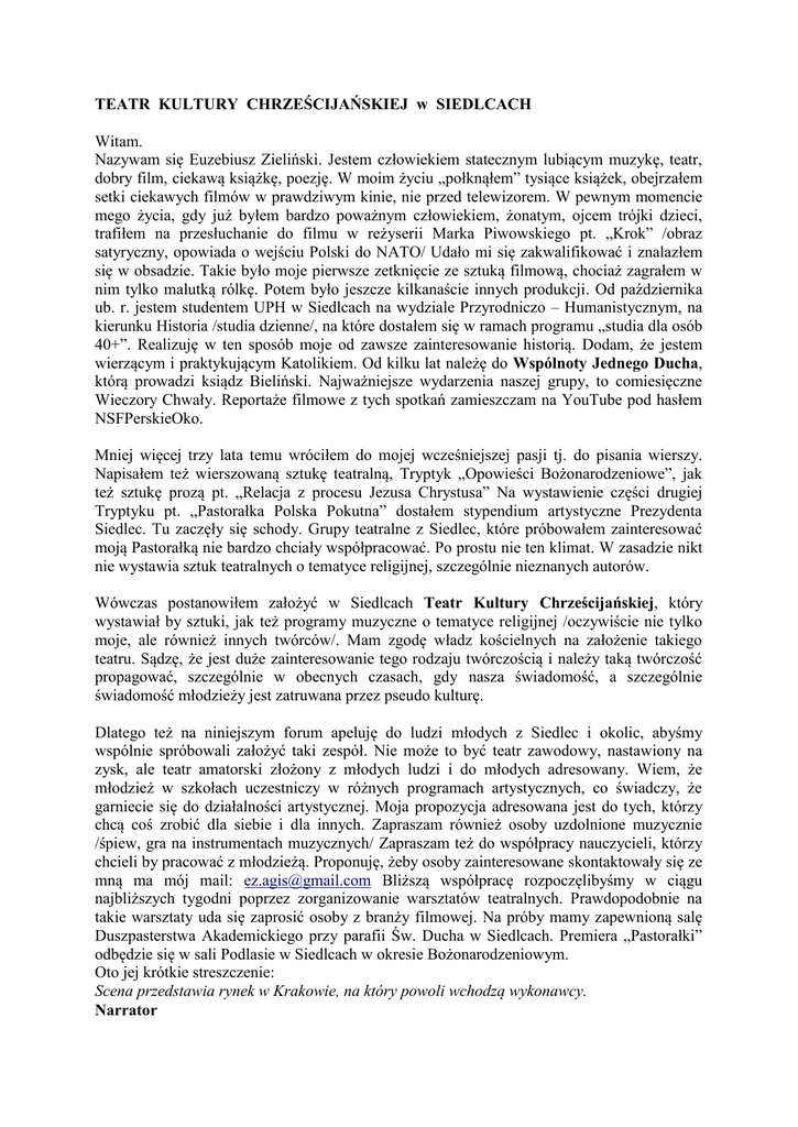 TEATR KULTURY CHRZEŚCIJAŃSKIEJ w SIEDLCACH Witam. Nazywam się Euzebiusz Zieliński. Jestem człowiekiem statecznym lubiącym muzykę, teatr, dobry film, ciekawą książkę, poezję. W moim życiu „połknąłem” tysiące książek, obejrzałem setki ciekawych filmów w prawdziwym kinie, nie przed telewizorem. W pewnym momencie mego życia, gdy już byłem bardzo poważnym człowiekiem, żonatym, ojcem trójki dzieci, trafiłem na przesłuchanie do filmu w reżyserii Marka Piwowskiego pt. „Krok” /obraz satyryczny, opowiada o wejściu Polski do NATO/ Udało mi się zakwalifikować i znalazłem się w obsadzie. Takie było moje pierwsze zetknięcie ze sztuką filmową, chociaż zagrałem w nim tylko malutką rólkę. Potem było jeszcze kilkanaście innych produkcji. Od października ub. r. jestem studentem UPH w Siedlcach na wydziale Przyrodniczo – Humanistycznym, na kierunku Historia /studia dzienne/, na które dostałem się w ramach programu „studia dla osób 40+”. Realizuję w ten sposób moje od zawsze zainteresowanie historią. Dodam, że jestem wierzącym i praktykującym Katolikiem. Od kilku lat należę do Wspólnoty Jednego Ducha, którą prowadzi ksiądz Bieliński. Najważniejsze wydarzenia naszej grupy, to comiesięczne Wieczory Chwały. Reportaże filmowe z tych spotkań zamieszczam na YouTube pod hasłem NSFPerskieOko. Mniej więcej trzy lata temu wróciłem do mojej wcześniejszej pasji tj. do pisania wierszy. Napisałem też wierszowaną sztukę teatralną, Tryptyk „Opowieści Bożonarodzeniowe”, jak też sztukę prozą pt. „Relacja z procesu Jezusa Chrystusa” Na wystawienie części drugiej Tryptyku pt. „Pastorałka Polska Pokutna” dostałem stypendium artystyczne Prezydenta Siedlec. Tu zaczęły się schody. Grupy teatralne z Siedlec, które próbowałem zainteresować moją Pastorałką nie bardzo chciały współpracować. Po prostu nie ten klimat. W zasadzie nikt nie wystawia sztuk teatralnych o tematyce religijnej, szczególnie nieznanych autorów. Wówczas postanowiłem założyć w Siedlcach Teatr Kultury Chrześcijańskiej, który wystawiał by sztuki, jak też programy muzyczne o tematyce religijnej /oczywiście nie tylko moje, ale również innych twórców/. Mam zgodę władz kościelnych na założenie takiego teatru. Sądzę, że jest duże zainteresowanie tego rodzaju twórczością i należy taką twórczość propagować, szczególnie w obecnych czasach, gdy nasza świadomość, a szczególnie świadomość młodzieży jest zatruwana przez pseudo kulturę. Dlatego też na niniejszym forum apeluję do ludzi młodych z Siedlec i okolic, abyśmy wspólnie spróbowali założyć taki zespół. Nie może to być teatr zawodowy, nastawiony na zysk, ale teatr amatorski złożony z młodych ludzi i do młodych adresowany. Wiem, że młodzież w szkołach uczestniczy w różnych programach artystycznych, co świadczy, że garniecie się do działalności artystycznej. Moja propozycja adresowana jest do tych, którzy chcą coś zrobić dla siebie i dla innych. Zapraszam również osoby uzdolnione muzycznie /śpiew, gra na instrumentach muzycznych/ Zapraszam też do współpracy nauczycieli, którzy chcieli by pracować z młodzieżą. Proponuję, żeby osoby zainteresowane skontaktowały się ze mną ma mój mail: [email protected] Bliższą współpracę rozpoczęlibyśmy w ciągu najbliższych tygodni poprzez zorganizowanie warsztatów teatralnych. Prawdopodobnie na takie warsztaty uda się zaprosić osoby z branży filmowej. Na próby mamy zapewnioną salę Duszpasterstwa Akademickiego przy parafii Św. Ducha w Siedlcach. Premiera „Pastorałki” odbędzie się w sali Podlasie w Siedlcach w okresie Bożonarodzeniowym. Oto jej krótkie streszczenie: Scena przedstawia rynek w Krakowie, na który powoli wchodzą wykonawcy. Narrator Na krakowskim rynku lud się zebrał mnogi, przybyli heroldy, grzmią trąby i rogi. Słychać głos trąb i rogów. Wchodzą dwaj heroldowie. Herold pierwszy Zbierzcie się tu wszyscy słuchać się wam godzi, bo hen tam w Betlejem Bóg się dla was rodzi. Herold drugi Dziś na świat przychodzi, wielkie to zdarzenie, by dać wszystkim ludziom grzechów odpuszczenie. Herold pierwszy Pójdźcie więc z pokłonem zostać się nie godzi, niech w drogę ruszają i starzy i młodzi. Po tym wezwaniu do Betlejem wyruszają pielgrzymi na czele z Królem. Po przybyciu na miejsce oddają hołd dzieciątku i składają dary. Wówczas ukazuje im się Anioł, który mówi. Anioł Ja jestem aniołem od Boga posłany, czas nawrócenia jest wam dzisiaj dany. Żadnych ziemskich darów, dzisiaj nie składajcie, lecz pokornie i szczerze grzechy swe wyznajcie. Wyznajcie je wszystkie i stare i nowe, a wyznajcie także wady narodowe. Następuje wyznanie grzechów i wyrażenie żalu poprzez śpiew pieśni „Panie przebacz nam”. Po tej pieśni głos ponownie zabiera Anioł. Odpuszczone są już grzechy tym co skruchę czują, niechaj wstaną teraz wszyscy niechaj wszyscy się radują. Wszyscy powoli wstają, odwracają się w stronę widowni i śpiewają wraz z chórem kolędę „Serca ludzkie się radują”. Oczywiście jest to bardzo duży skrót. Z całym tekstem chętni zapoznają się podczas prób. Chciałbym też później, w okresie wielkanocnym wystawić moją sztukę napisaną prozą pt. „Relacja z procesu Jezusa Chrystusa” Jest to opis Drogi Krzyżowej przedstawiony w formie reportażu telewizyjnego z udziałem publiczności. Chętnych do współpracy zapraszam bardzo serdecznie. Sądzę, że uda nam się razem stworzyć Teatr, jakiego jeszcze nie było, nie tylko w Siedlcach. Proszę abyście przekazali moją propozycję dalej do swoich znajomych. Do zobaczenia.