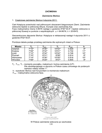 ZAĆMIENIA Zaćmienia Słońca 1. Częściowe zaćmienie Słońca 4 stycznia 2011. Cień Księżyca przechodzi nad północnymi obszarami biegunowymi Ziemi. Zaćmienie widoczne będzie w północnej Afryce, Europie oraz zachodniej Azji. Faza maksymalna równa 0.8576 nastąpi o godzinie 8 h50m34.9s i będzie widoczna w północnej Szwecji w punkcie o współrzędnych ϕ = 64°40’N, λ = 20°04’E. Geocentryczne złączenie Słońca i Księżyca w rektascensji nastąpi 4 stycznia 2011 o godzinie 9h02m35.6s. Poniższa tabela podaje przebieg zaćmienia dla wybranych miast w Polsce: Miasto Gdańsk Kraków Łódź Poznań Warszawa Wrocław Tp 7 15m 7h09m 7h12m 7h10m 7h14m 7h08m h Tmax 8h36m 8h32m 8h34m 8h31m 8h36m 8h29m Tk 10h02m 10h01m 10h02m 9h58m 10h05m 9h57m Fmax 0.829 0.732 0.746 0.814 0.818 0.805 h 8º 11º 10º 8º 10º 9º Tp , Tmax, Tk - momenty początku, maksimum i końca zaćmienia (UT) Dla obowiązującego w styczniu w Polsce czasu zimowego do podanych wartości należy dodać 1h. h - wysokość Słońca nad horyzontem w momencie maksimum Fmax - maksymalna widoczna faza. W Polsce zaćmienie widoczne po wschodzie 130 2. Częściowe zaćmienie Słońca 1 czerwca 2011. Cień Księżyca przechodzi nad północnymi obszarami biegunowymi Ziemi. Zaćmienie widoczne będzie we wschodniej Azji, w północnej części Ameryki Północnej, na Grenlandii oraz na całym obszarze Oceanu Lodowatego. Faza maksymalna równa 0.6011 nastąpi o godzinie 21 h16m11.1s i będzie widoczna na arktycznym wybrzeżu zachodniej Syberii w punkcie o współrzędnych ϕ = 67°58’N, λ = 46°01’E. Geocentryczne złączenie Słońca i Księżyca w rektascensji nastąpi 1 czerwca 2011 o godzinie 21h02m35.5s. W Polsce zaćmienie niewidoczne 3. Częściowe zaćmienie Słońca 1 lipca 2011. Cień Księżyca przechodzi pod południowymi obszarami biegunowymi Ziemi. Zaćmienie widoczne będzie na Oceanie Antarktycznym na południe od Afryki. Faza maksymalna równa 0.0971 nastąpi o godzinie 8 h38m22.7s i będzie widoczna u wybrzeży Antarktydy w punkcie o współrzędnych ϕ = 64°26’S, λ = 25°42’E. Geocentryczne złączenie Słońca i Księżyca w rektascensji nastąpi 1 lipca 2011 o godzinie 8h53m54.2s. 131 W Polsce zaćmienie niewidoczne 4. Częściowe zaćmienie Słońca 25 listopada 2011. Cień Księżyca przechodzi pod południowymi obszarami biegunowymi Ziemi. Zaćmienie widoczne na całym obszarze Antarktydy i Oceanu Antarktycznego, jak również na południowym cyplu Afryki oraz na Tasmanii i Nowej Zelandii. Faza maksymalna równa 0.9046 nastąpi o godzinie 6 h20m16.6s i będzie widoczna u wybrzeży Antarktydy w punkcie o współrzędnych ϕ = 68°48’S, λ = 81°17’W. Geocentryczne złączenie Słońca i Księżyca w rektascensji nastąpi 25 listopada 2011 o godzinie 6h09m39.5s. W Polsce zaćmienie niewidoczne 132 Zaćmienia Księżyca 1. Całkowite zaćmienie Księżyca 15 czerwca 2011. Zaćmienie widoczne we wschodniej Afryce, południowej Azji, na całym obszarze Oceanu Indyjskiego oraz na Antarktydzie; w Ameryce Południowej, na Atlantyku, w Europie oraz zachodniej Afryce przy wschodzie Księżyca, natomiast we wschodniej Azji, w Indonezji i w Australii przy zachodzie Księżyca. Przebieg zaćmienia (czas w UT): T Ak h m Początek zaćmienia półcieniowego: 17 25 115° Początek zaćmienia częściowego: 18h23m 125° h m Początek zaćmienia całkowitego: 19 22 137° h m Maksimum zaćmienia: 20 13 147° Koniec zaćmienia całkowitego: 21h03m 158° h m Koniec zaćmienia częściowego: 22 02 171° h m Koniec zaćmienia półcieniowego: 23 01 184° hk -11° -4° 3° 7° 11° 13° 14° (Azymut Ak (liczony od północy) i wysokość nad horyzontem hk podane dla Warszawy: λ = 21.0° E, ϕ = 52.2° N) Maksymalna faza zaćmienia całkowitego: 1.6998 Geocentryczna opozycja Słońca i Księżyca w rektascensji nastąpi 15 czerwca 2011 o godzinie 20h13m33.4s. W Polsce zaćmienie widoczne przy wschodzie Księżyca 133 2. Całkowite zaćmienie Księżyca 10 grudnia 2011. Zaćmienie widoczne we wschodniej Azji, w Indonezji, w Australii, na Alasce, na Grenlandii oraz w zachodniej części Oceanu Spokojnego; w Afryce, w Europie i w zachodniej Azji przy wschodzie Księżyca, natomiast Ameryce Północnej oraz we wschodniej części Oceanu Spokojnego przy zachodzie Księżyca. Przebieg zaćmienia (czas w UT): T Ak h m Początek zaćmienia półcieniowego: 11 33 17° Początek zaćmienia częściowego: 12h46m 33° h m Początek zaćmienia całkowitego: 14 06 49° h m Maksimum zaćmienia: 14 32 54° h m Koniec zaćmienia całkowitego: 14 57 58° Koniec zaćmienia częściowego: 16h18m 73° h m Koniec zaćmienia półcieniowego: 17 30 86° hk -15° -10° -2° 1° 4° 15° 25° (Azymut Ak (liczony od północy) i wysokość nad horyzontem hk podane dla Warszawy: λ = 21.0° E, ϕ = 52.2° N) Maksymalna faza zaćmienia całkowitego: 1.1061 Geocentryczna opozycja Słońca i Księżyca w rektascensji nastąpi 10 grudnia 2011 o godzinie 14h36m21.4s. W Polsce zaćmienie widoczne przy wschodzie Księżyca. 134